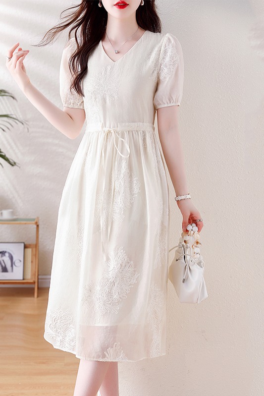 RY2716# 实拍2026夏季新款网纱绣花拼接减龄透气V领花边系带短袖连衣裙