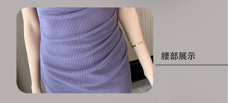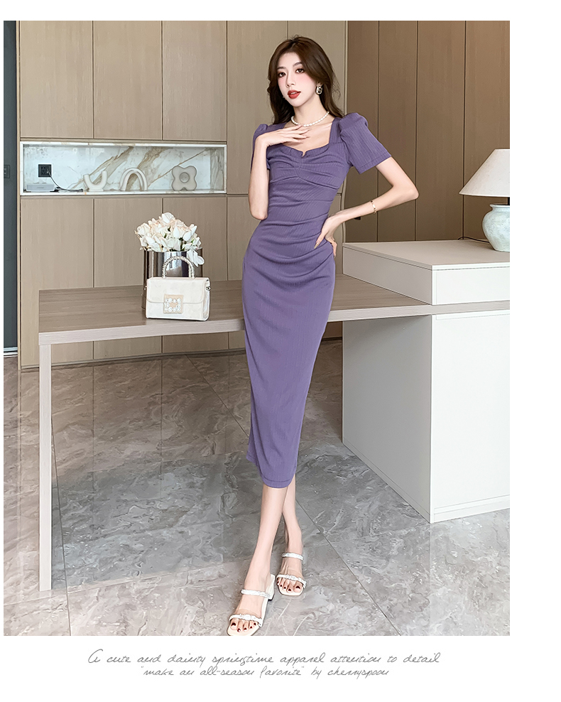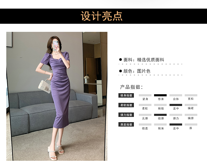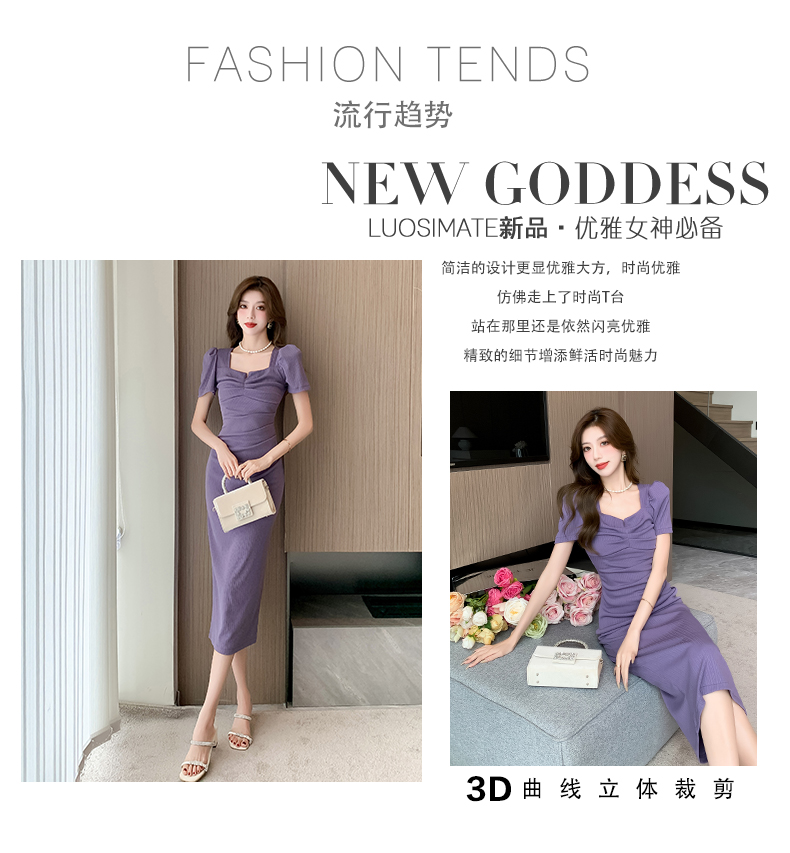 RY2738# 实拍视频2026夏新款方领短袖修身褶皱设计感显瘦纯色简约连衣长裙