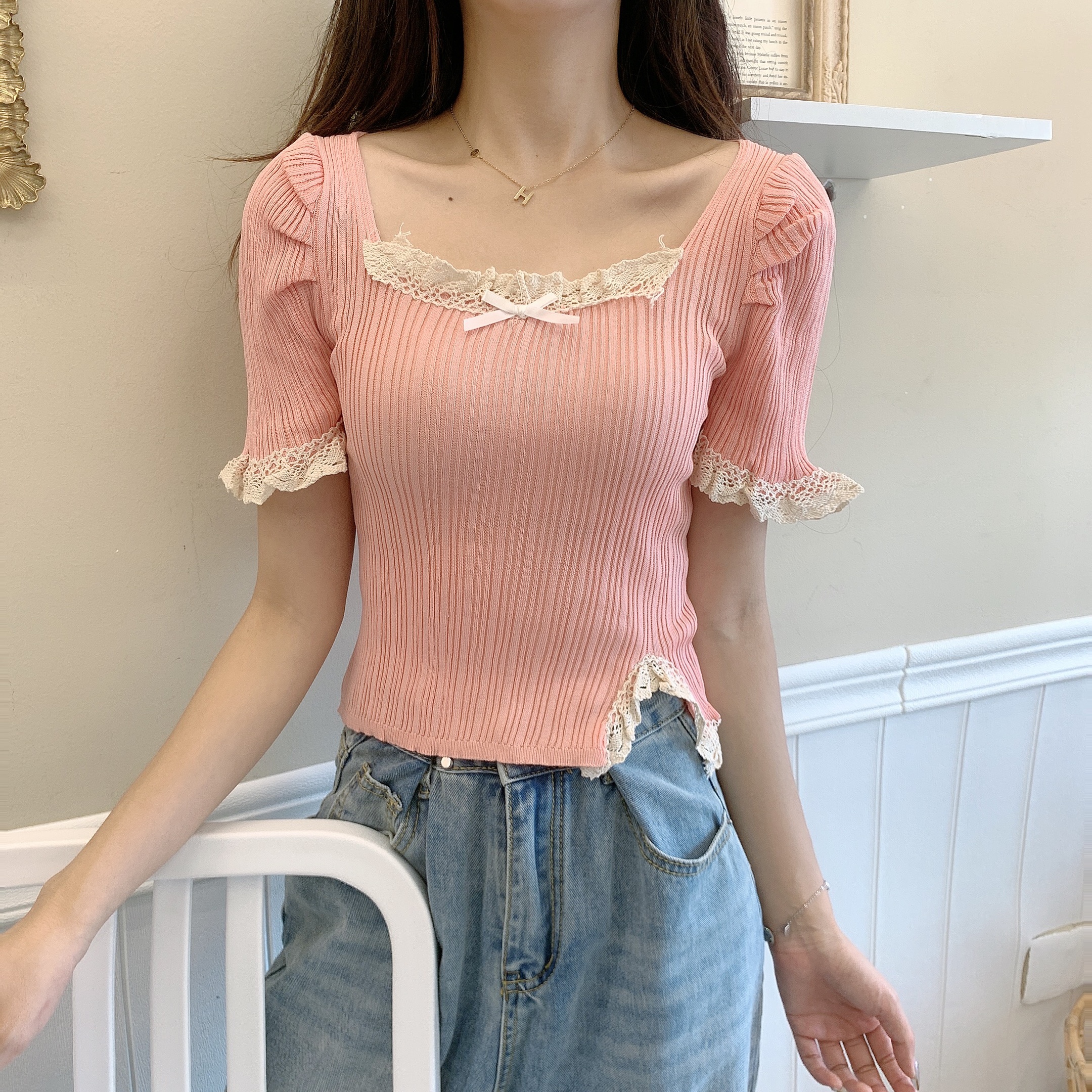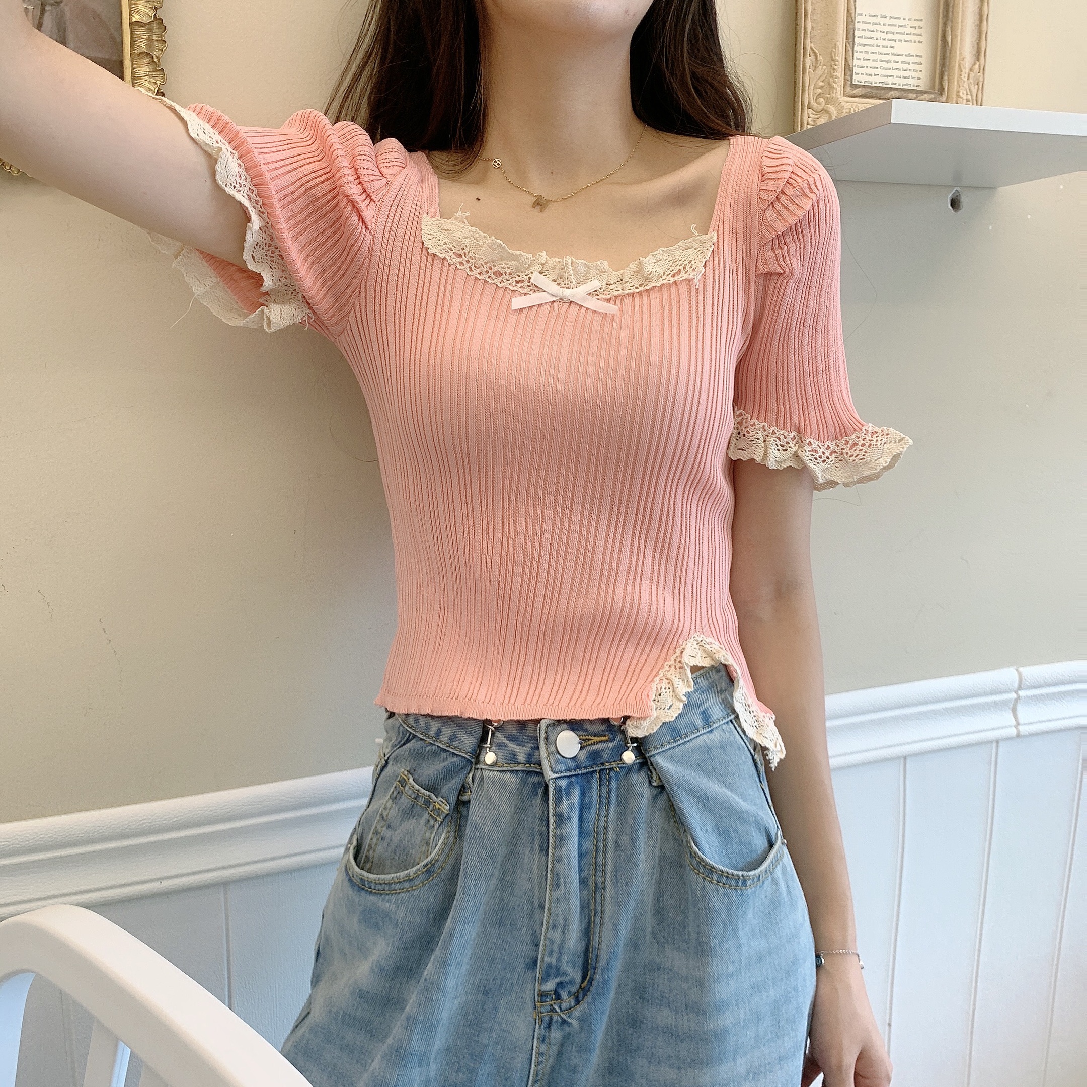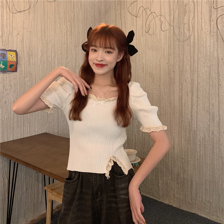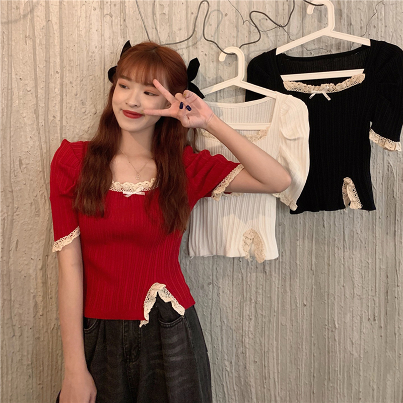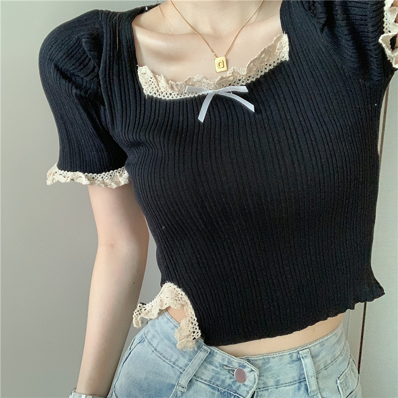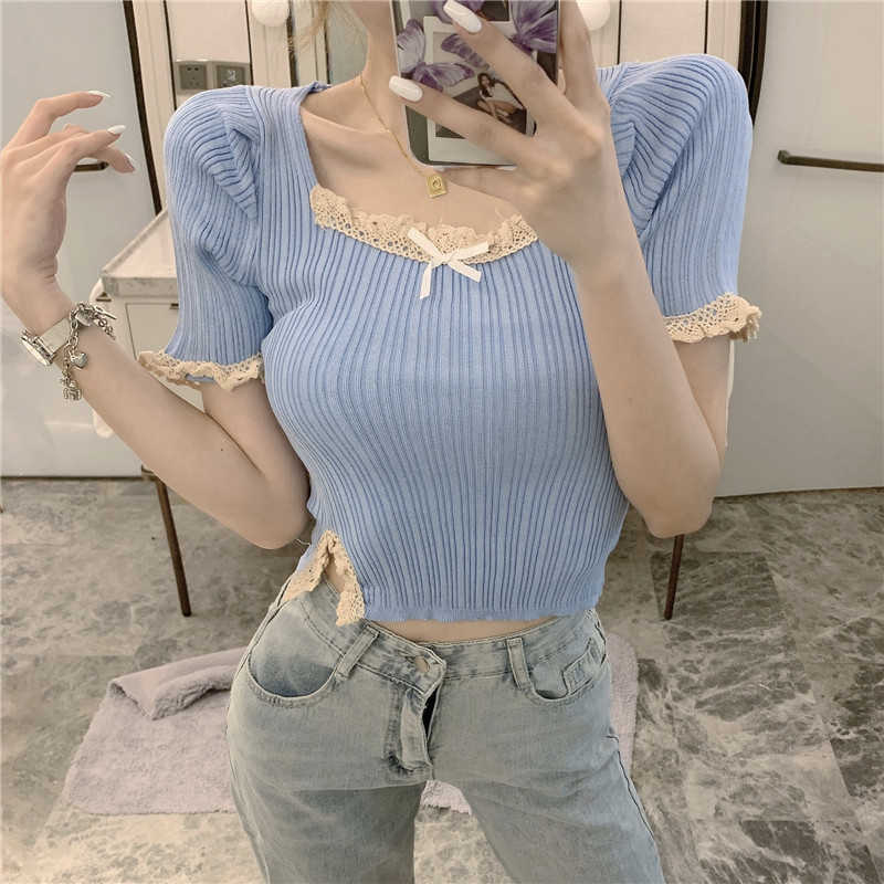 RM5115#港风气质短款高腰木耳边方领短袖针织衫上衣女设计感小众修身潮