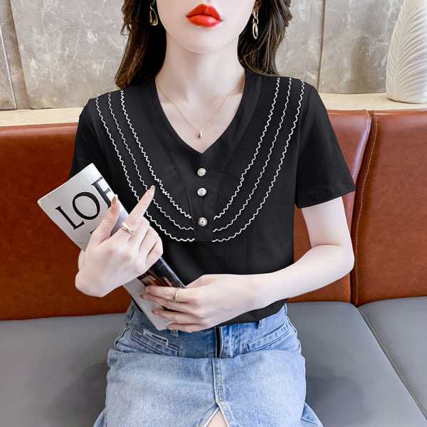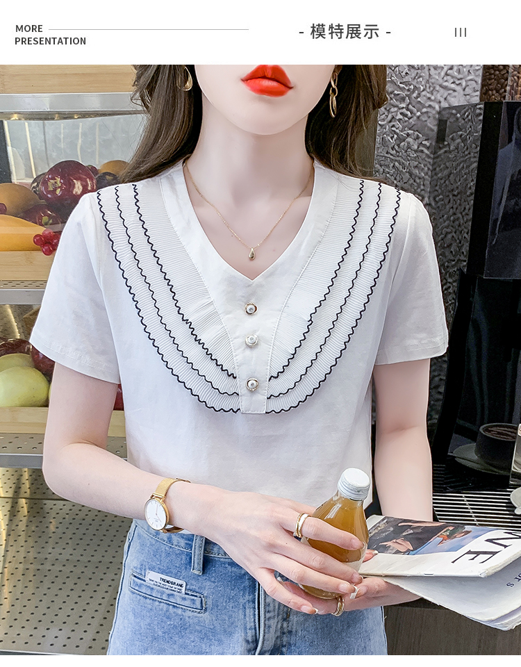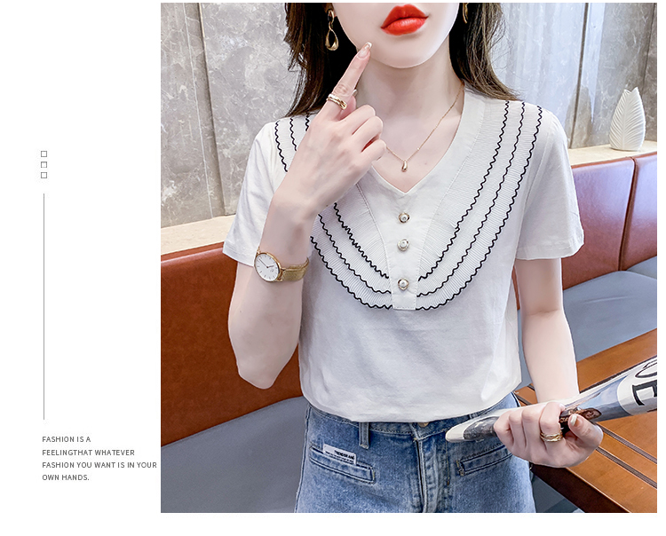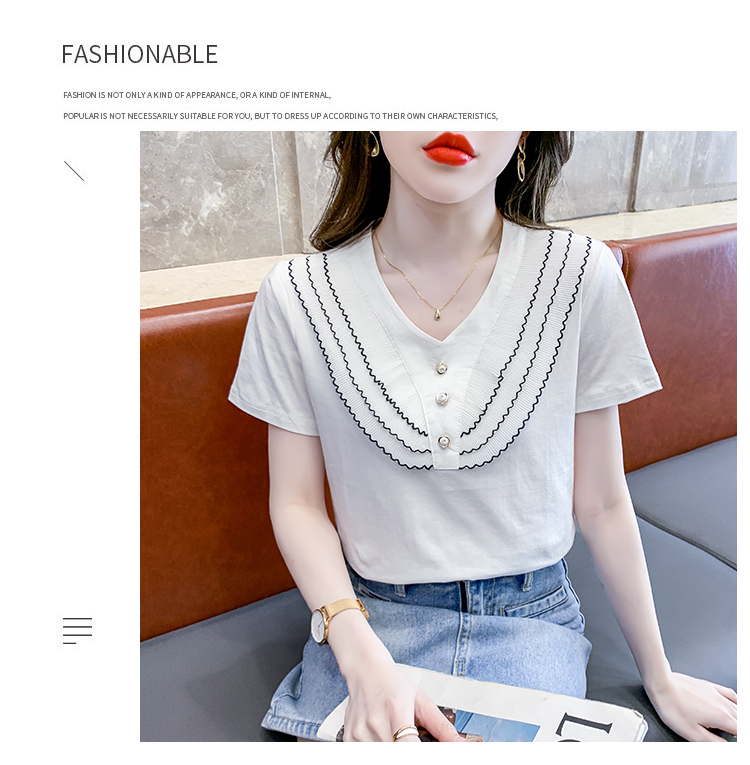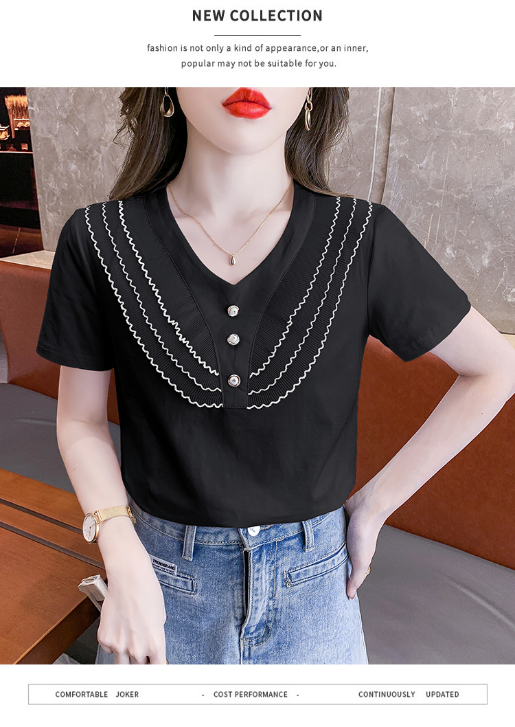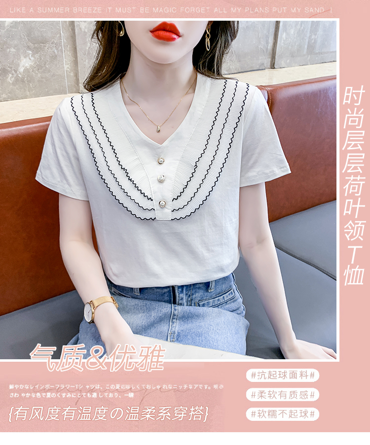 RM5187#时尚气质减龄百搭洋气v领蕾丝套头小衫短袖显瘦修身上衣简约