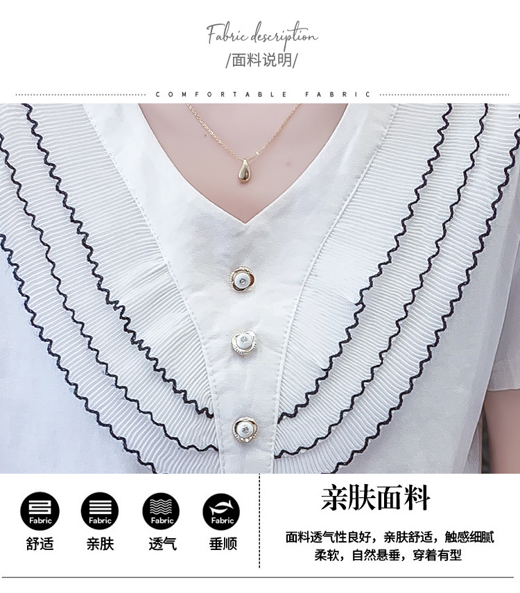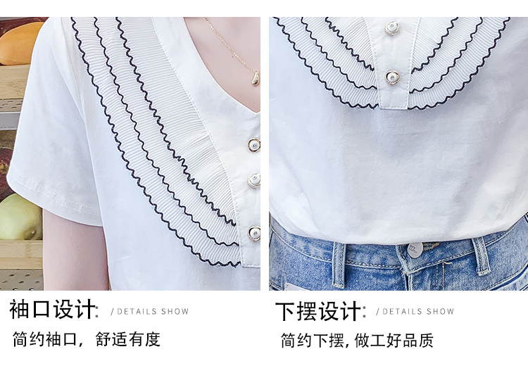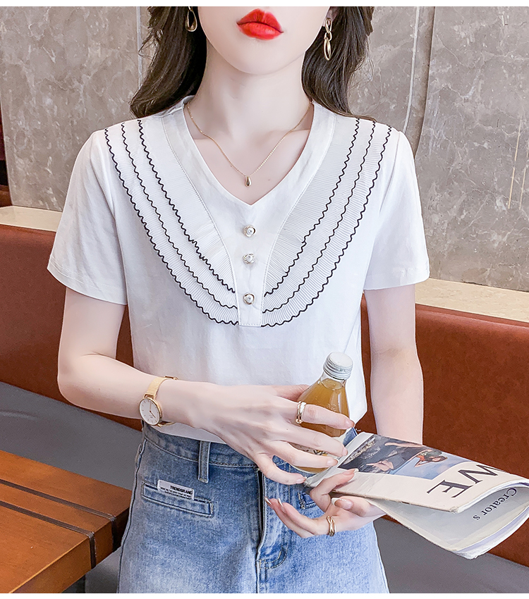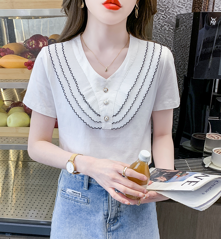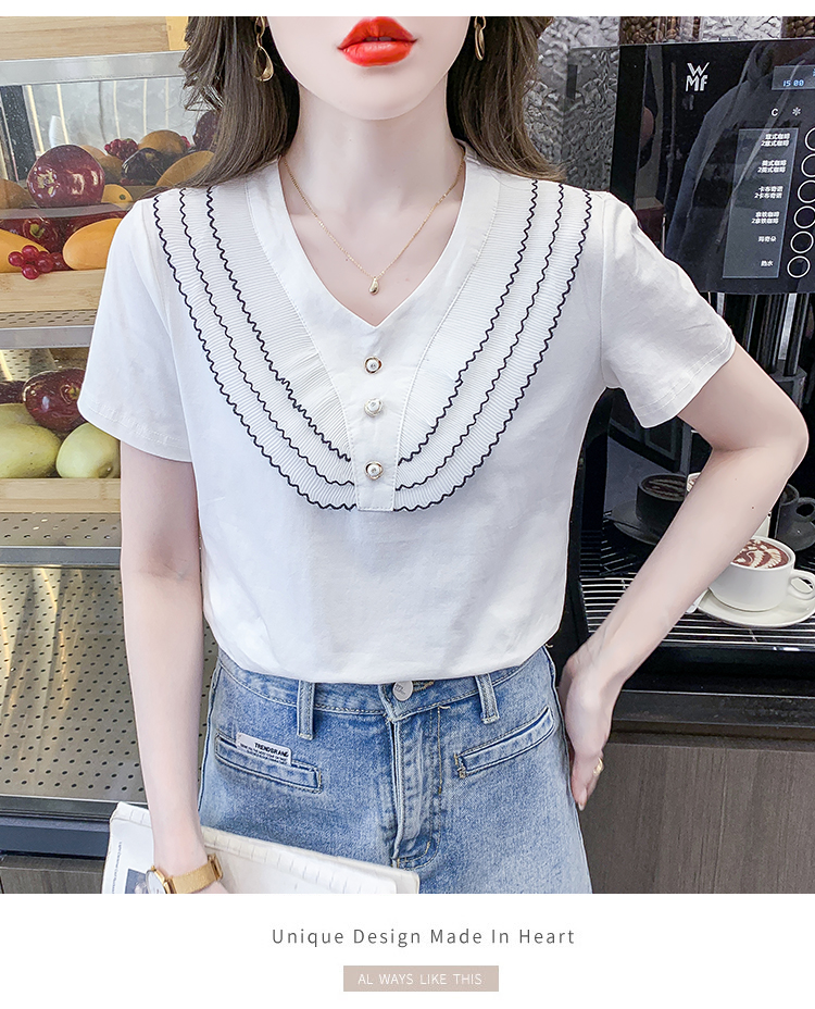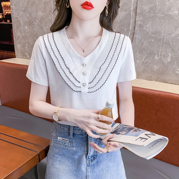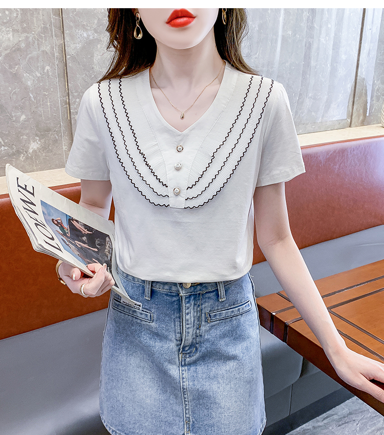 RM5187#时尚气质减龄百搭洋气v领蕾丝套头小衫短袖显瘦修身上衣简约