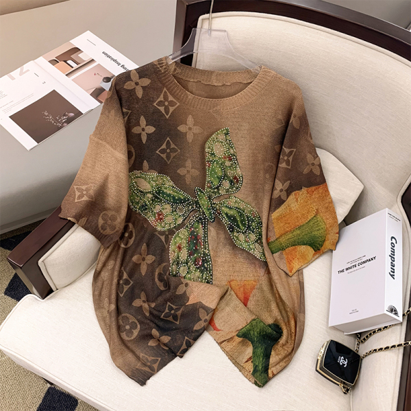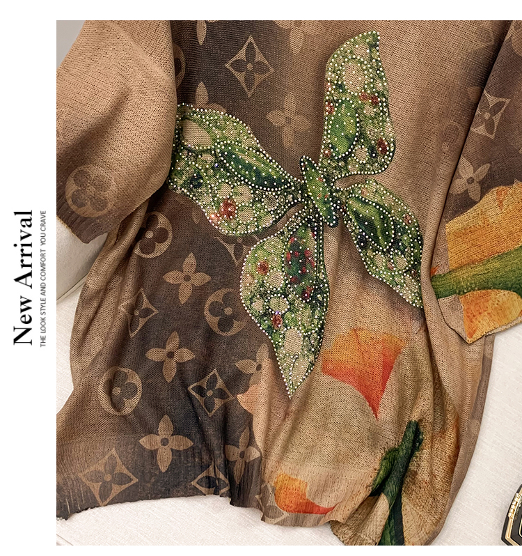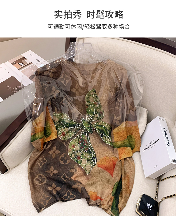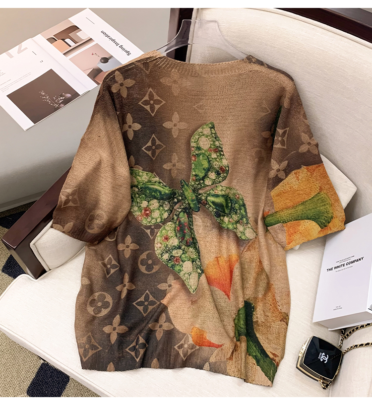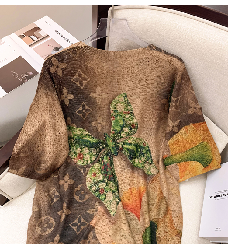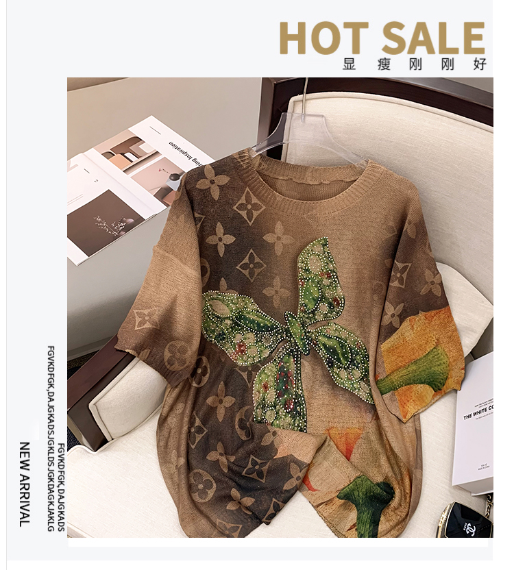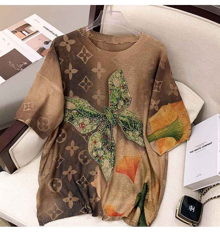 RM5204#夏季2023新款蝴蝶烫钻印花短袖薄款针织衫设计感复古大码上衣