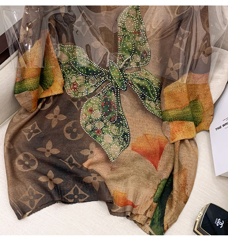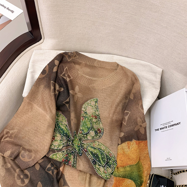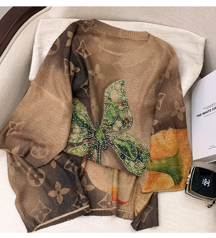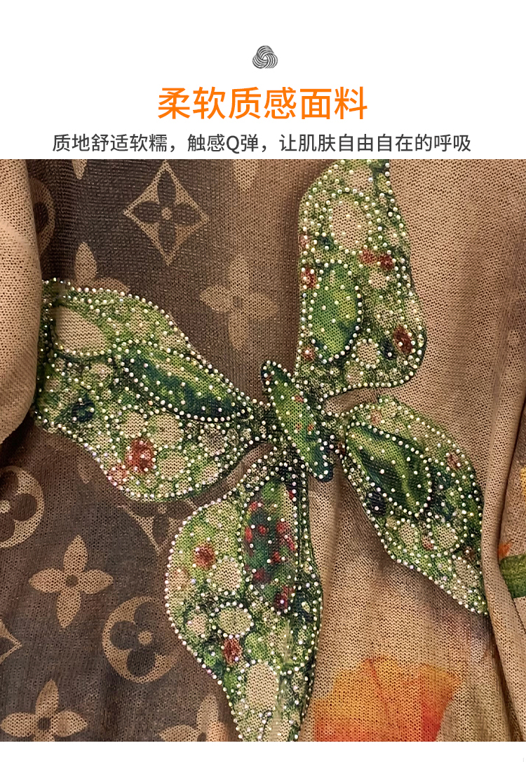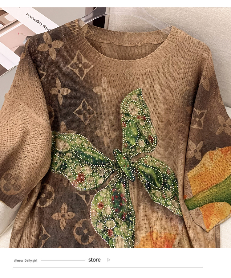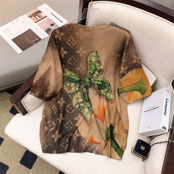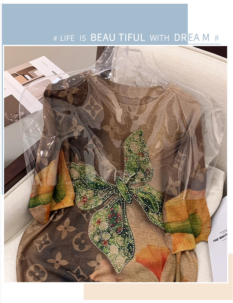 RM5204#夏季2023新款蝴蝶烫钻印花短袖薄款针织衫设计感复古大码上衣
