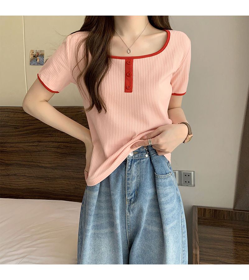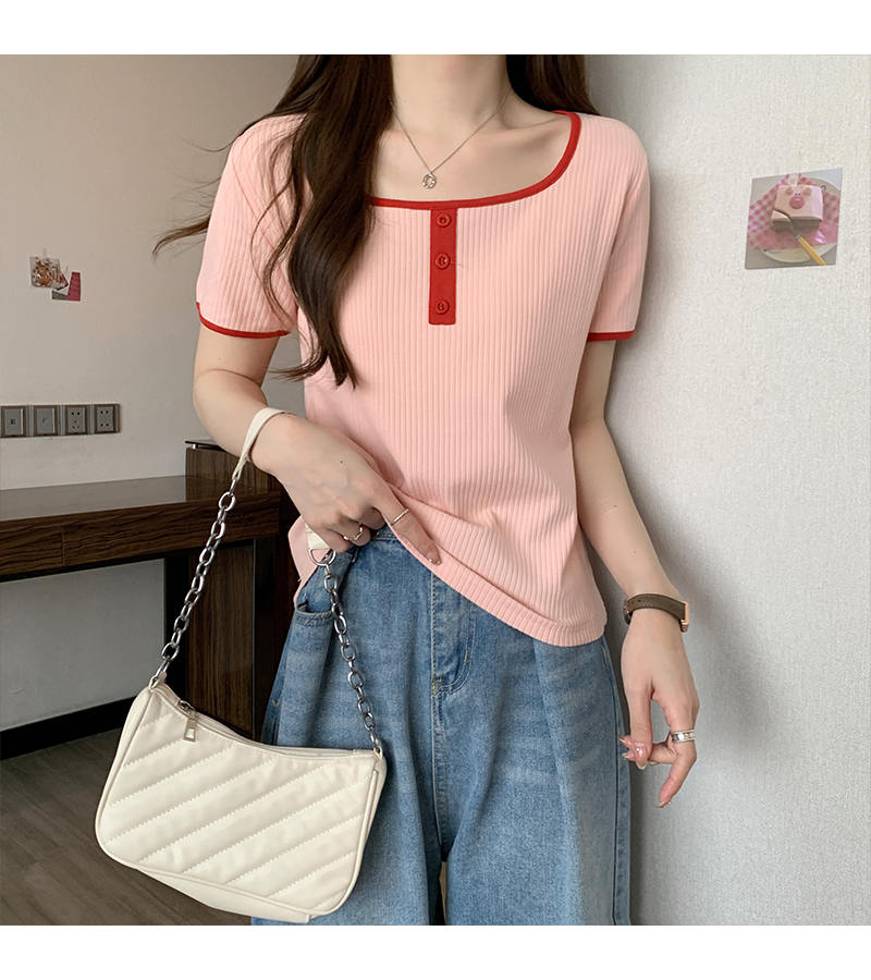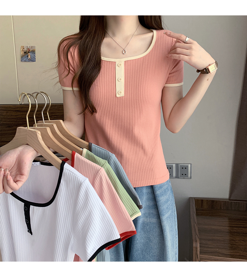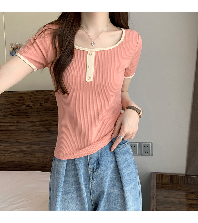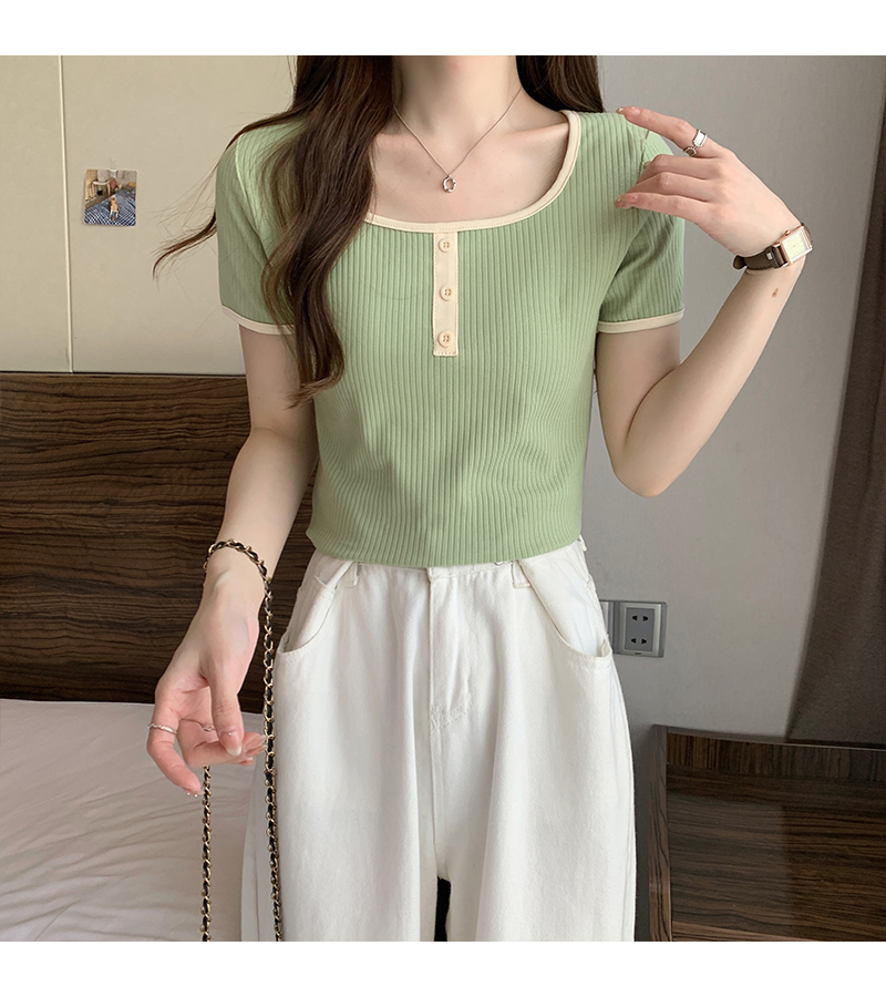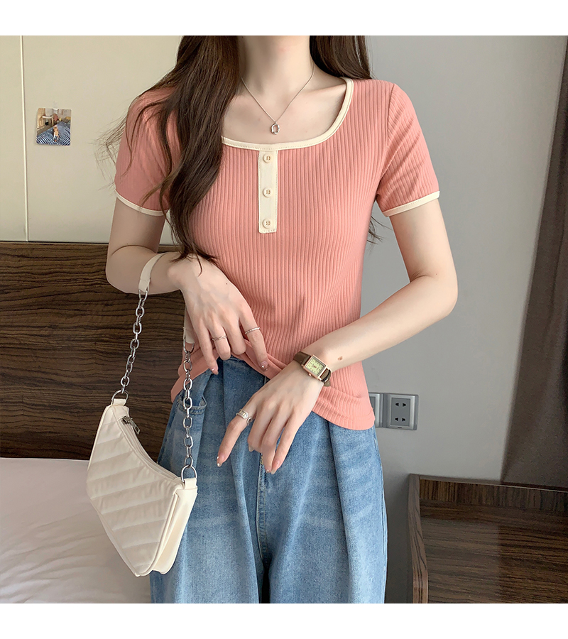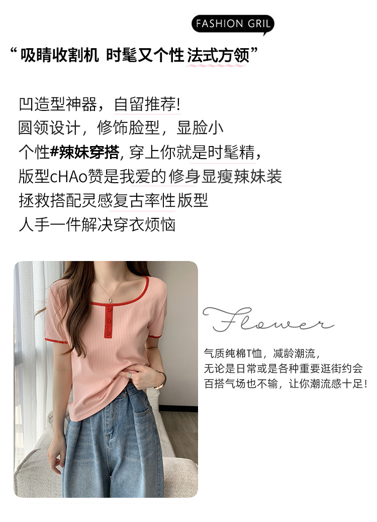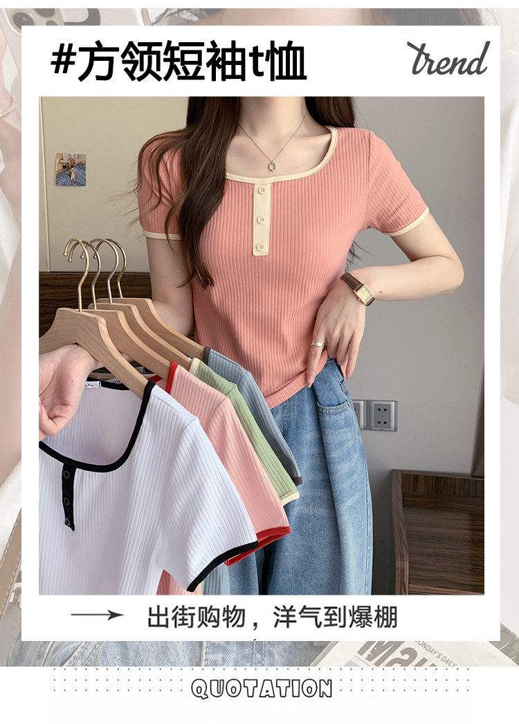 RM5354#方领短袖t恤女修身纯棉2023夏季新款正肩体恤设计感小众上衣