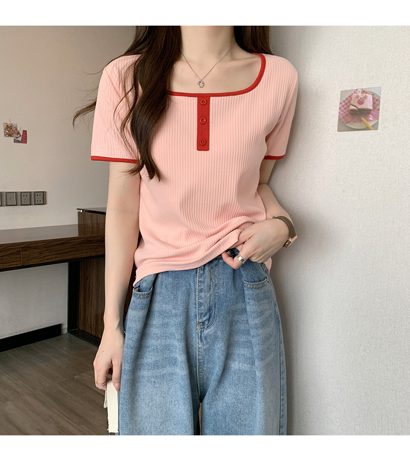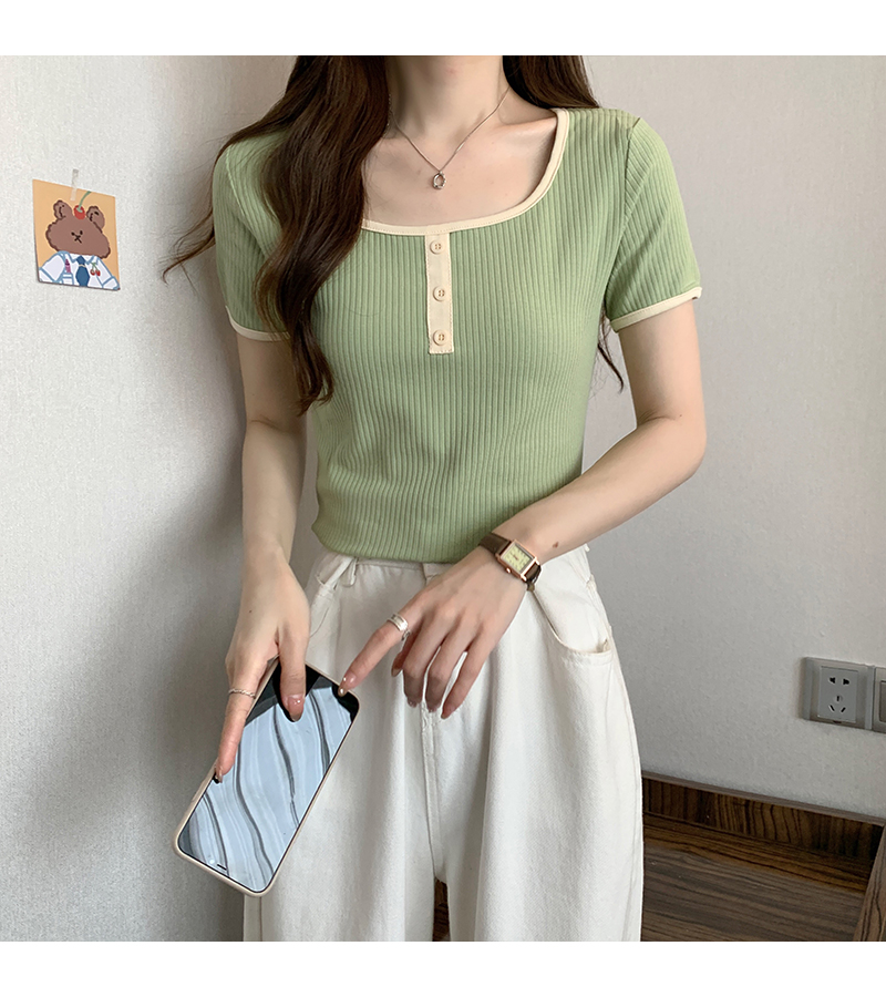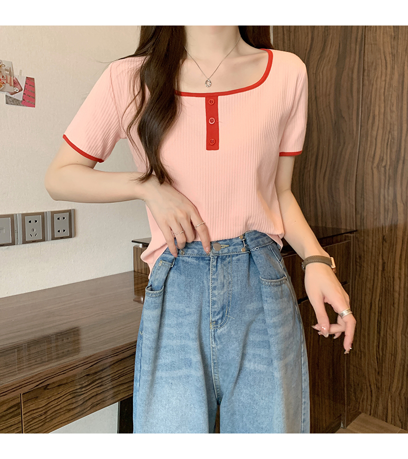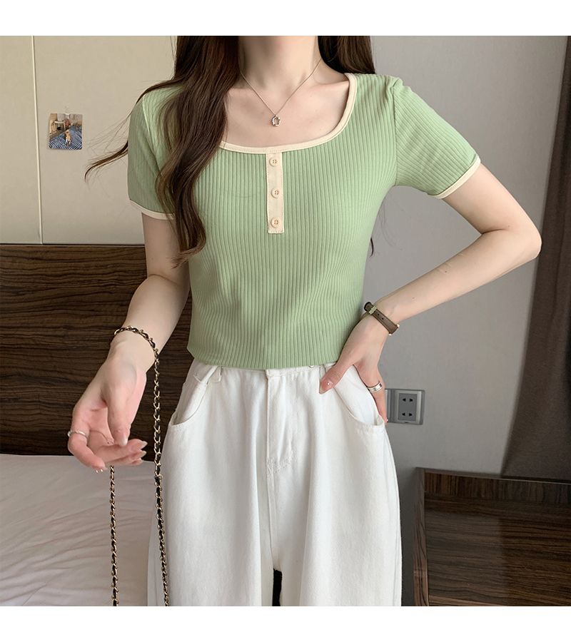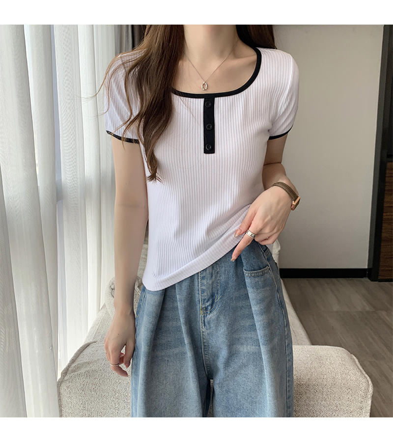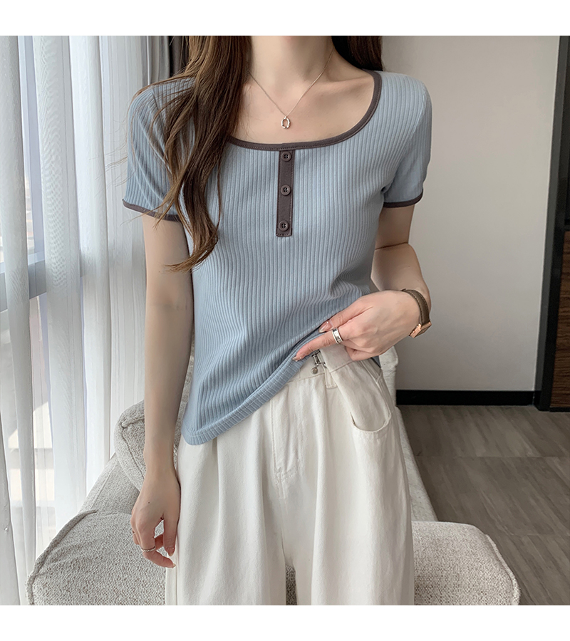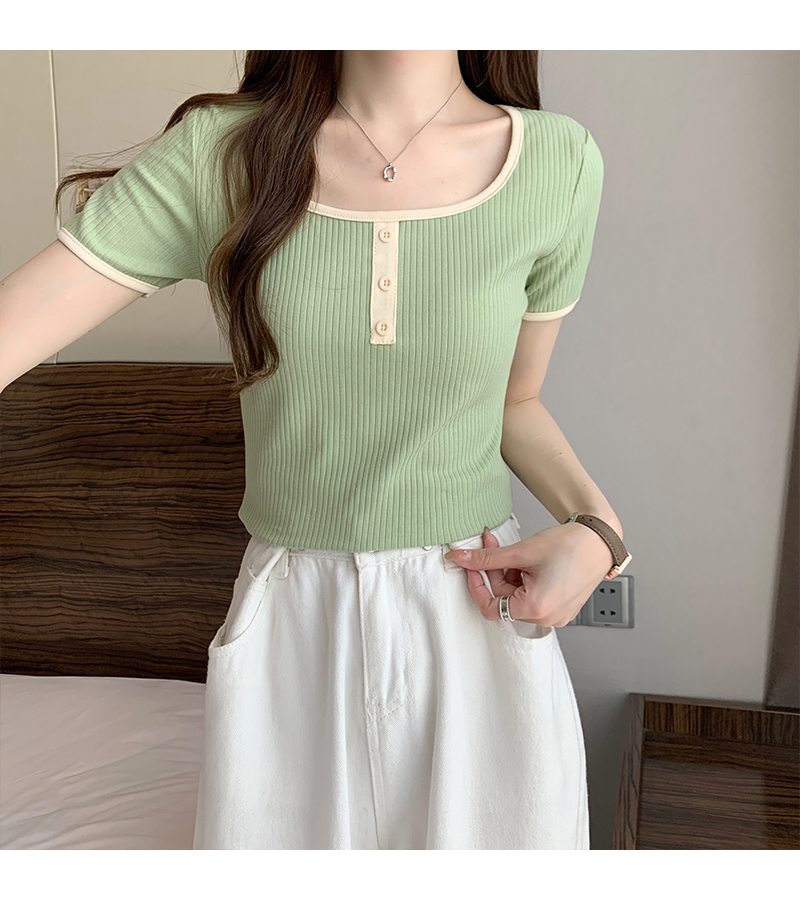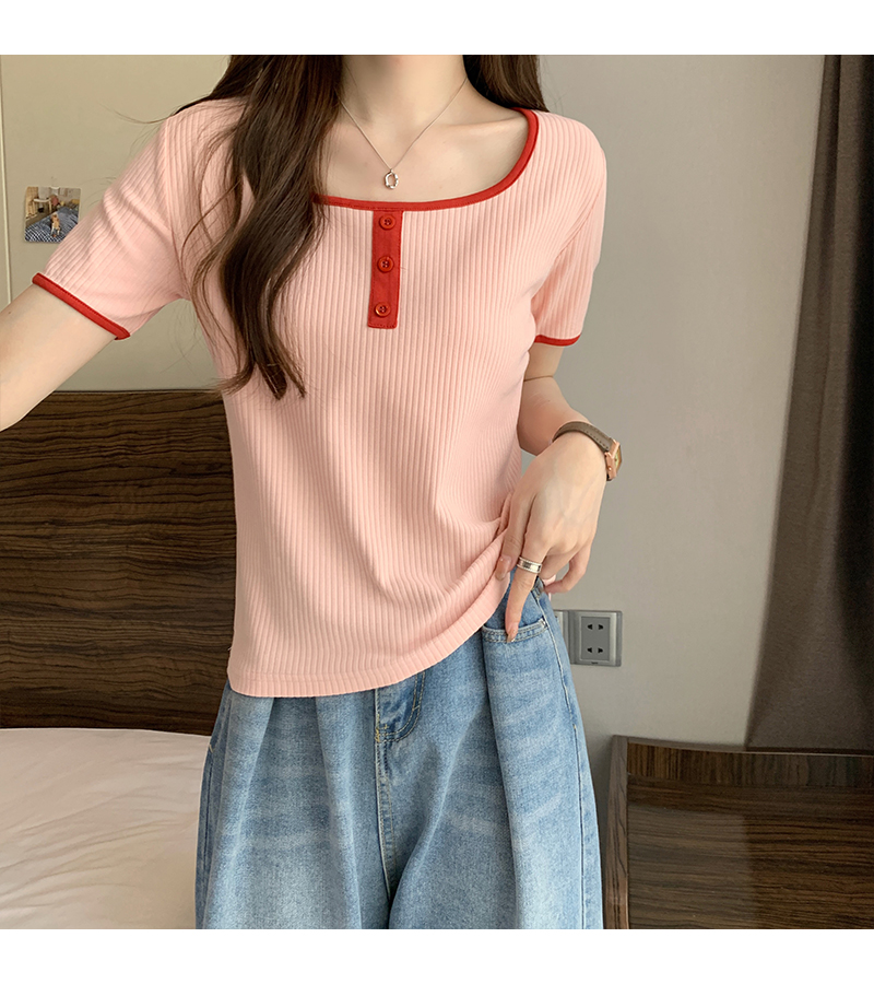 RM5354#方领短袖t恤女修身纯棉2023夏季新款正肩体恤设计感小众上衣