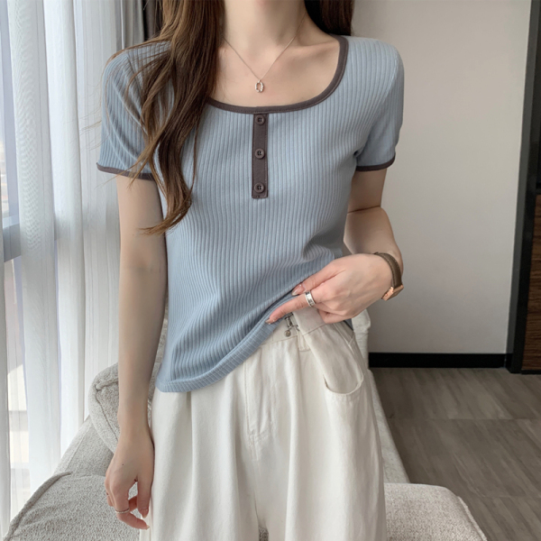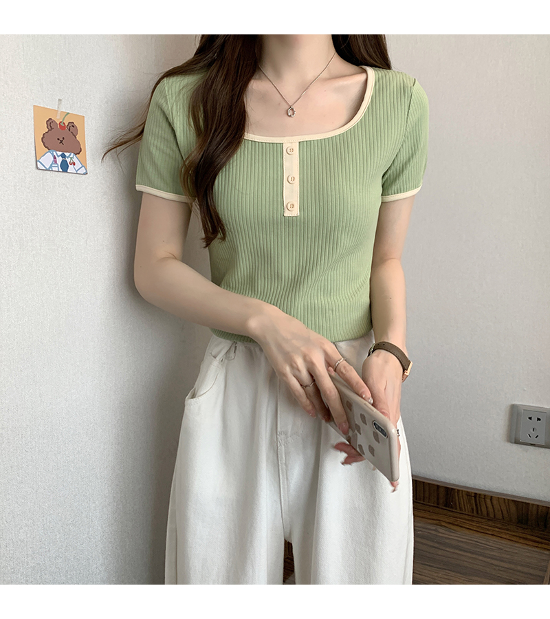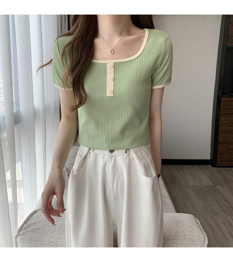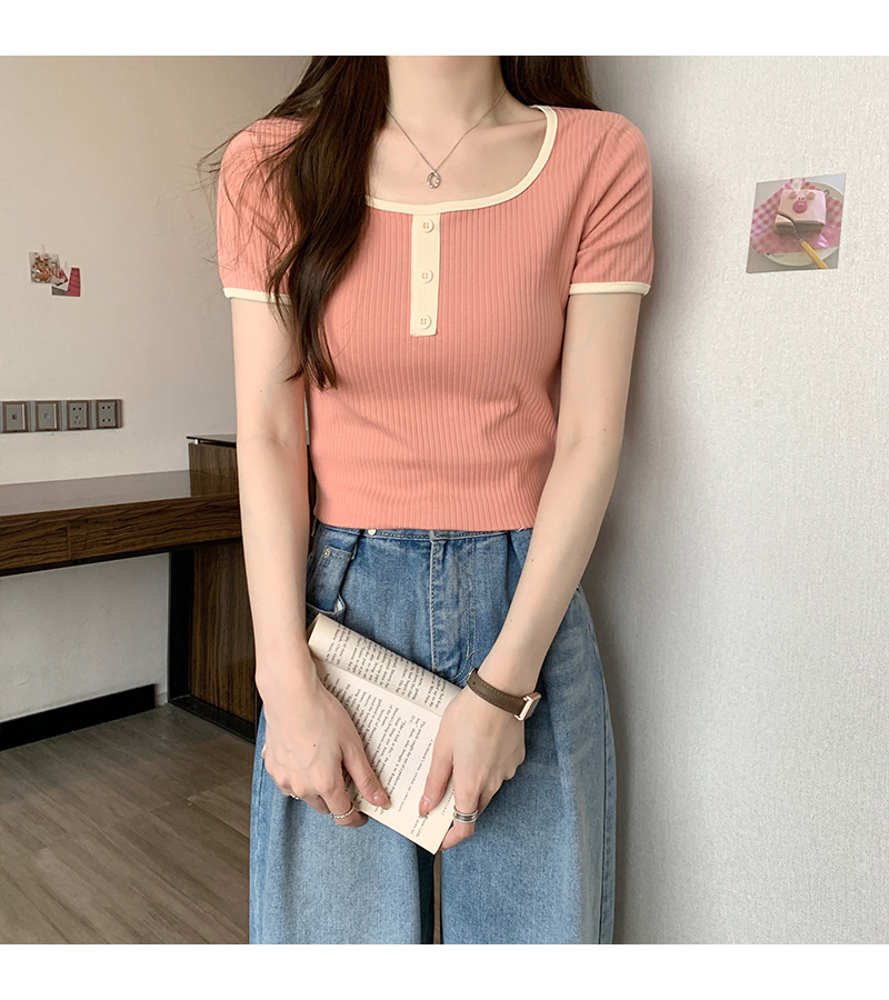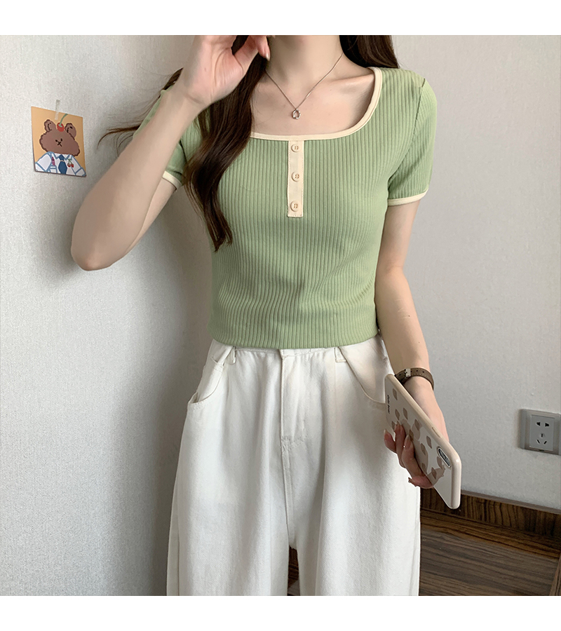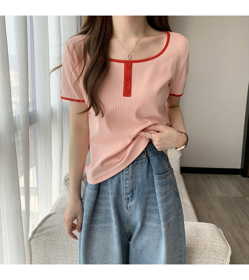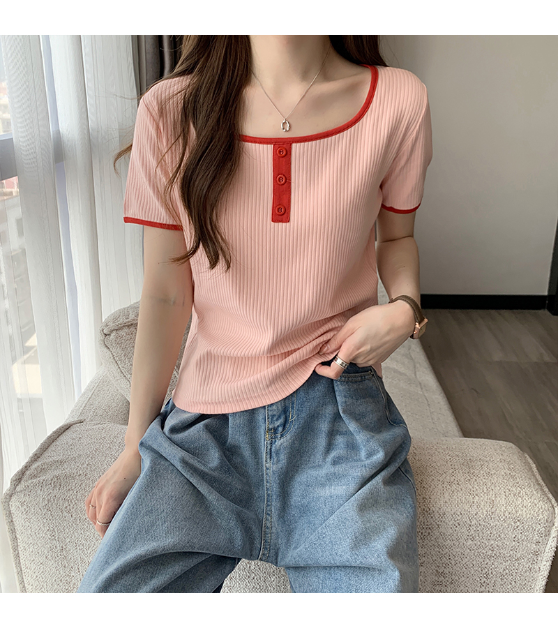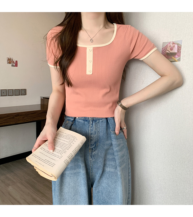 RM5354#方领短袖t恤女修身纯棉2023夏季新款正肩体恤设计感小众上衣
