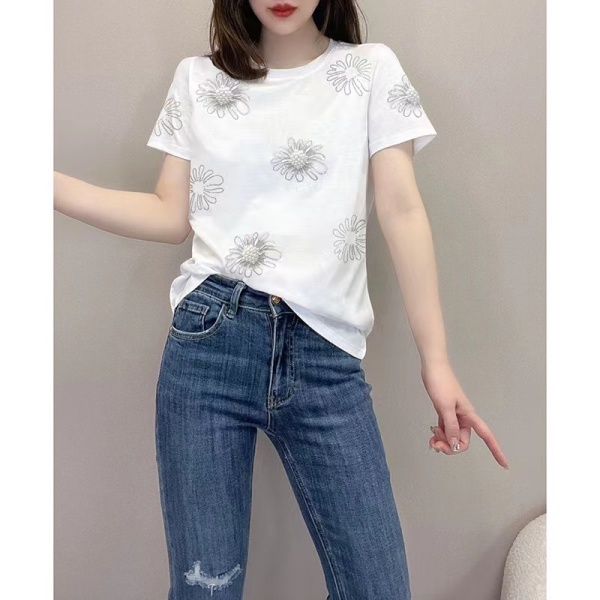 RM5373#洋气镶钻印花圆领短袖针织衫女夏季小众百搭休闲宽松显瘦套头上衣
