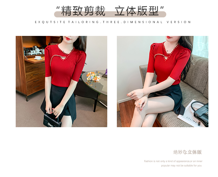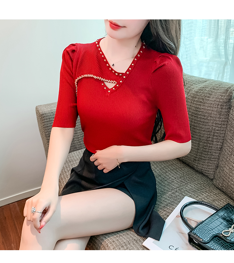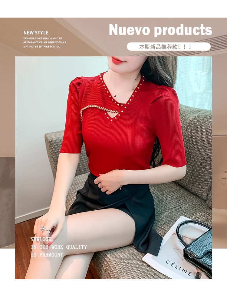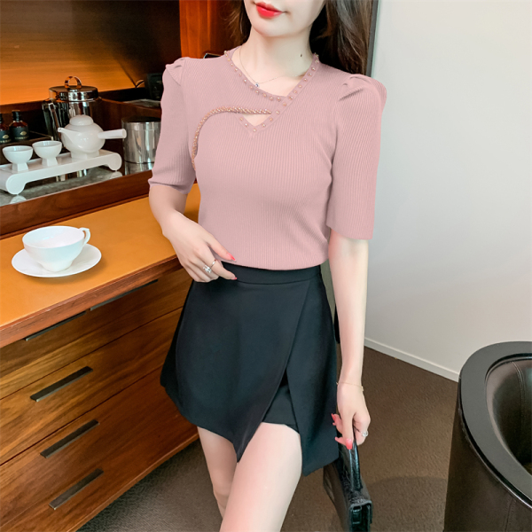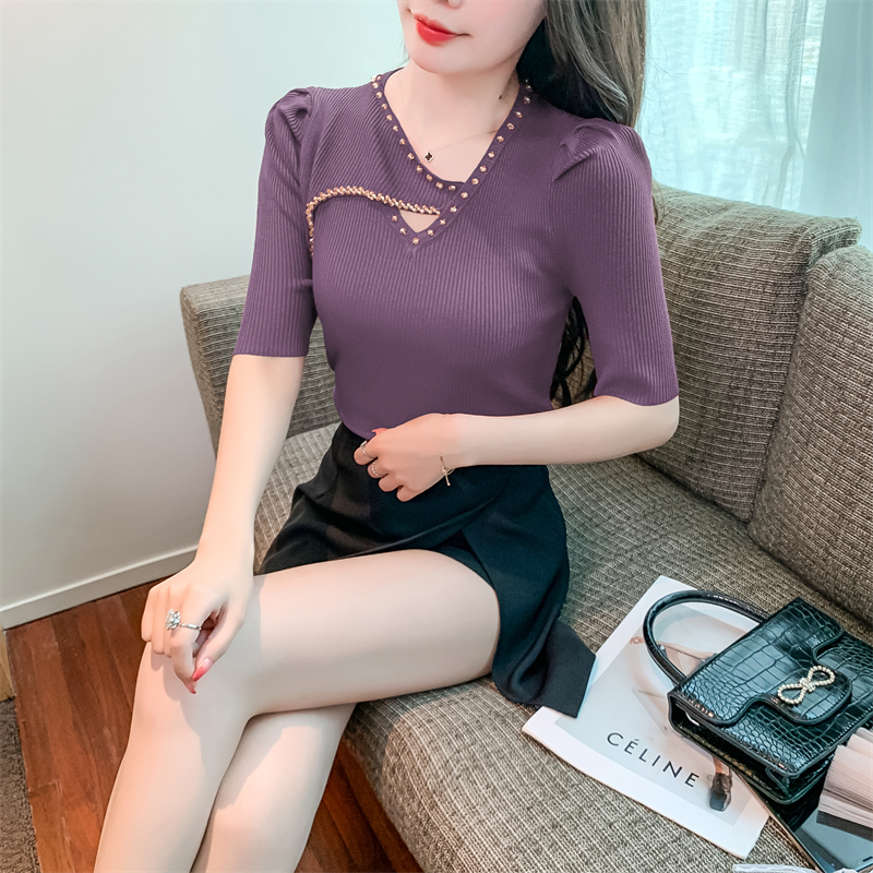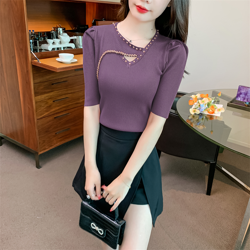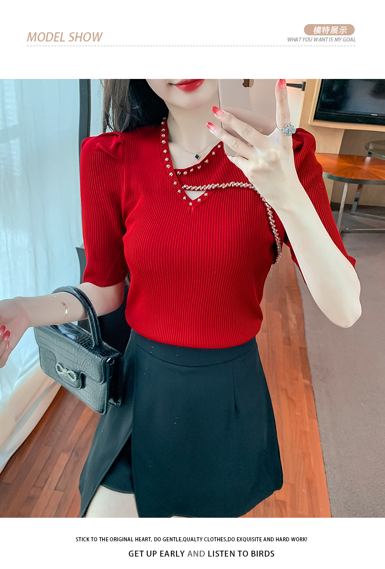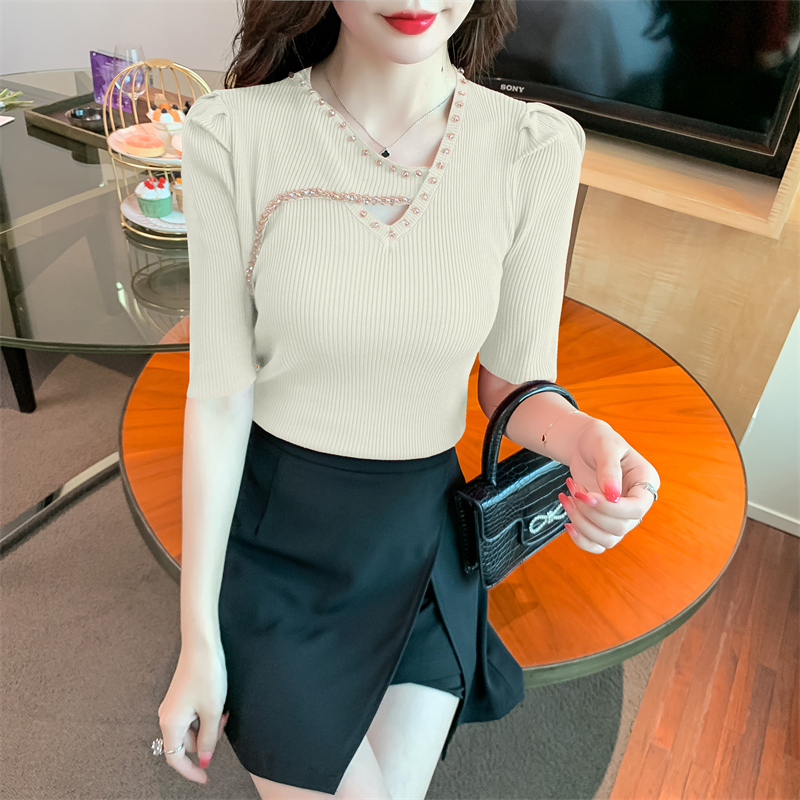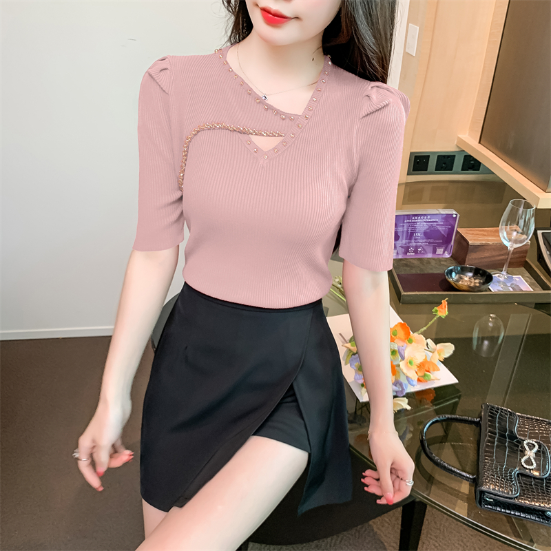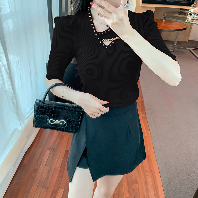 RM5395#新款重工钉钻修身泡泡袖圆领打底衫气质短袖针织上衣