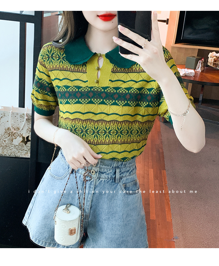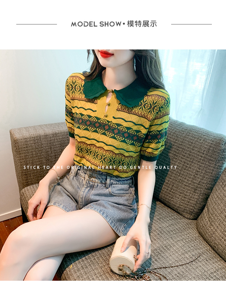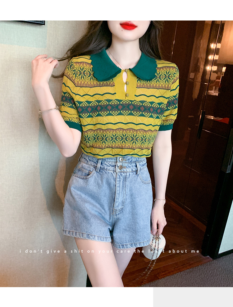 RM5491#夏季拼色条纹针织冰丝短袖t恤女夏款设计高级感上衣