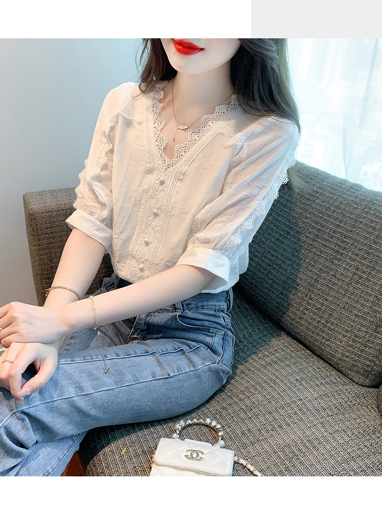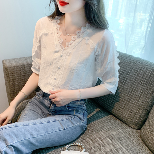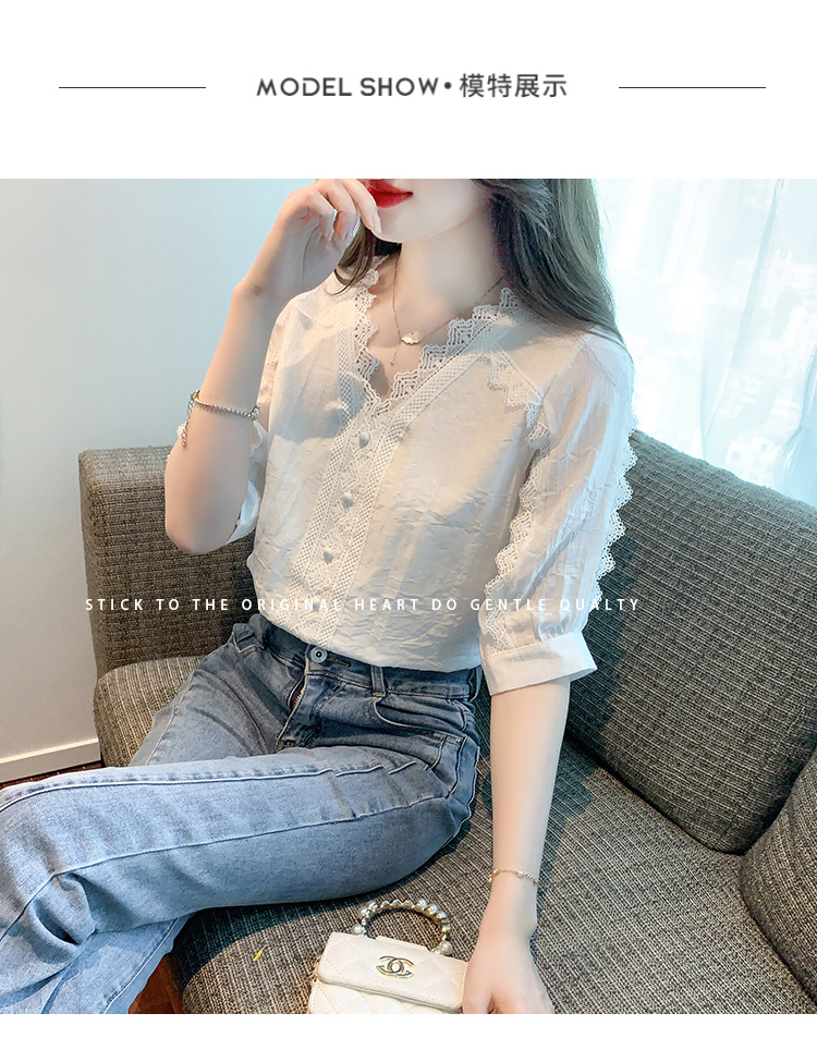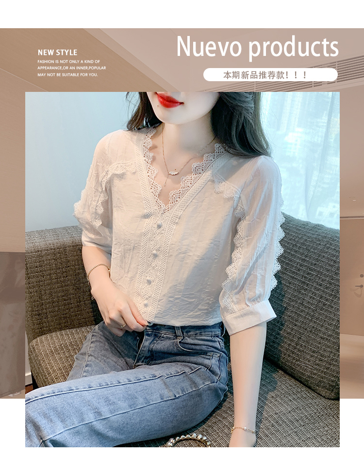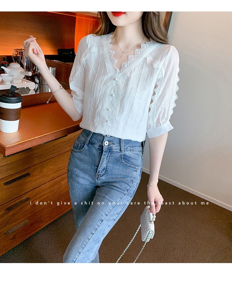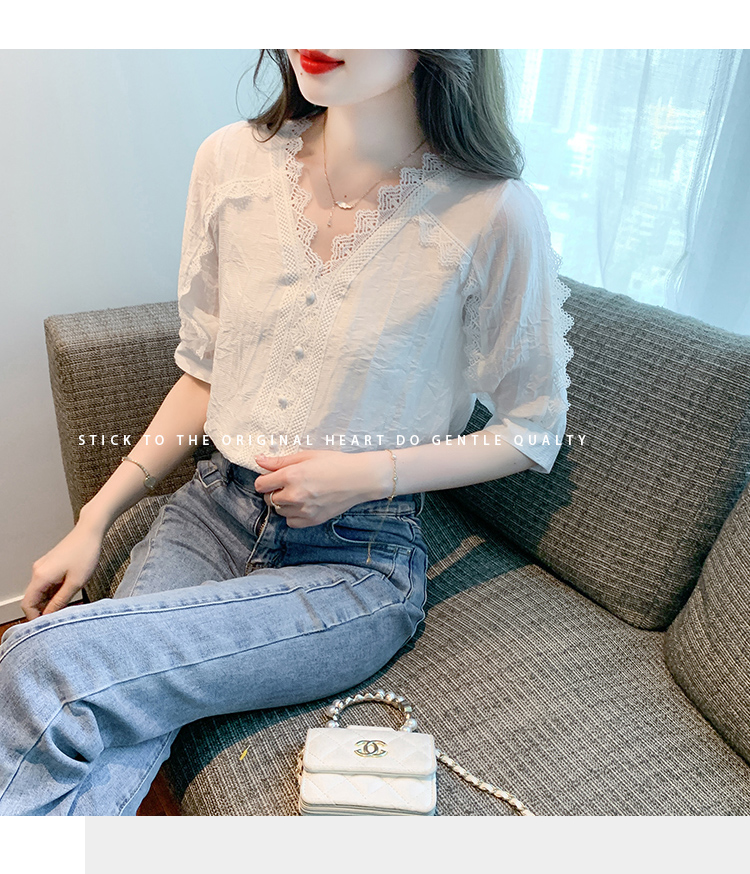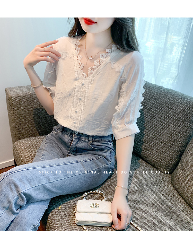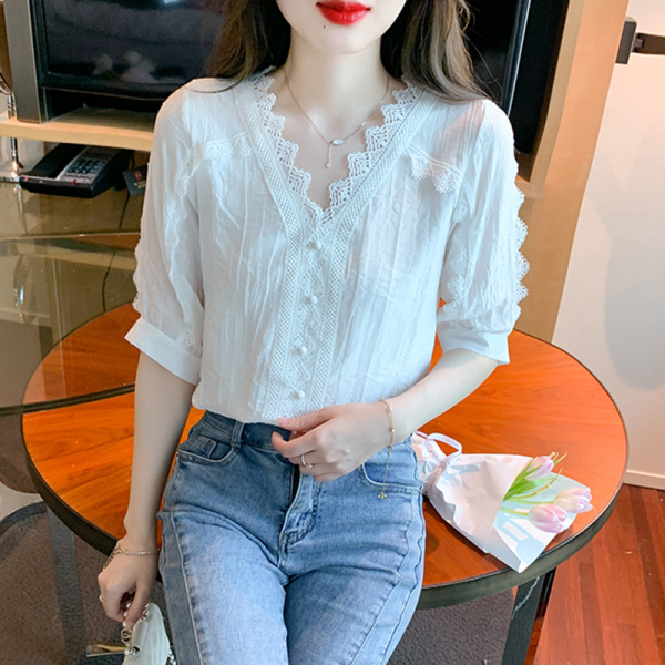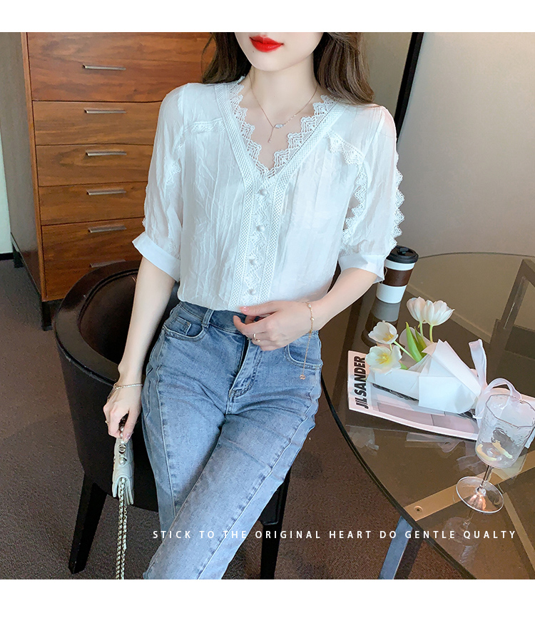 RM5493#雪纺衬衫短袖女装夏装2023年新款潮遮肚子白色蕾丝上衣夏