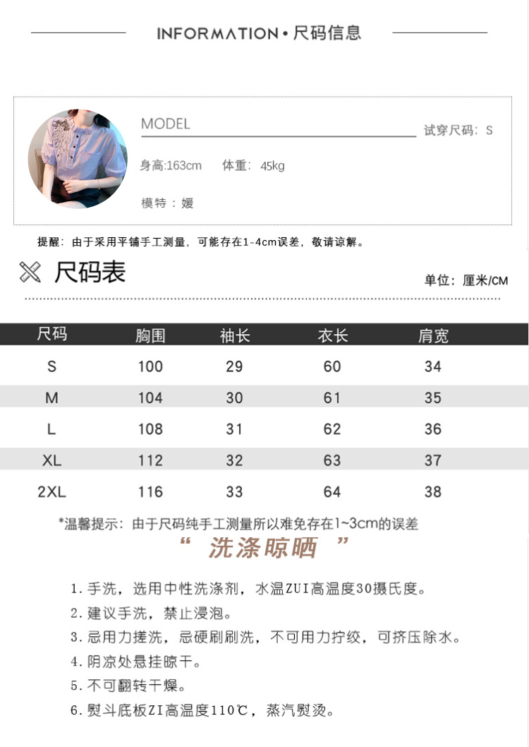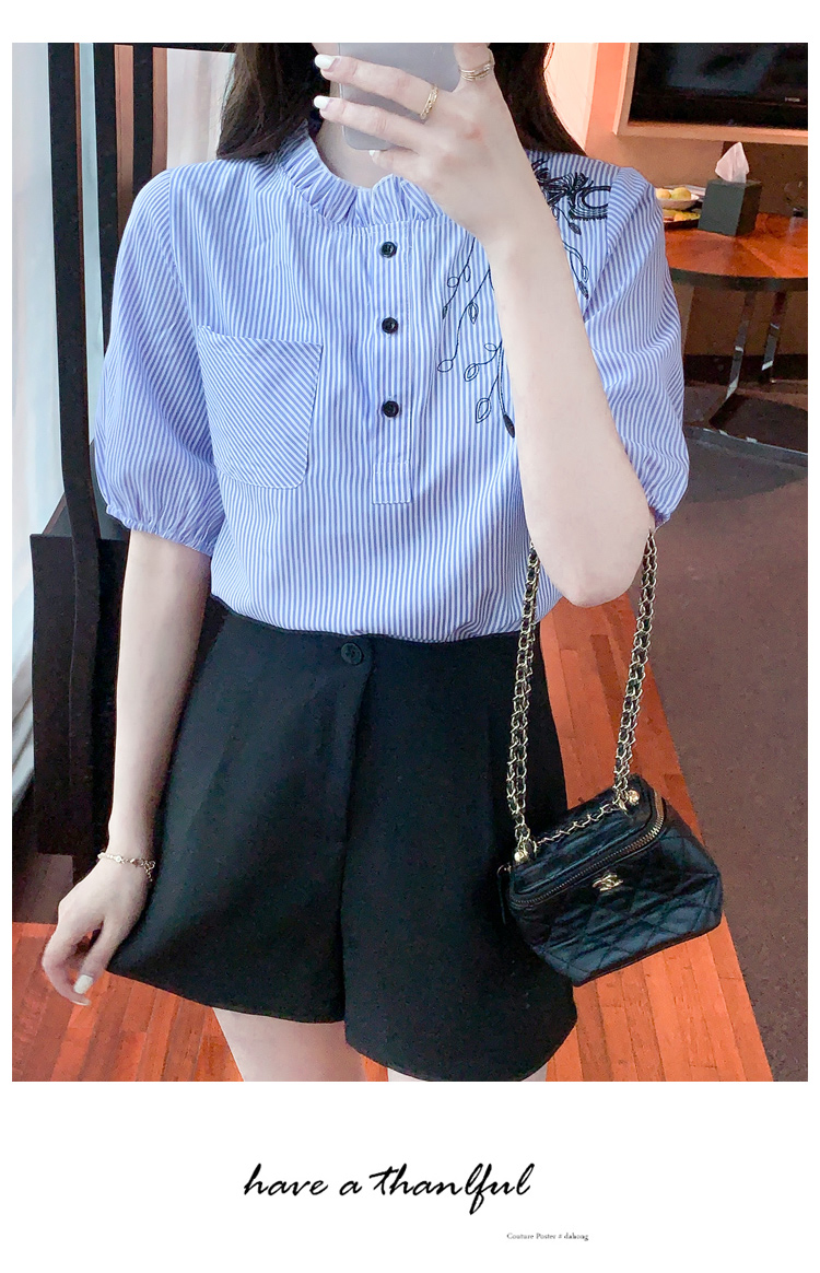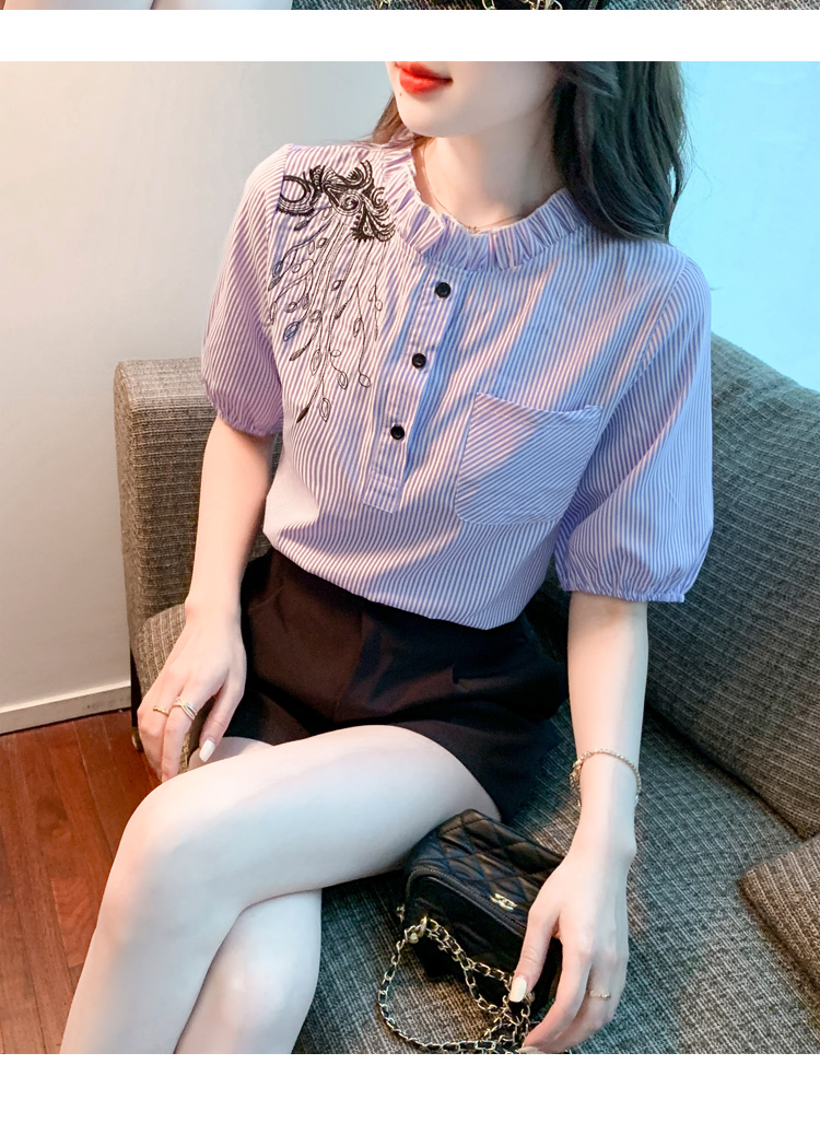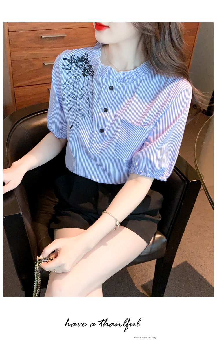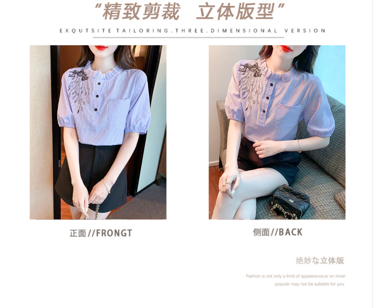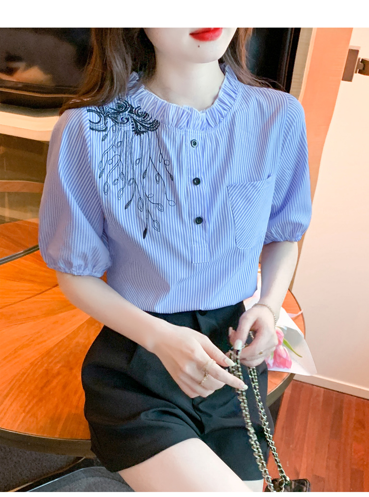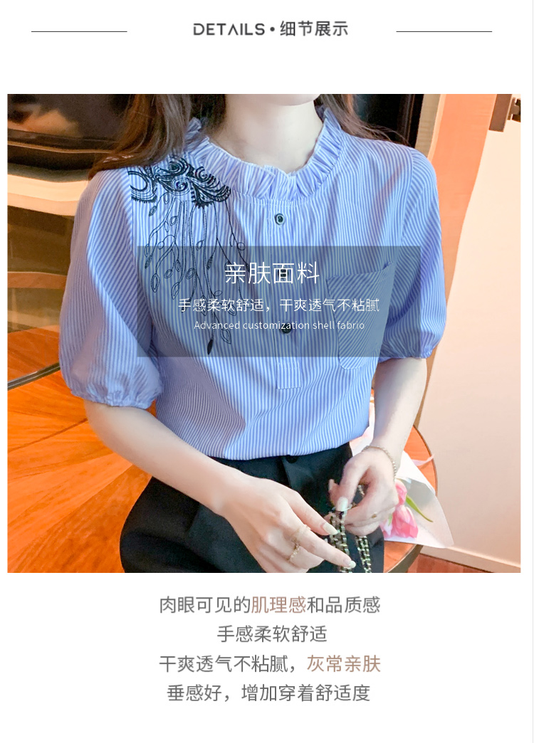 RM5835#夏季新款条纹刺绣短袖衬衫雪纺衫上衣荷叶领百搭小衫女