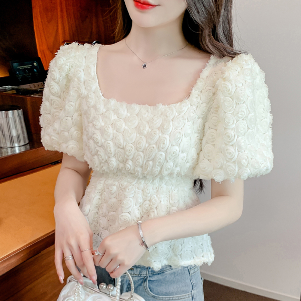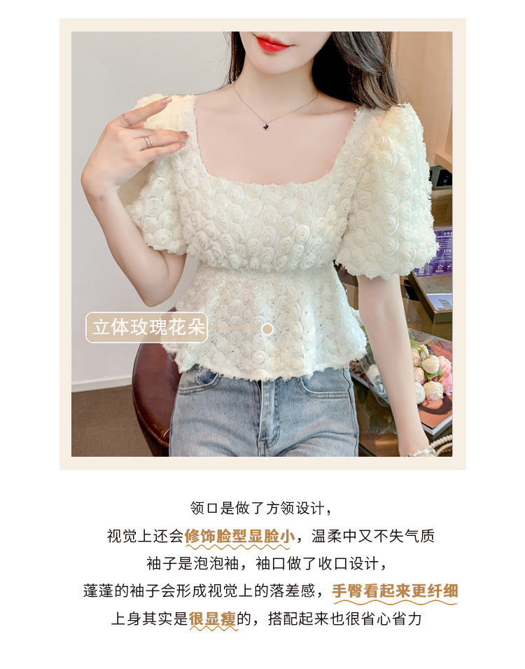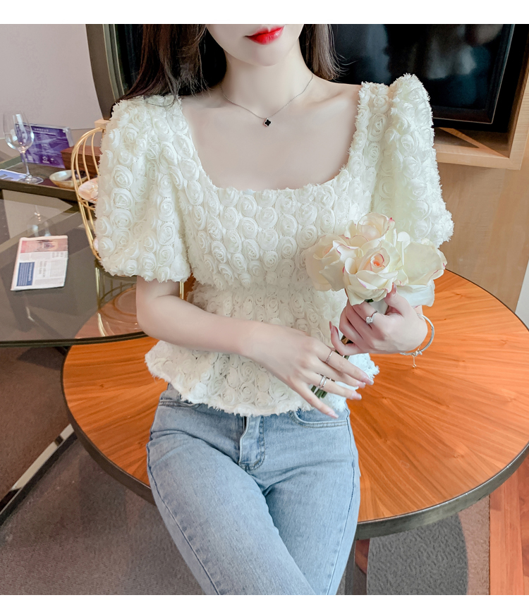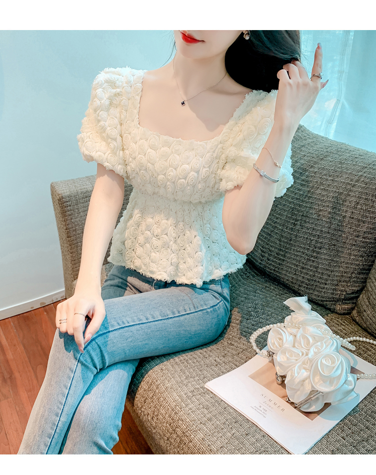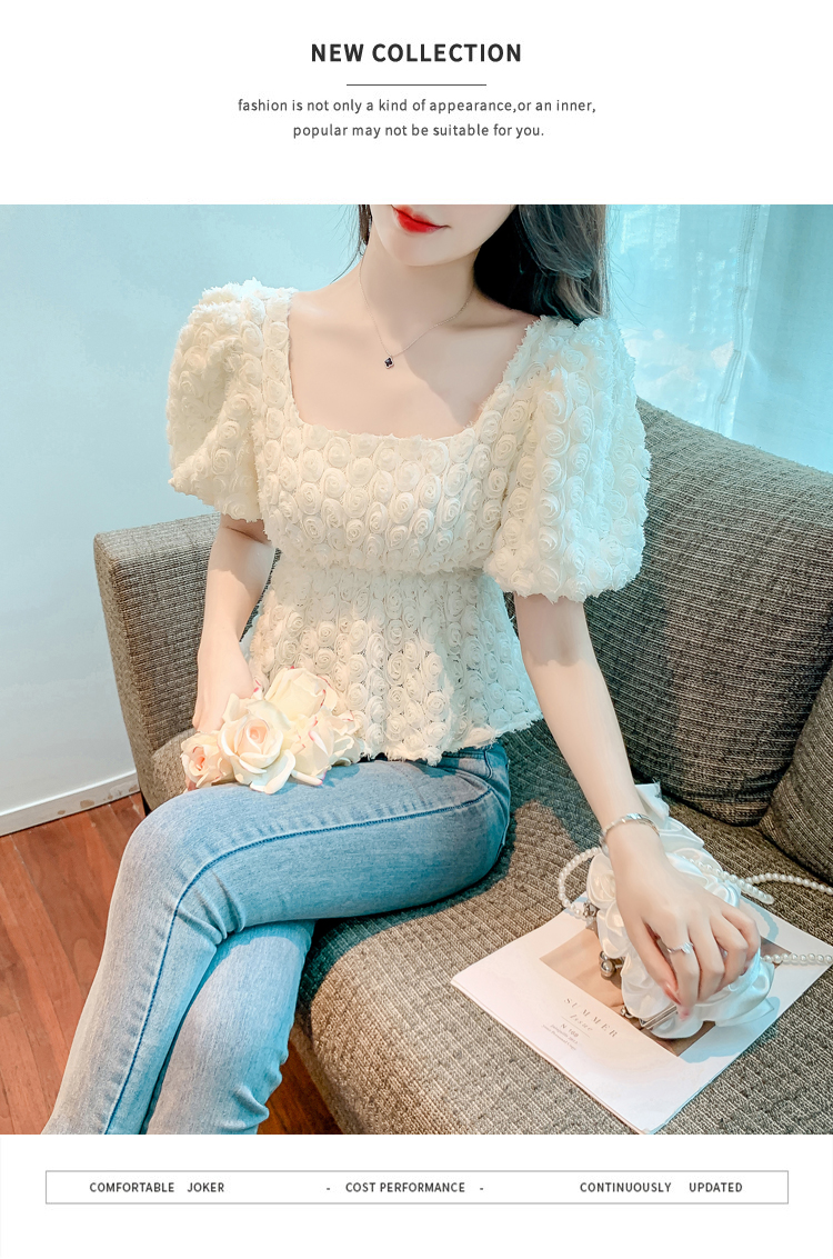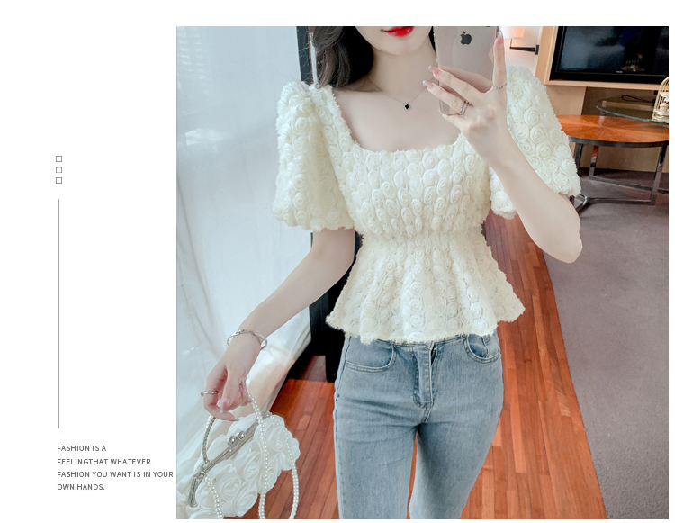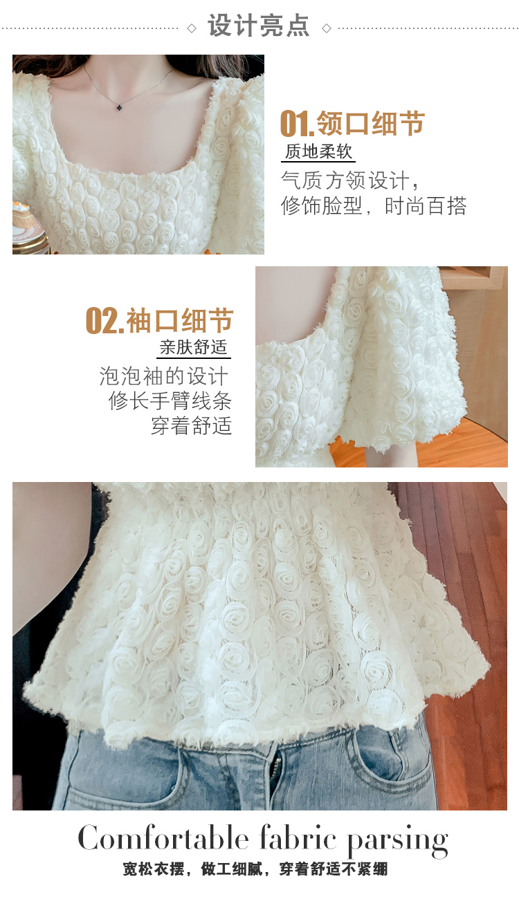 RM5605#法式浪漫气质方领立体花朵短袖蕾丝衬衣洋气上衣