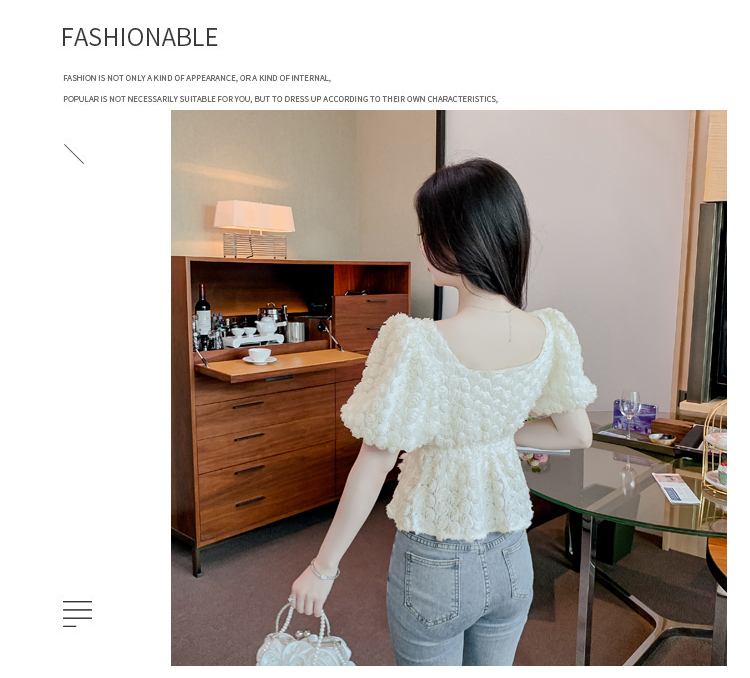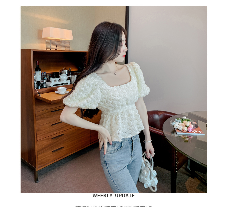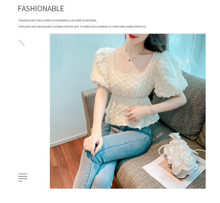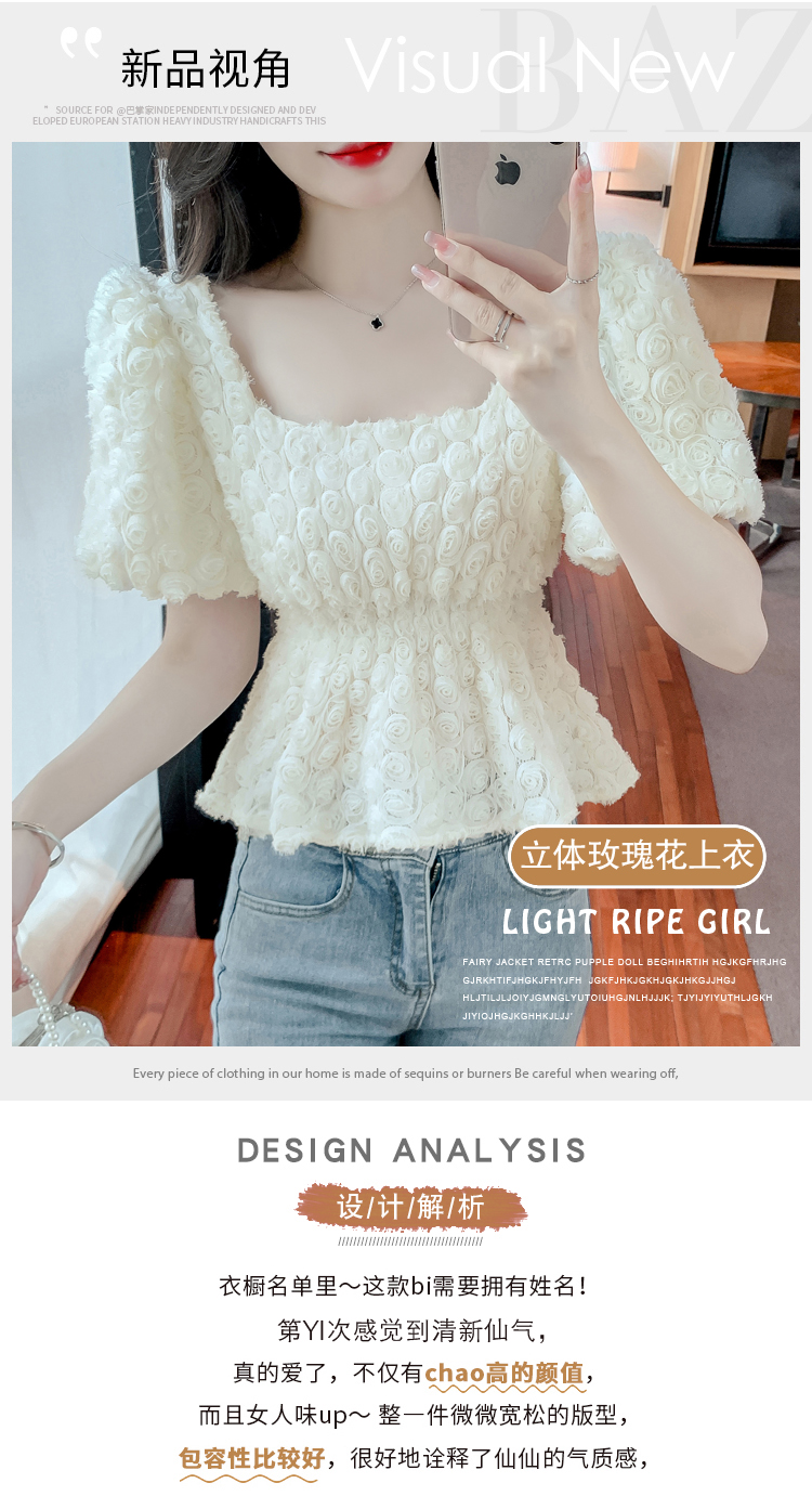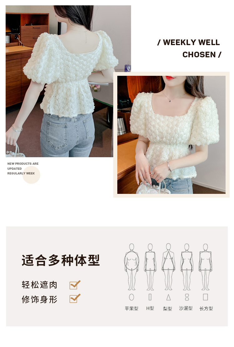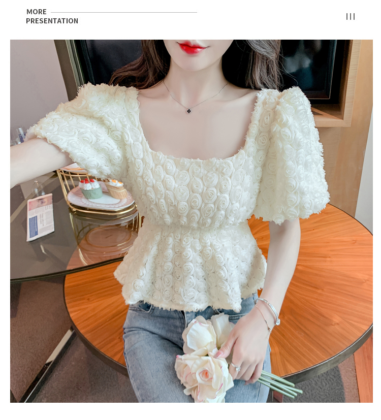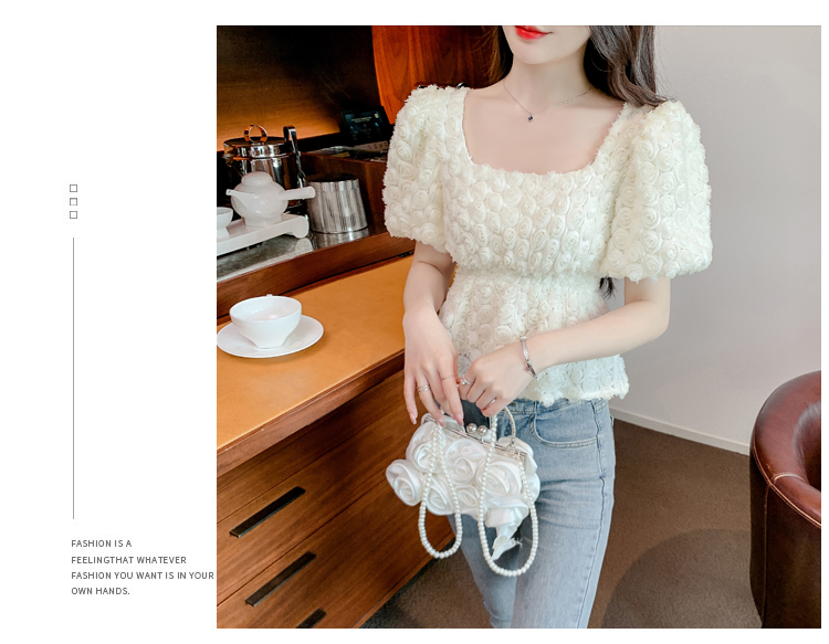 RM5605#法式浪漫气质方领立体花朵短袖蕾丝衬衣洋气上衣