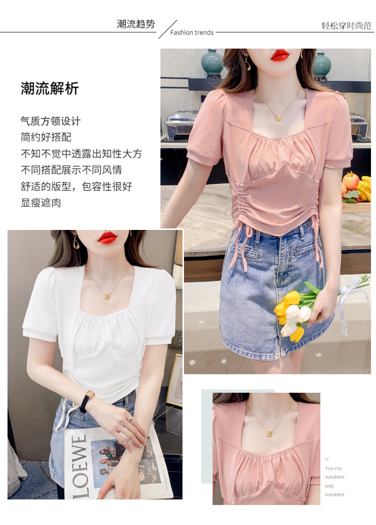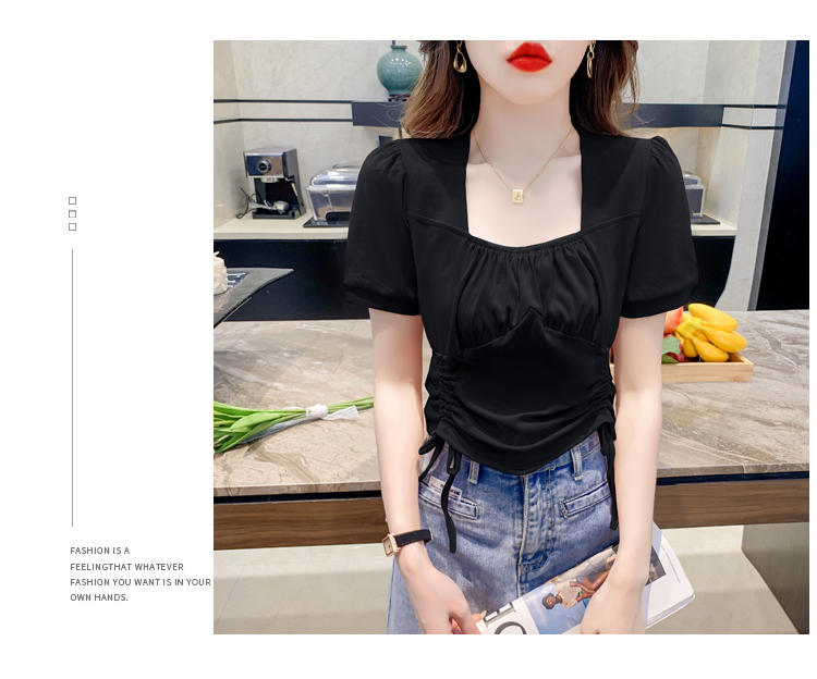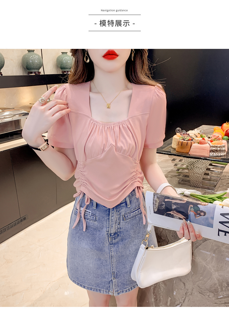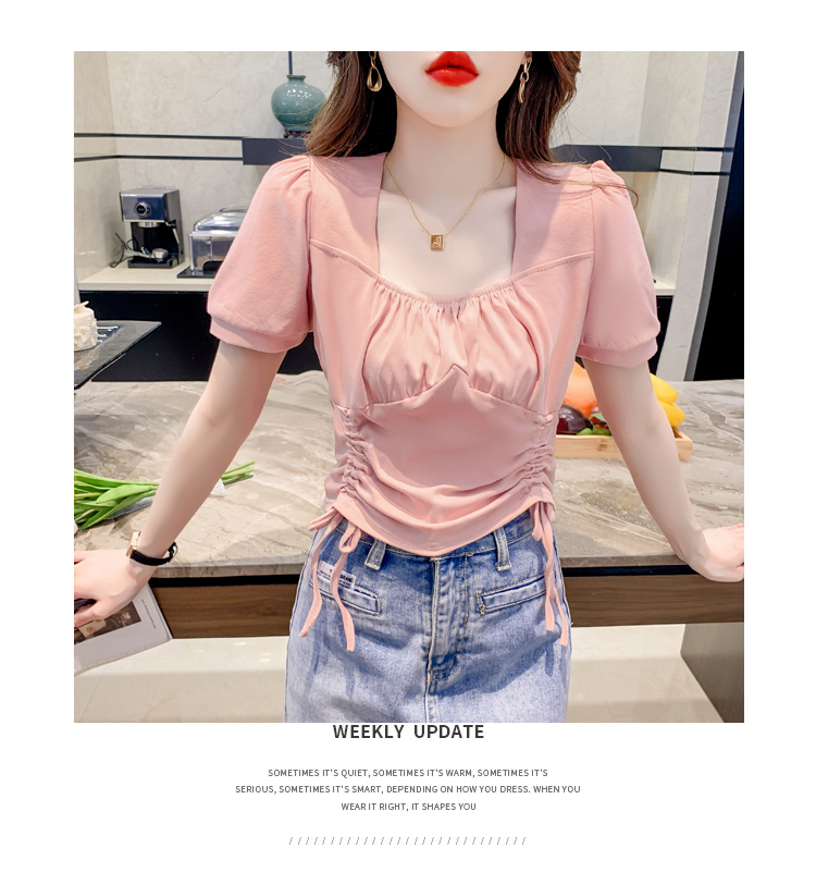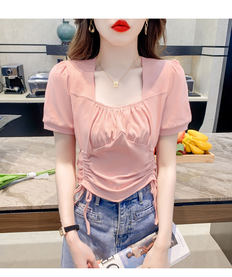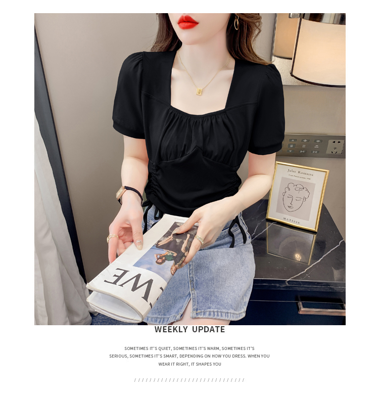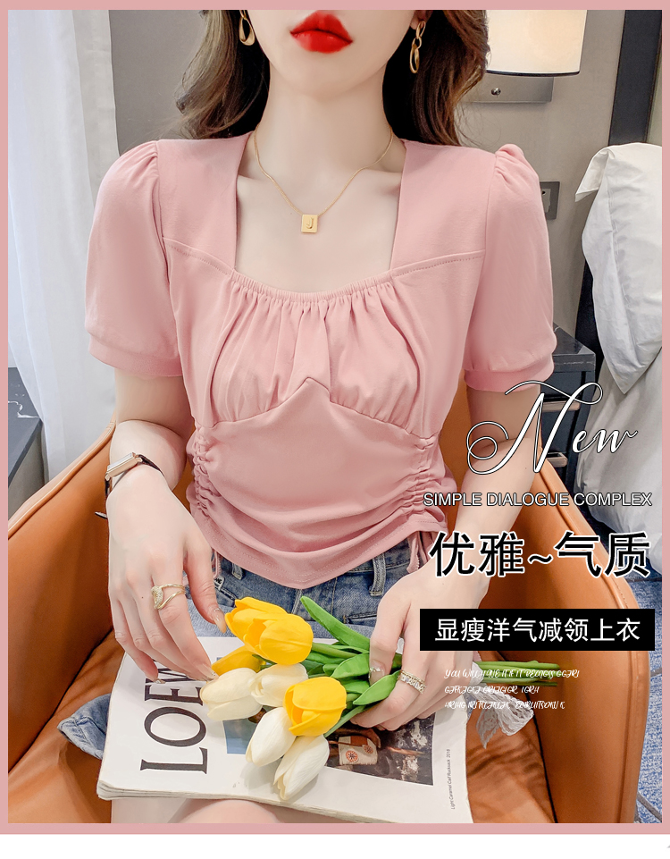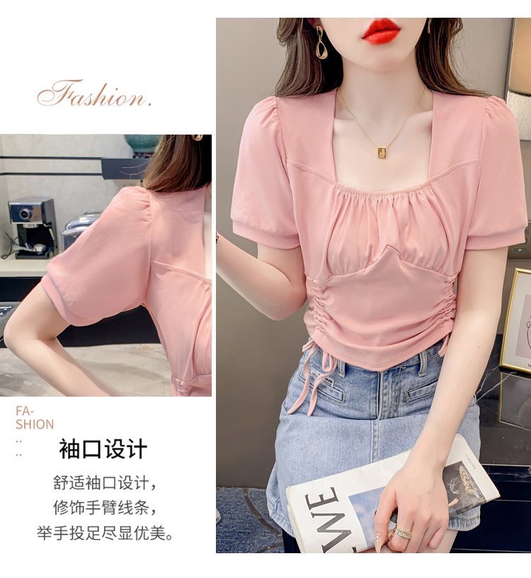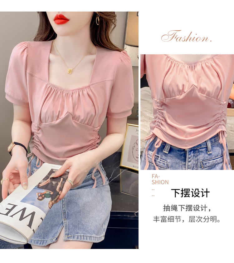 RM5688#短袖t恤女夏季新款法式锁骨方领正肩别致泡泡袖短款抽绳上衣