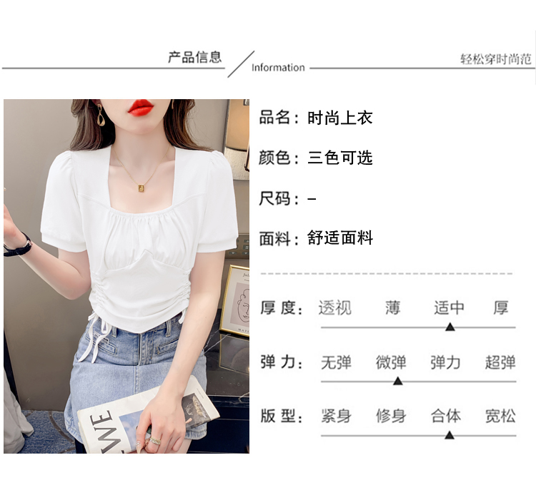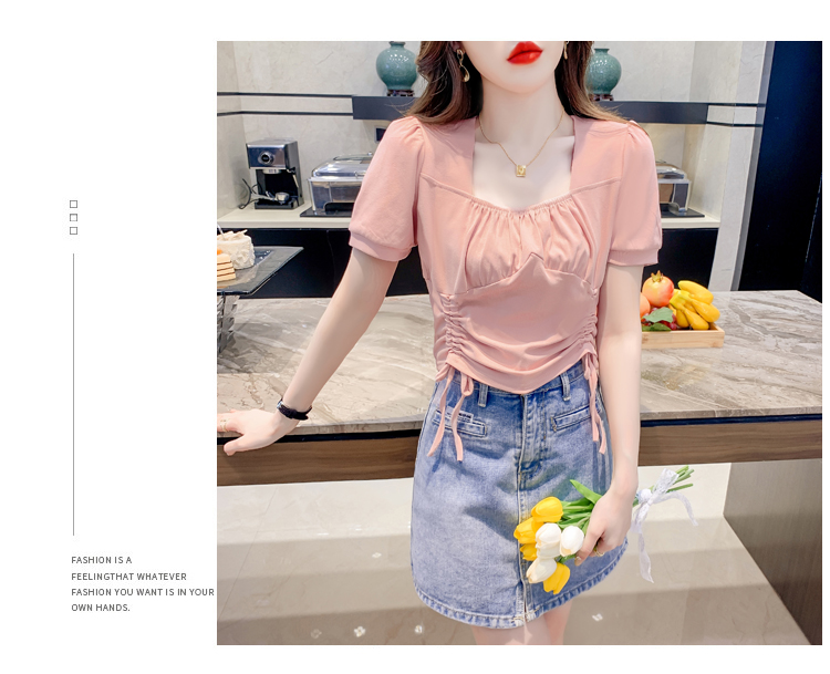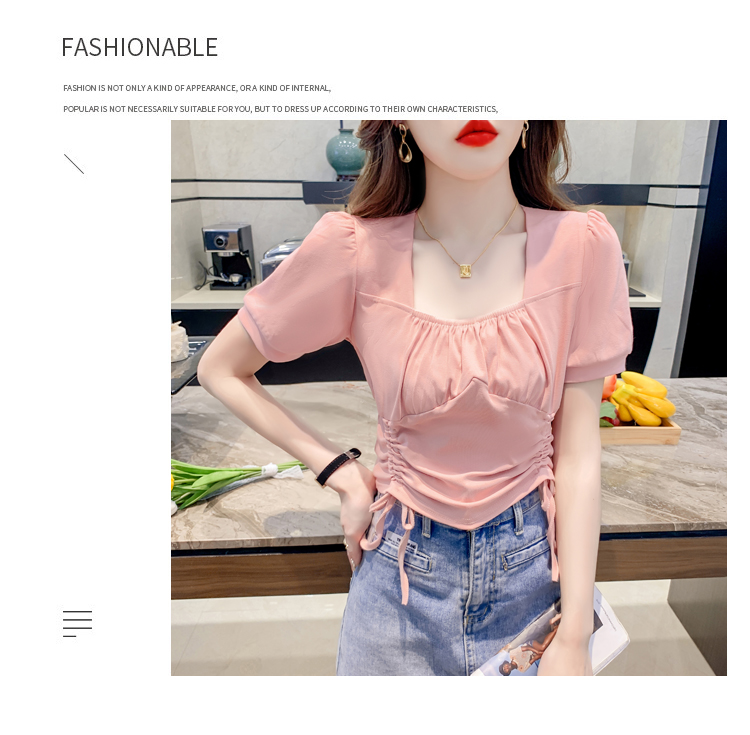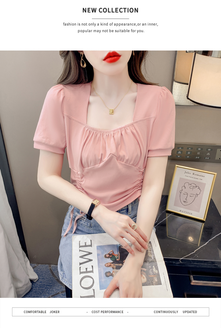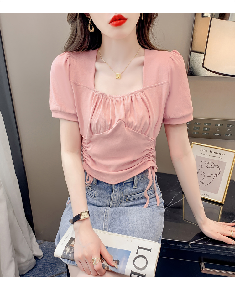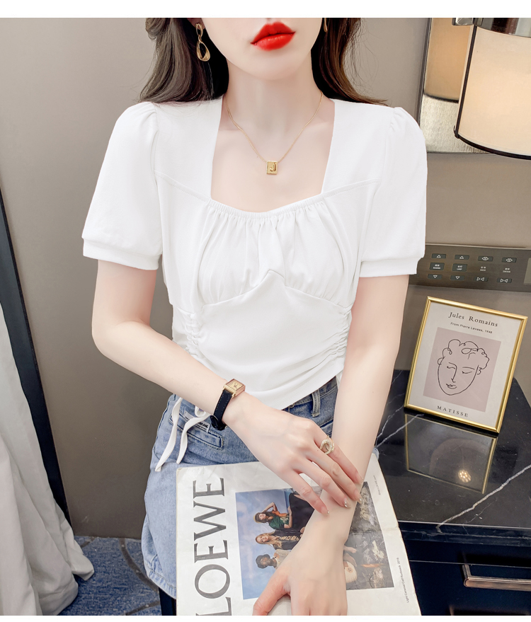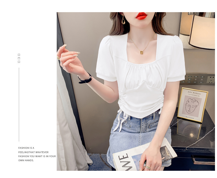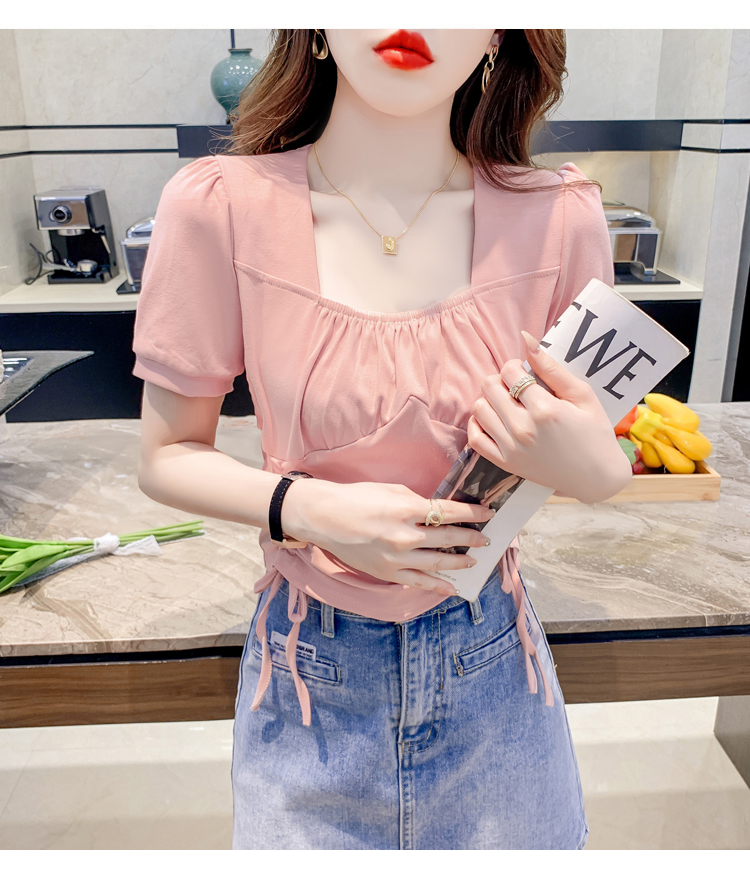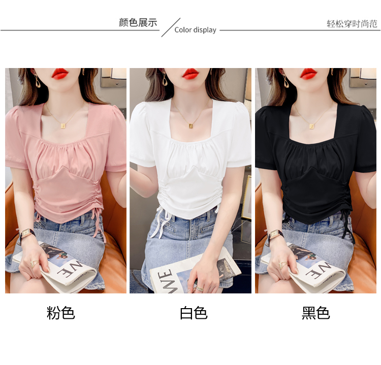RM5688#短袖t恤女夏季新款法式锁骨方领正肩别致泡泡袖短款抽绳上衣