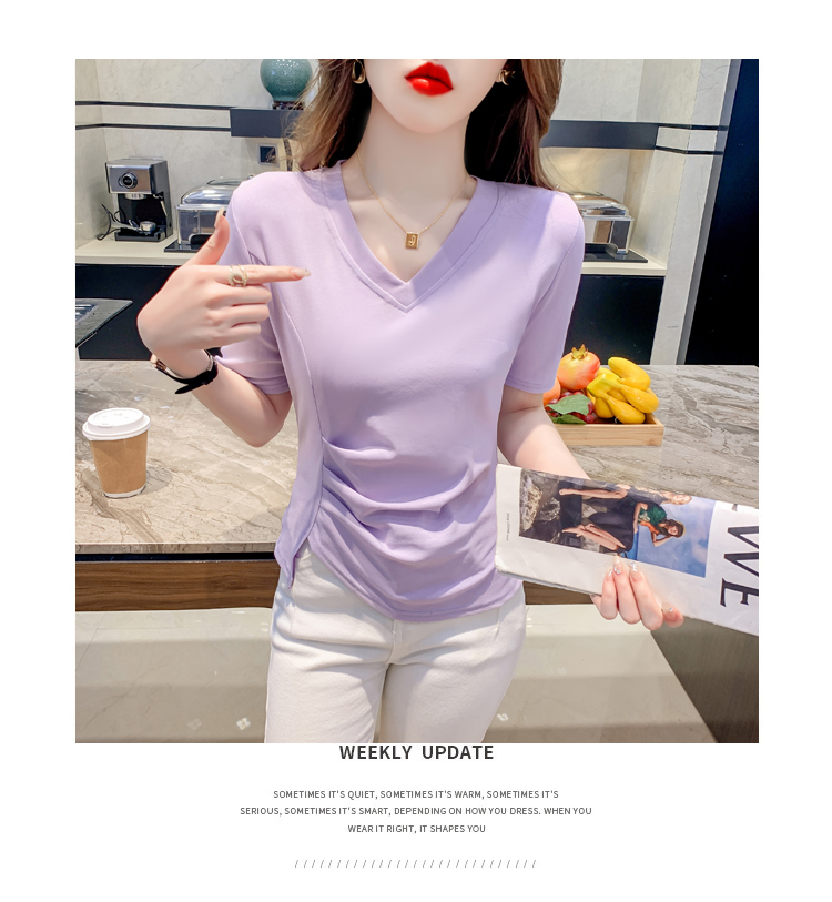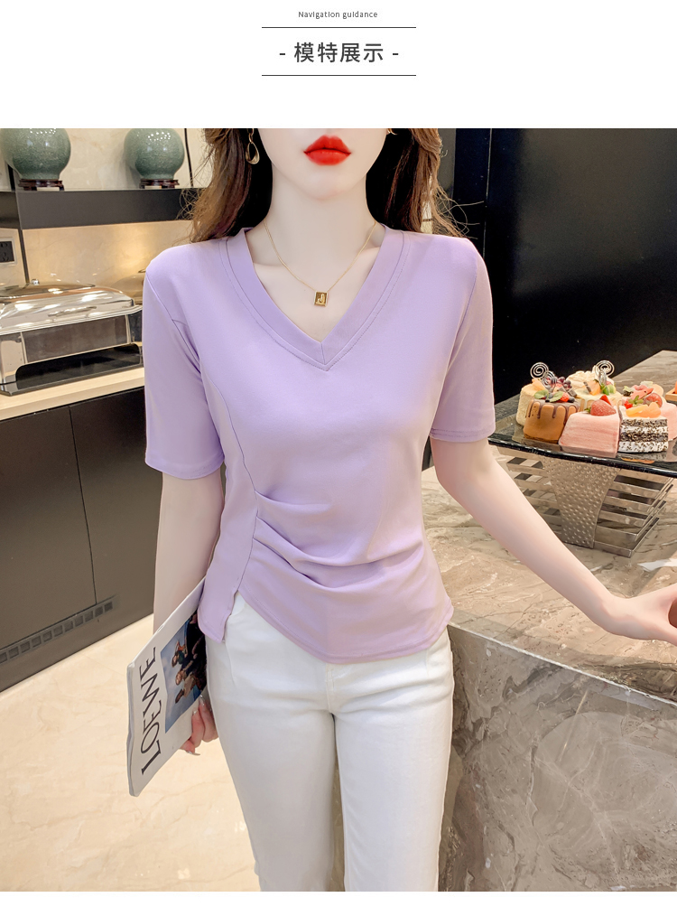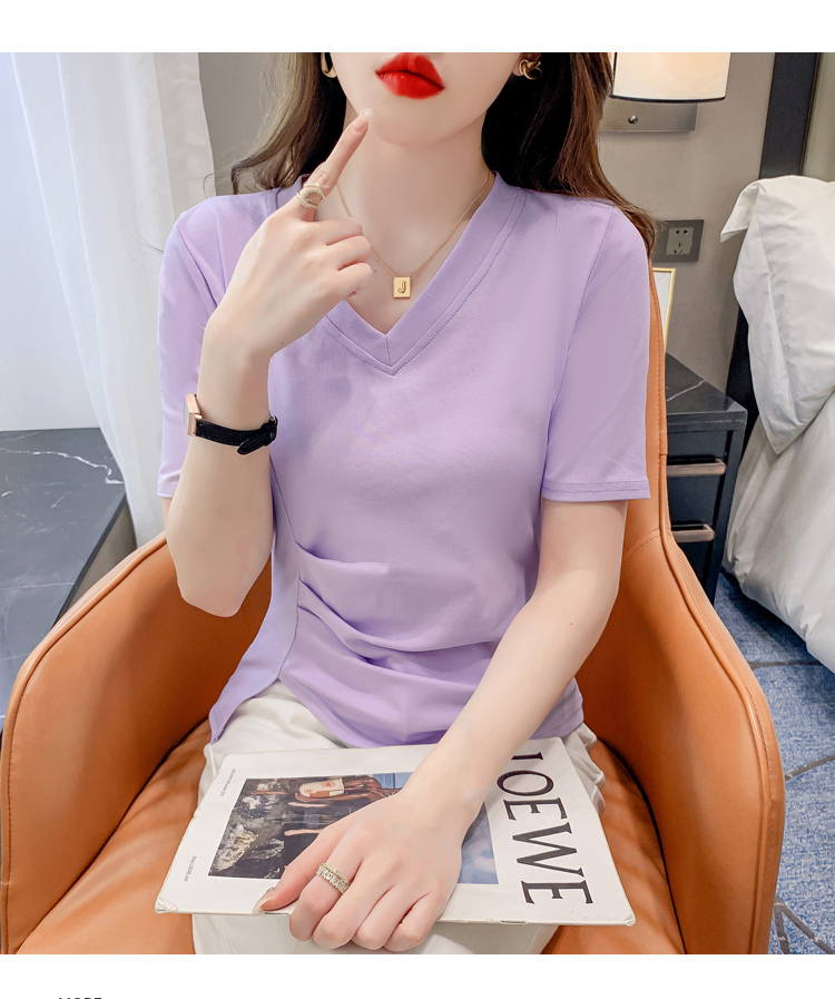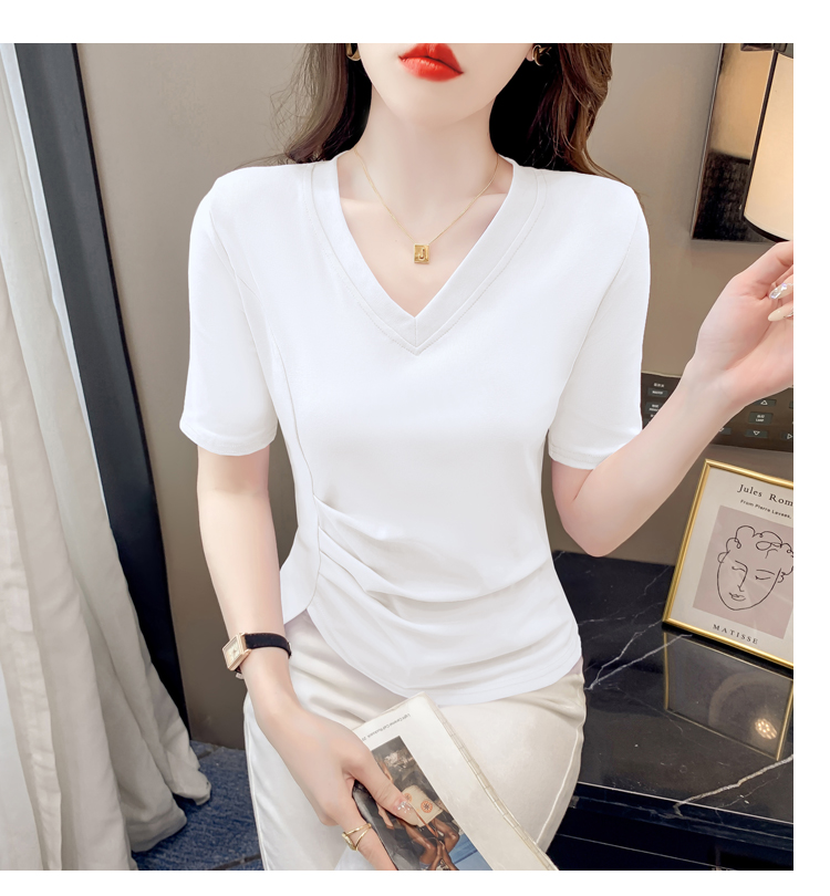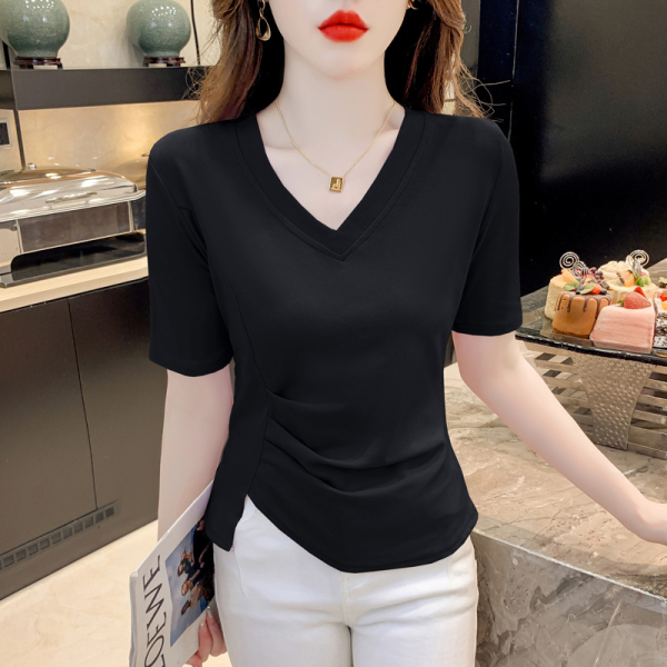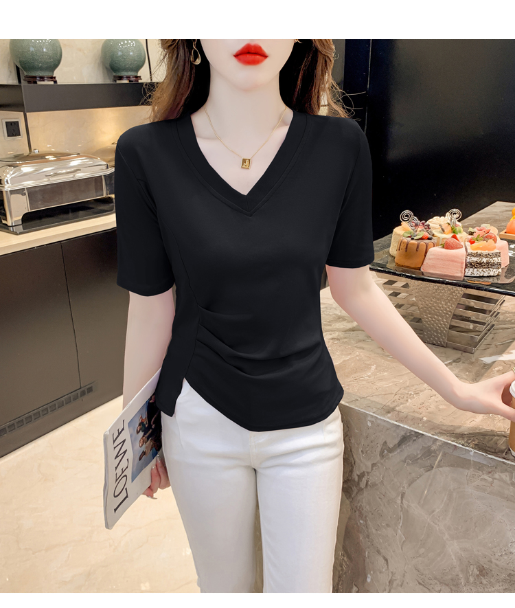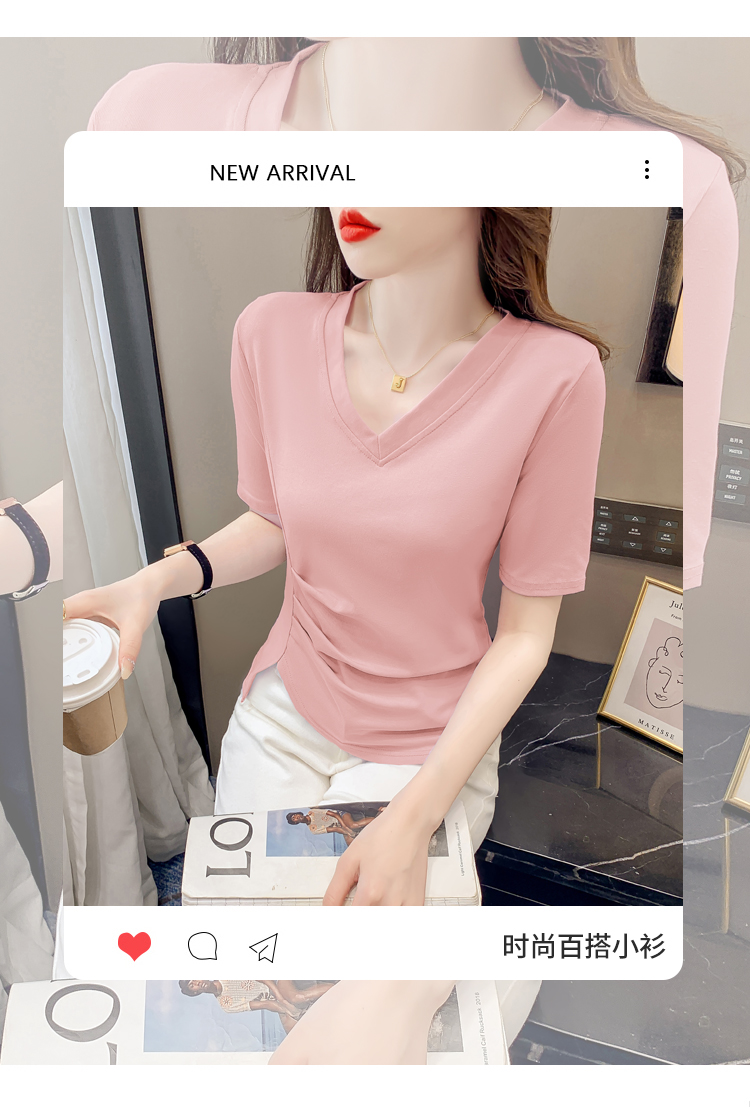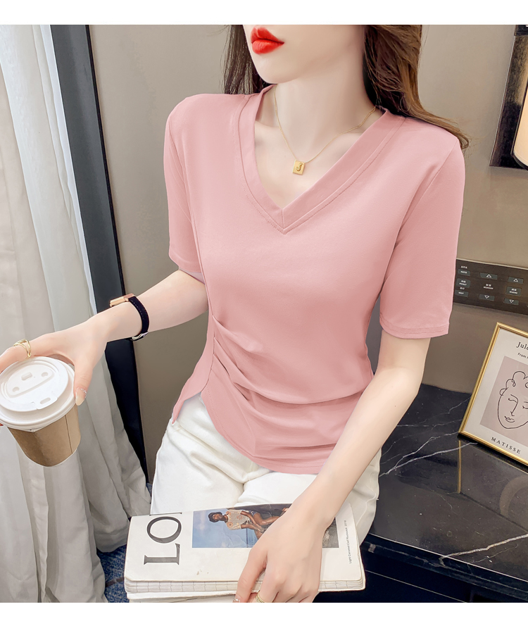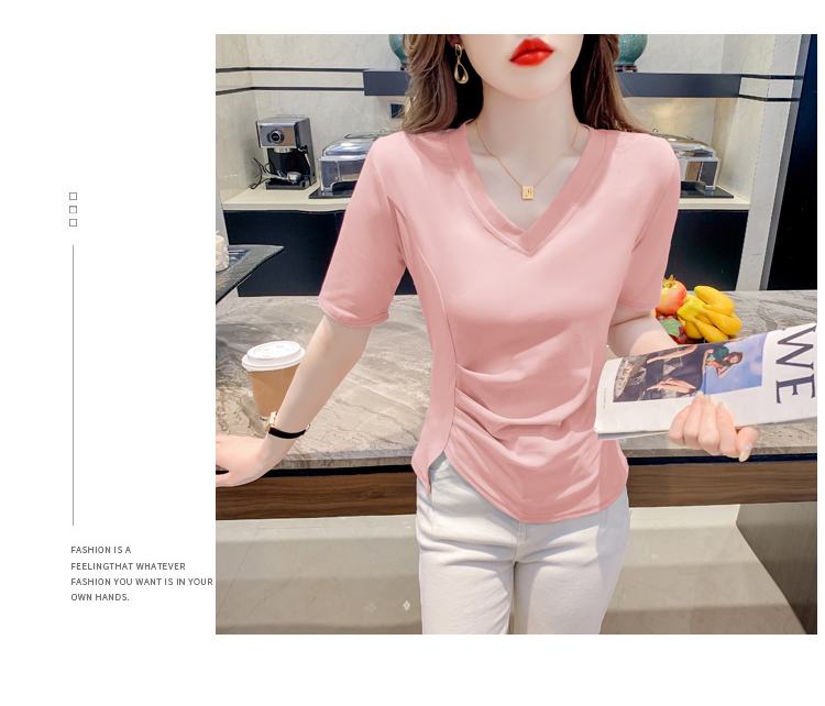 RM5689#不规则褶皱v领短袖t恤女夏季新款正肩修身显瘦内搭短款上衣