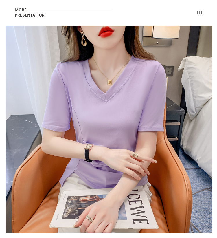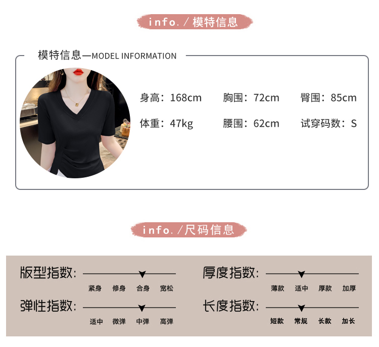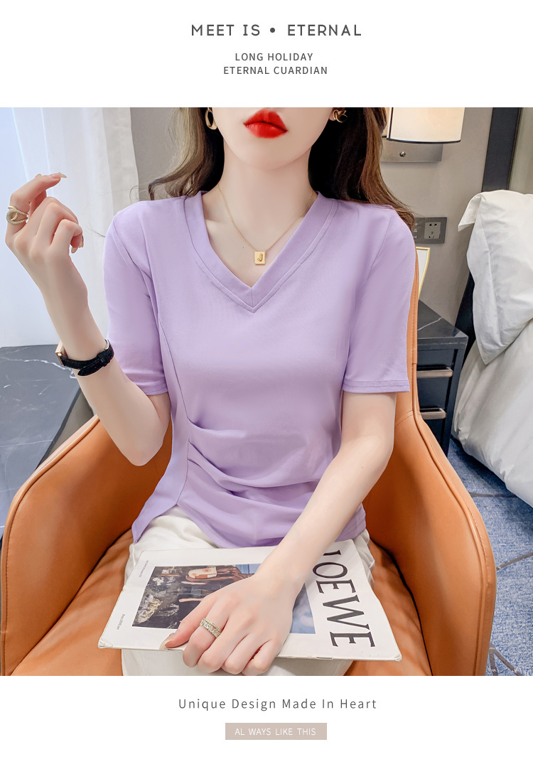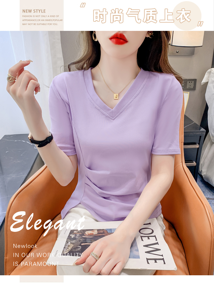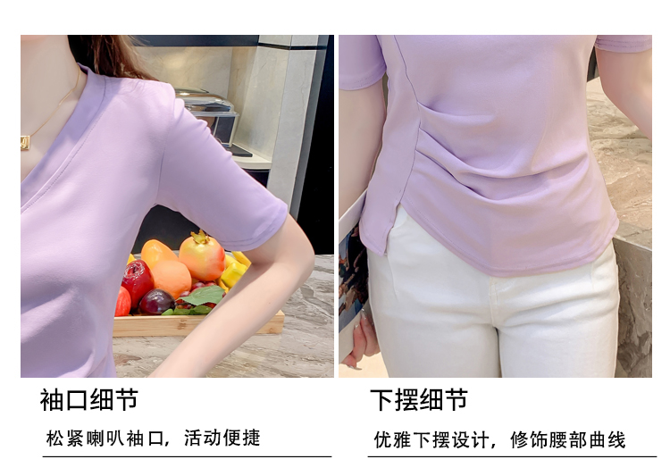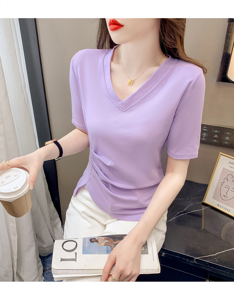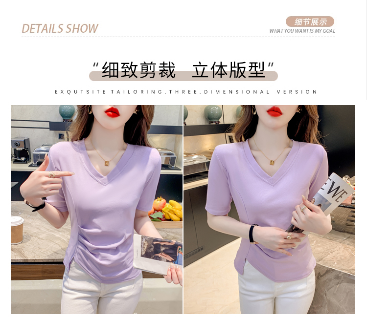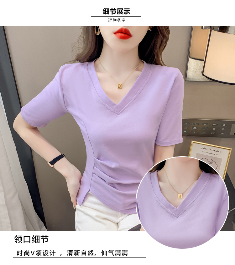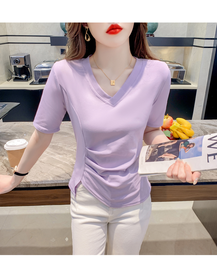 RM5689#不规则褶皱v领短袖t恤女夏季新款正肩修身显瘦内搭短款上衣