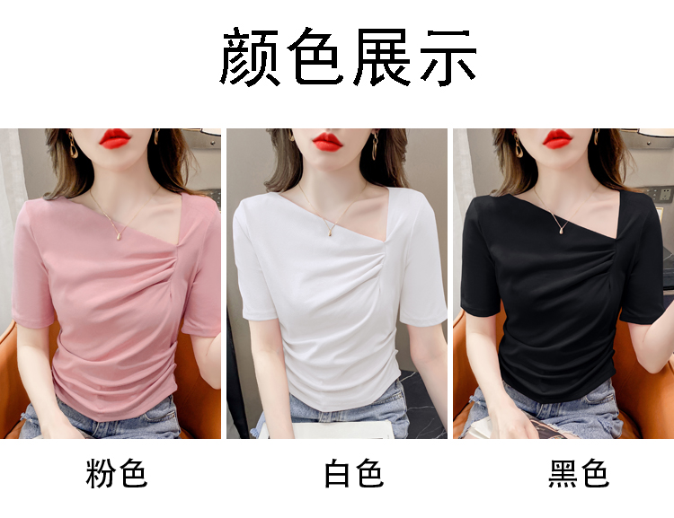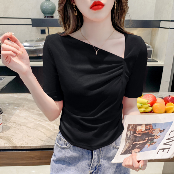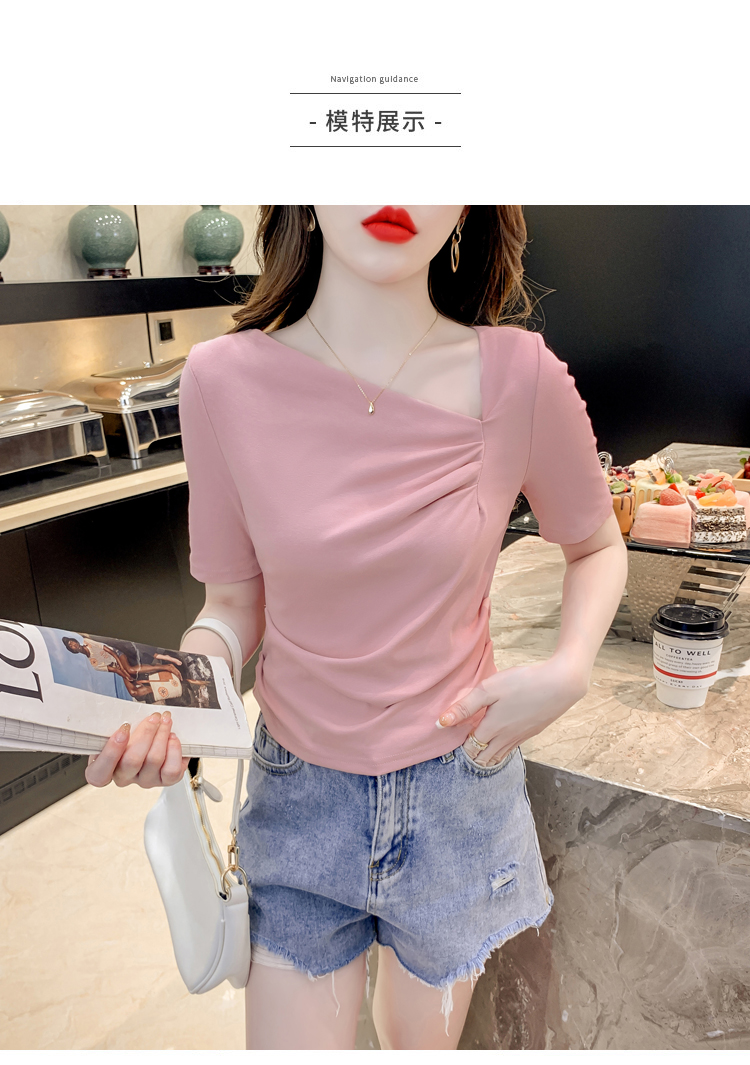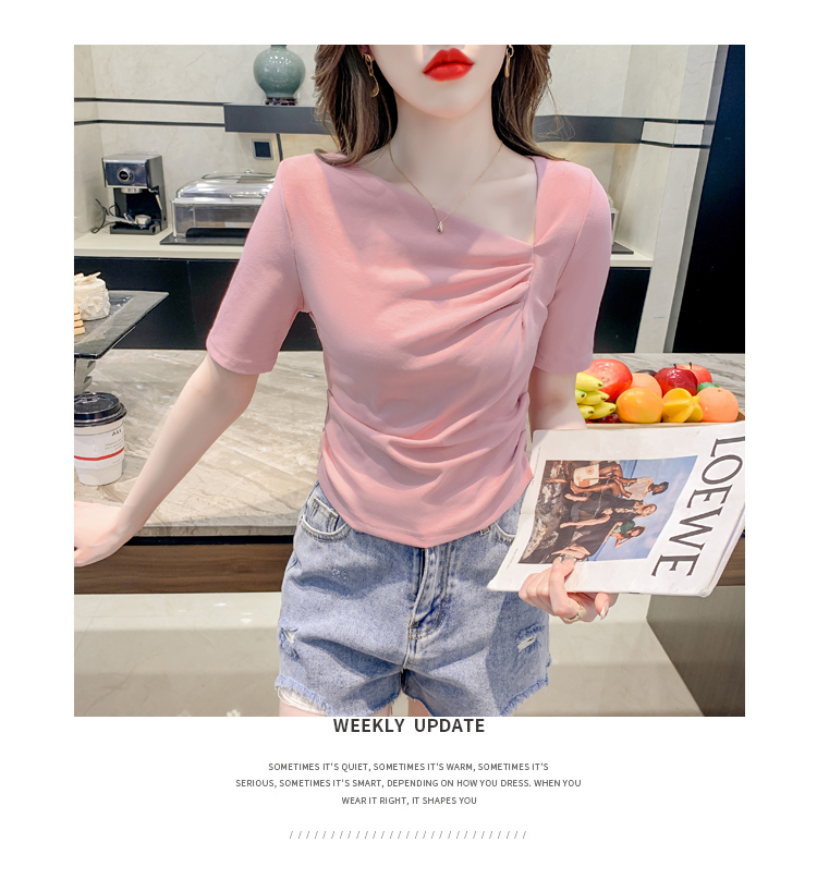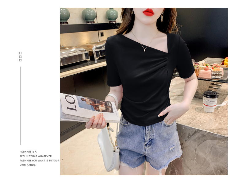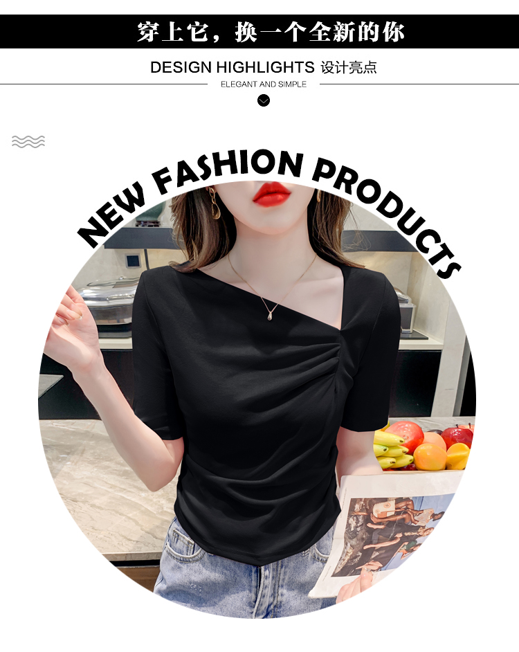 RM5690#别致不规则心机斜领T恤女2023夏季新款洋气褶皱修身短袖上衣