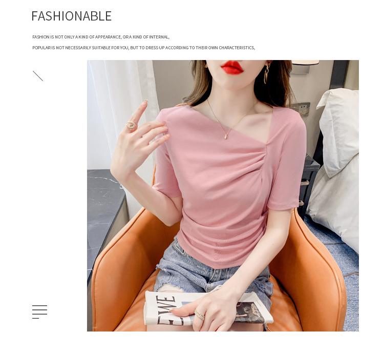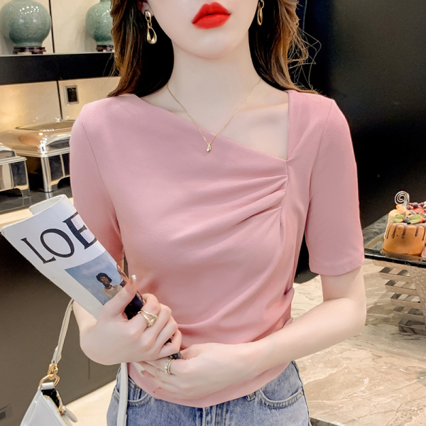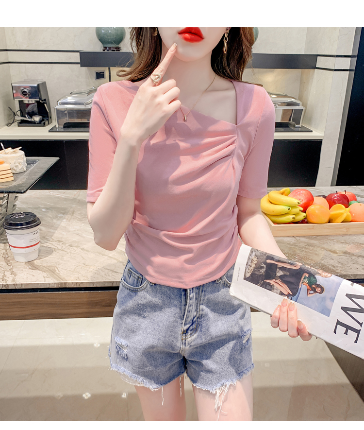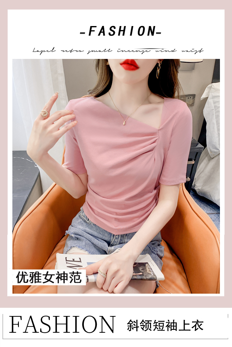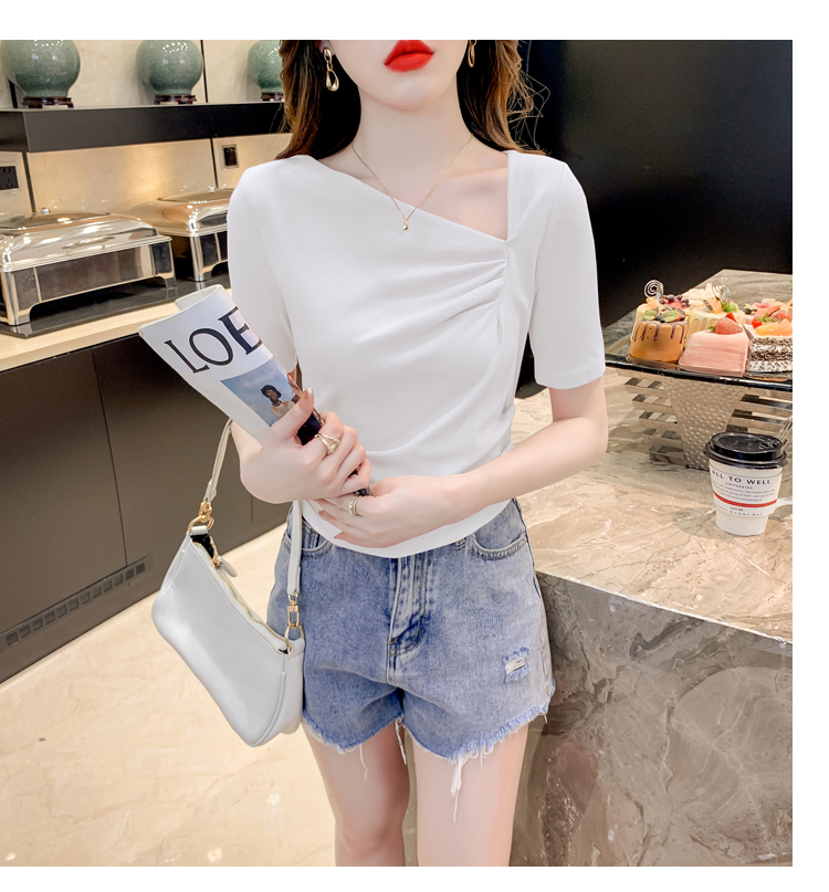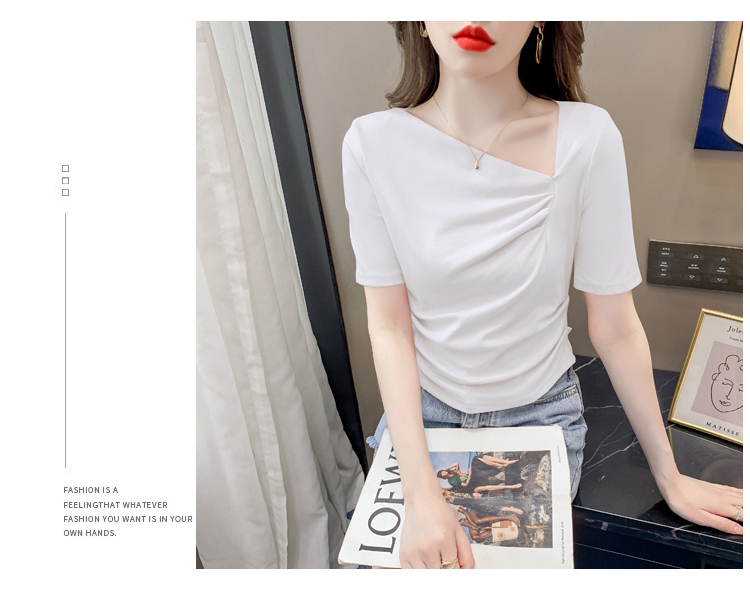RM5690#别致不规则心机斜领T恤女2023夏季新款洋气褶皱修身短袖上衣