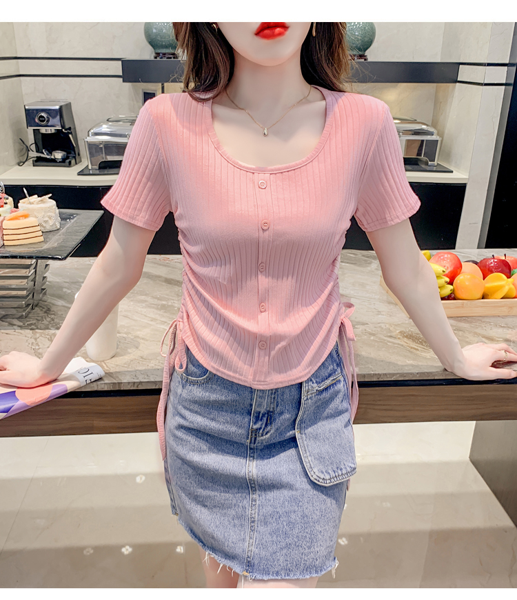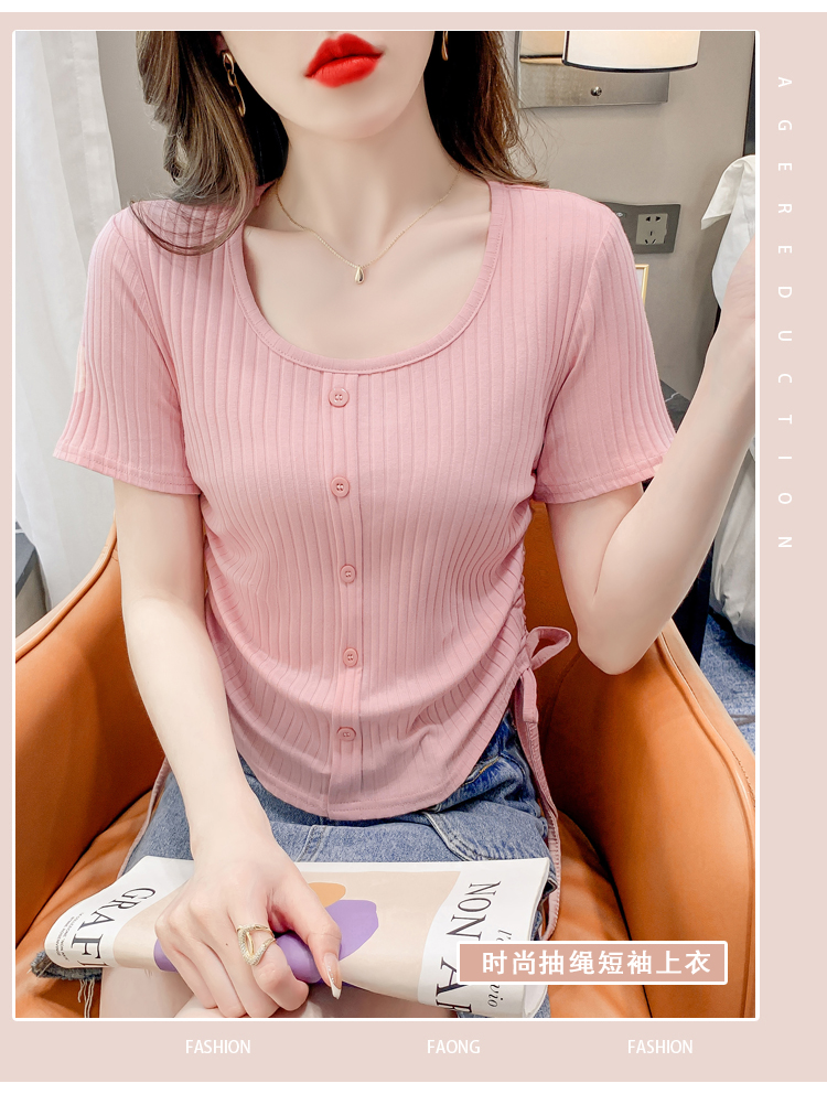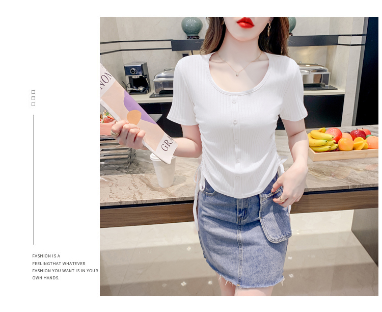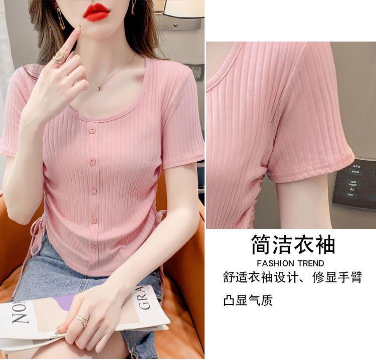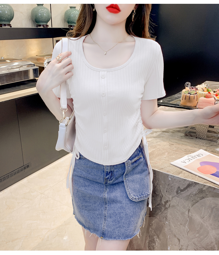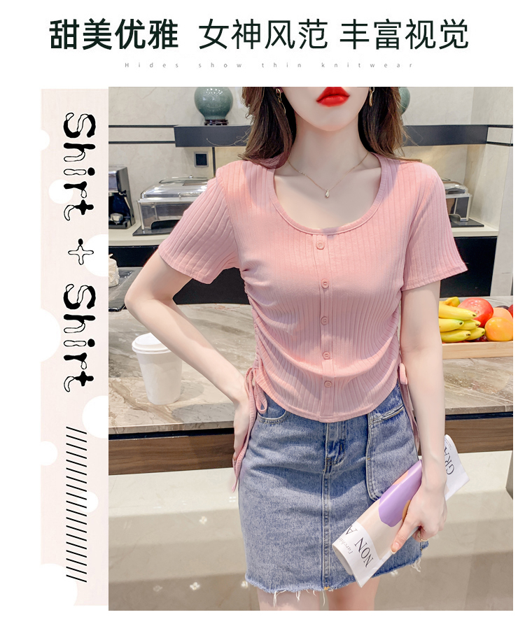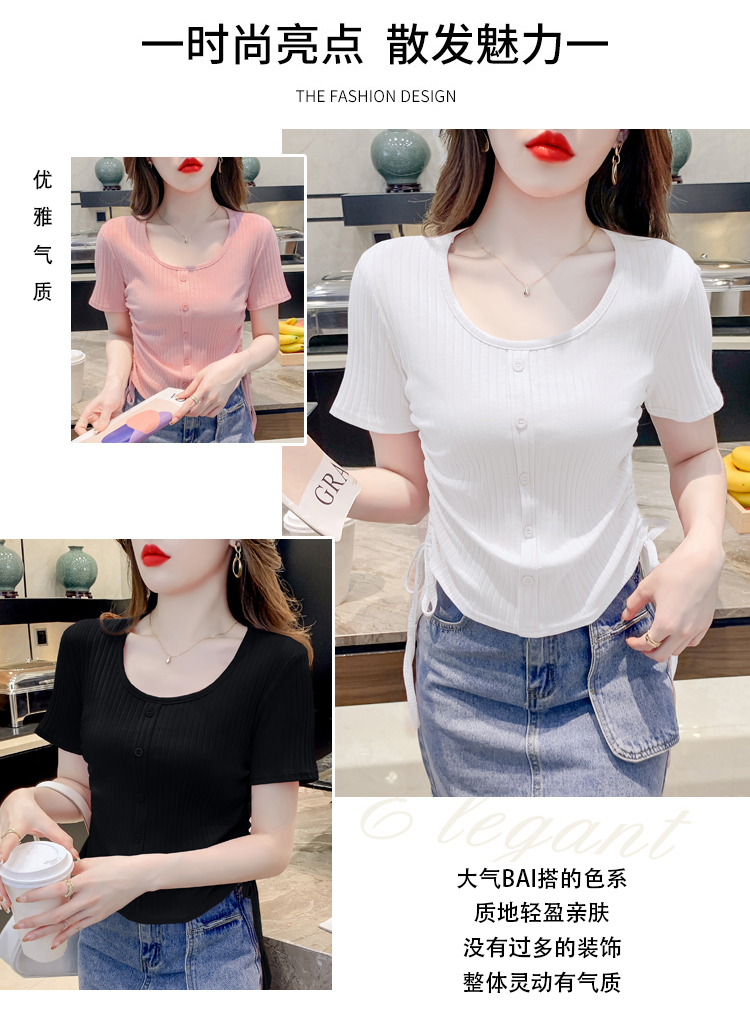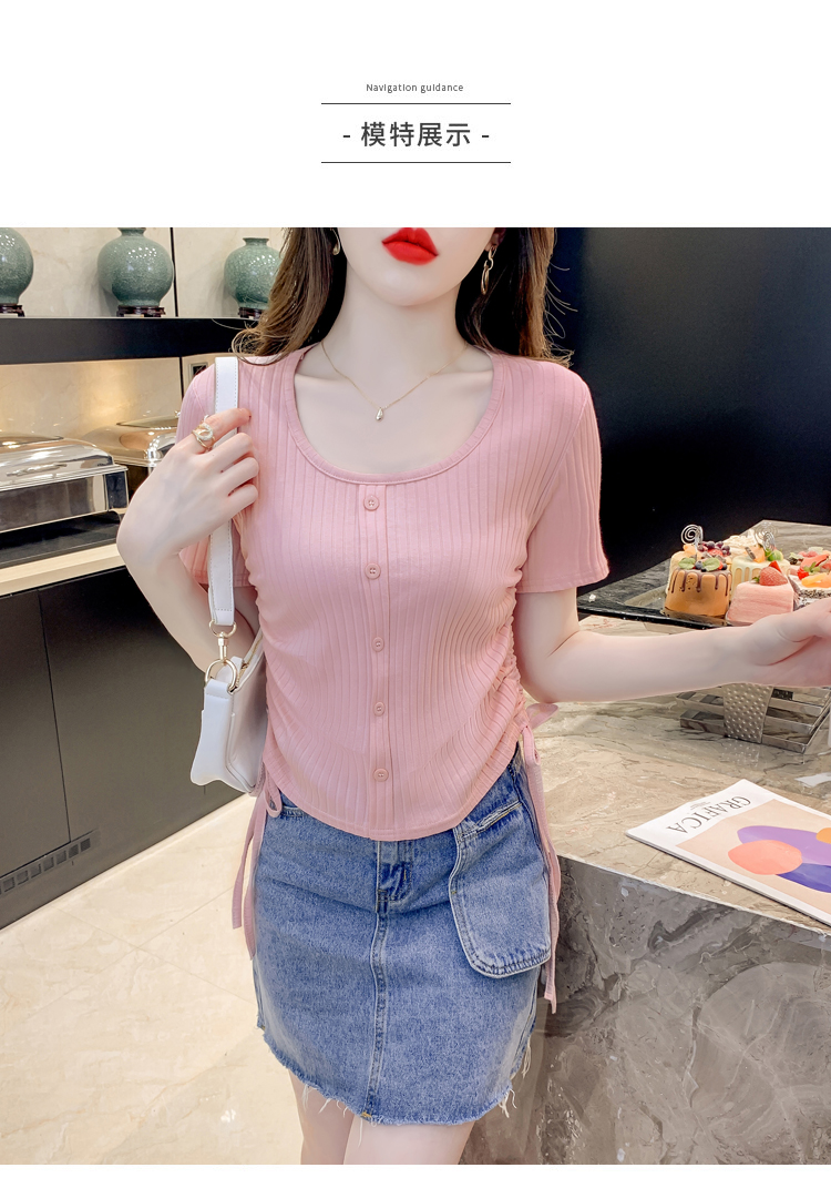 RM5693#设计感u领抽绳短袖t恤打底衫女新款2023夏季辣妹修身短款上衣