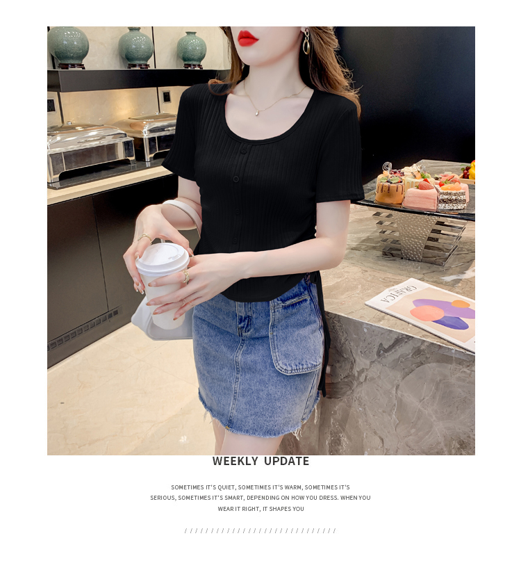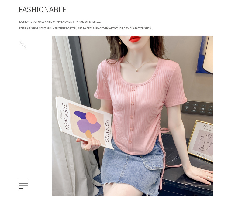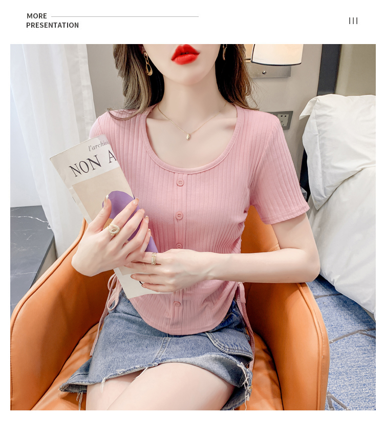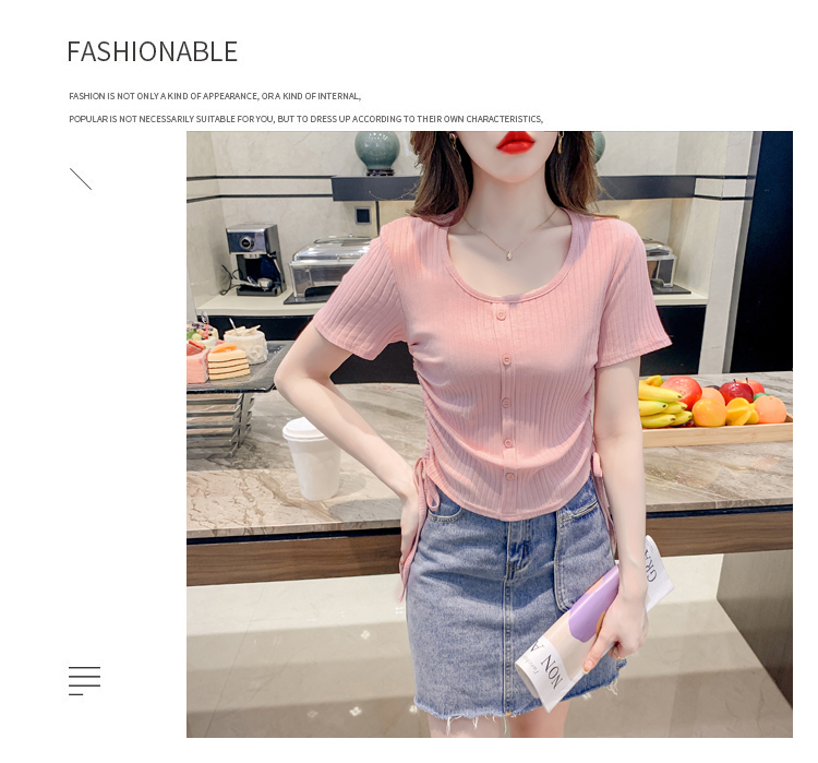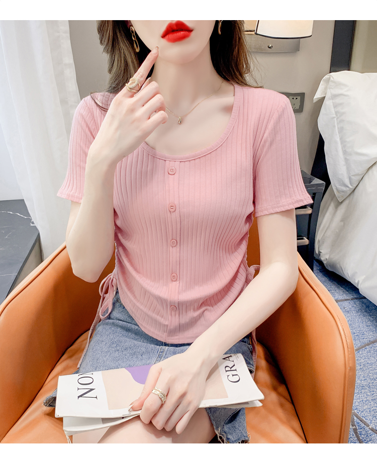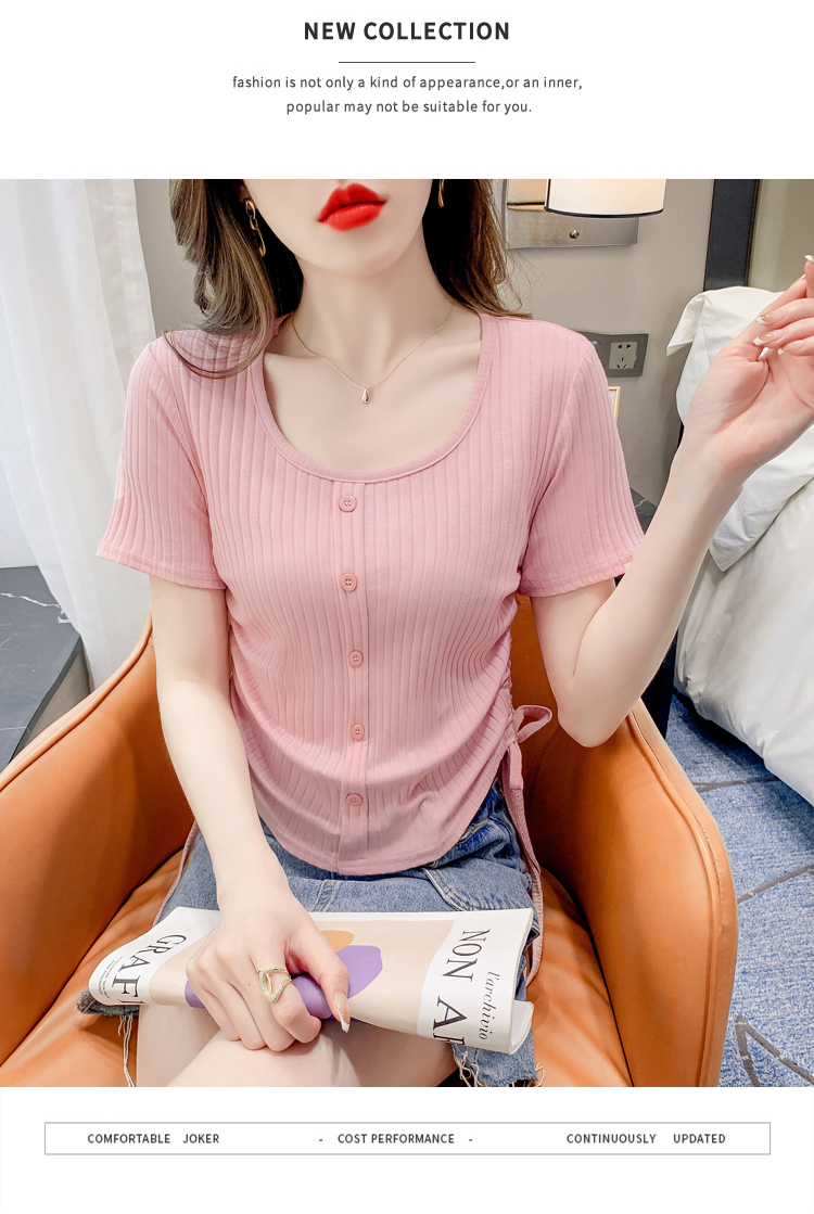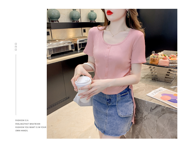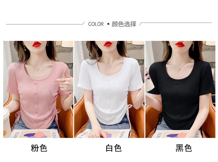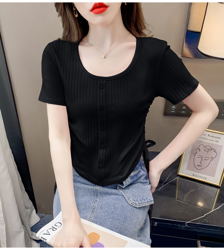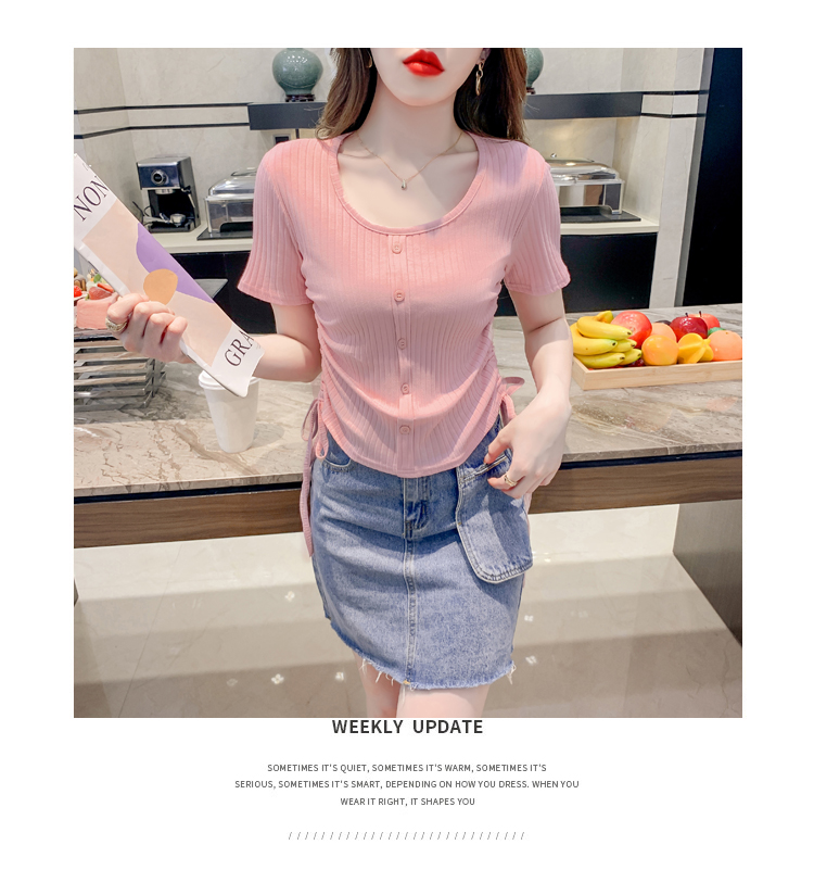RM5693#设计感u领抽绳短袖t恤打底衫女新款2023夏季辣妹修身短款上衣