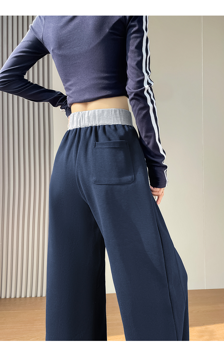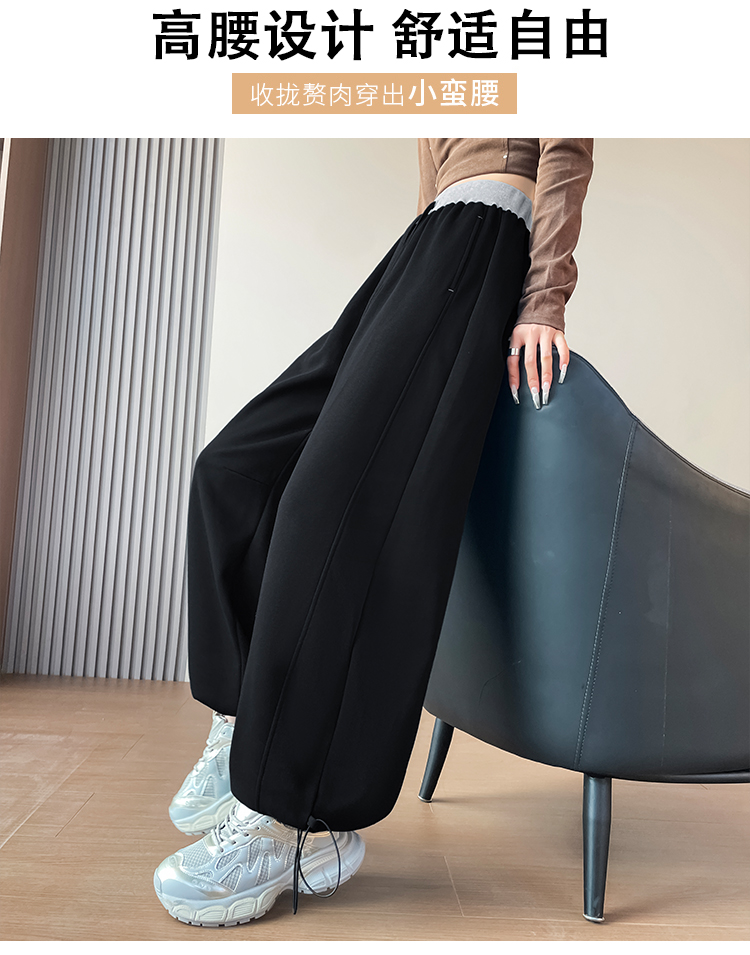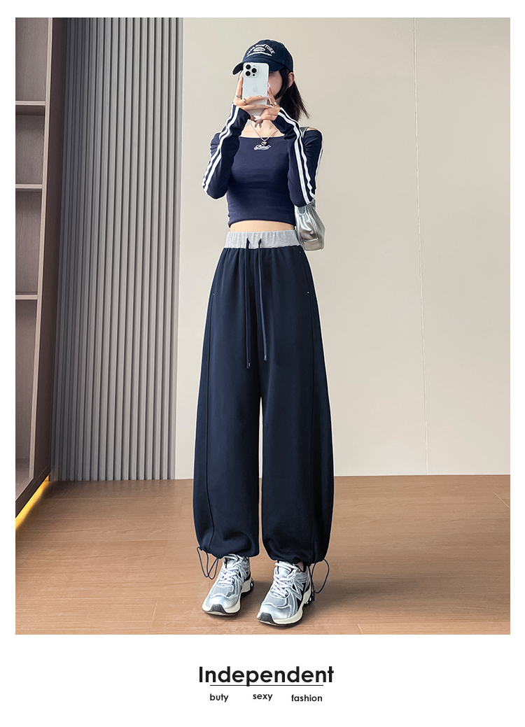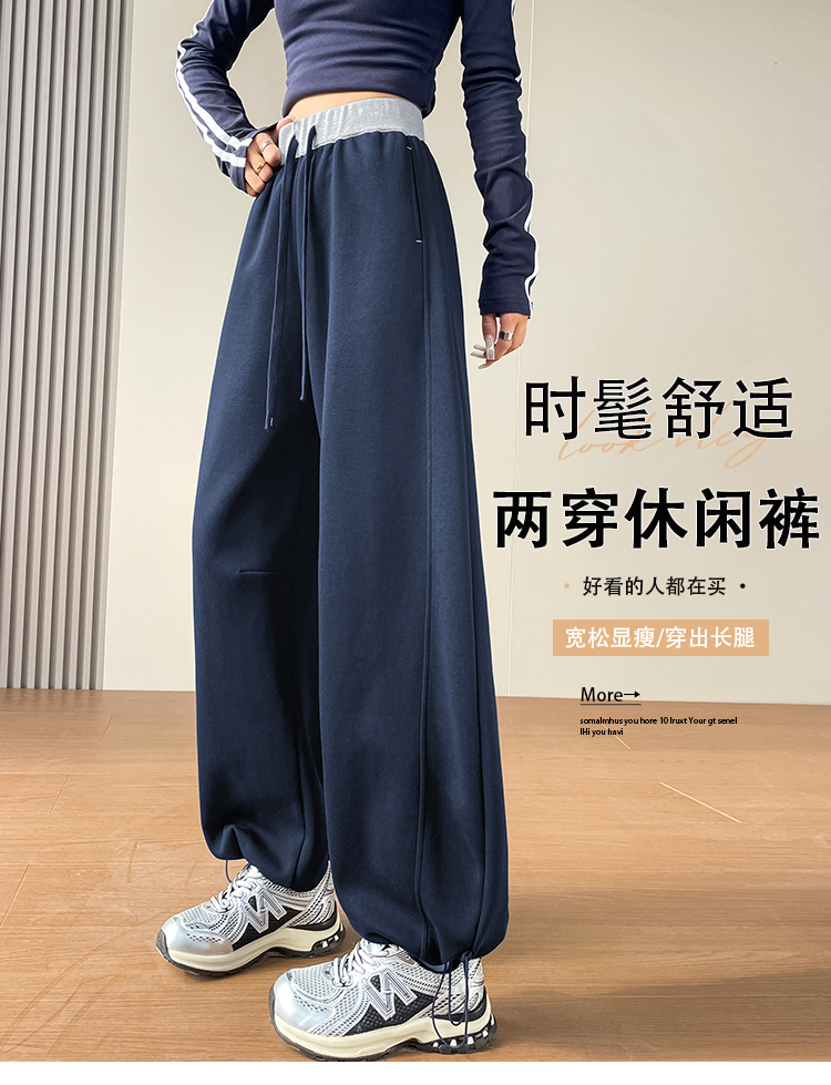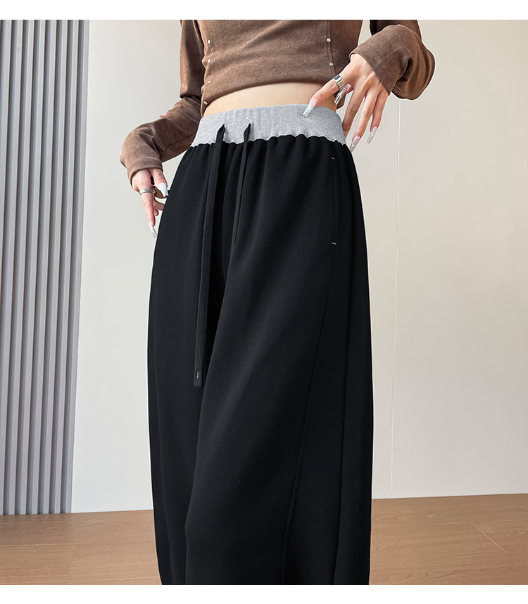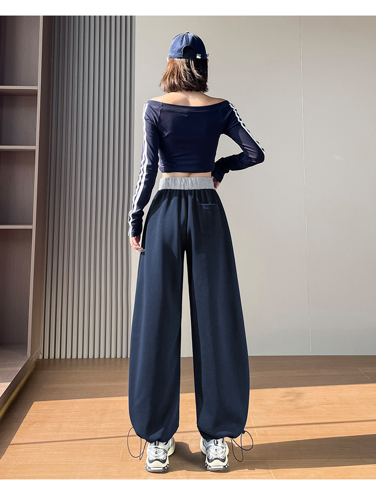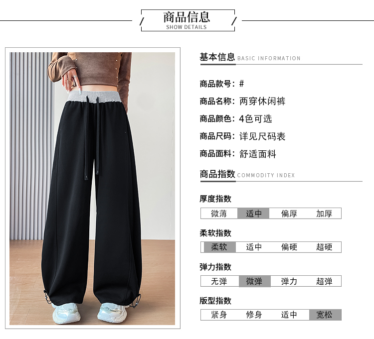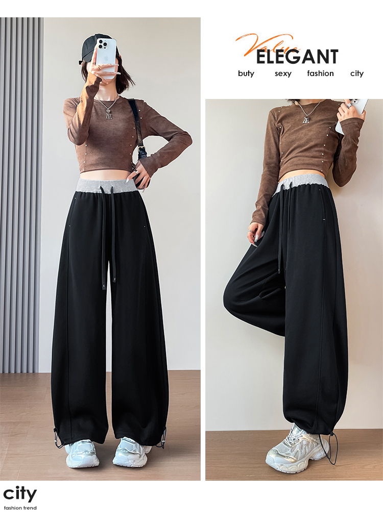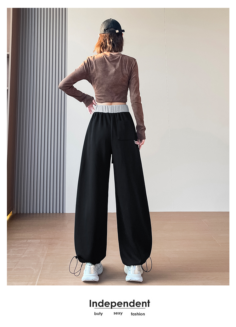 MY13603# 时尚高腰拼接阔腿束脚两穿弯刀裤百搭休闲运动卫裤女裝貨源服裝批發