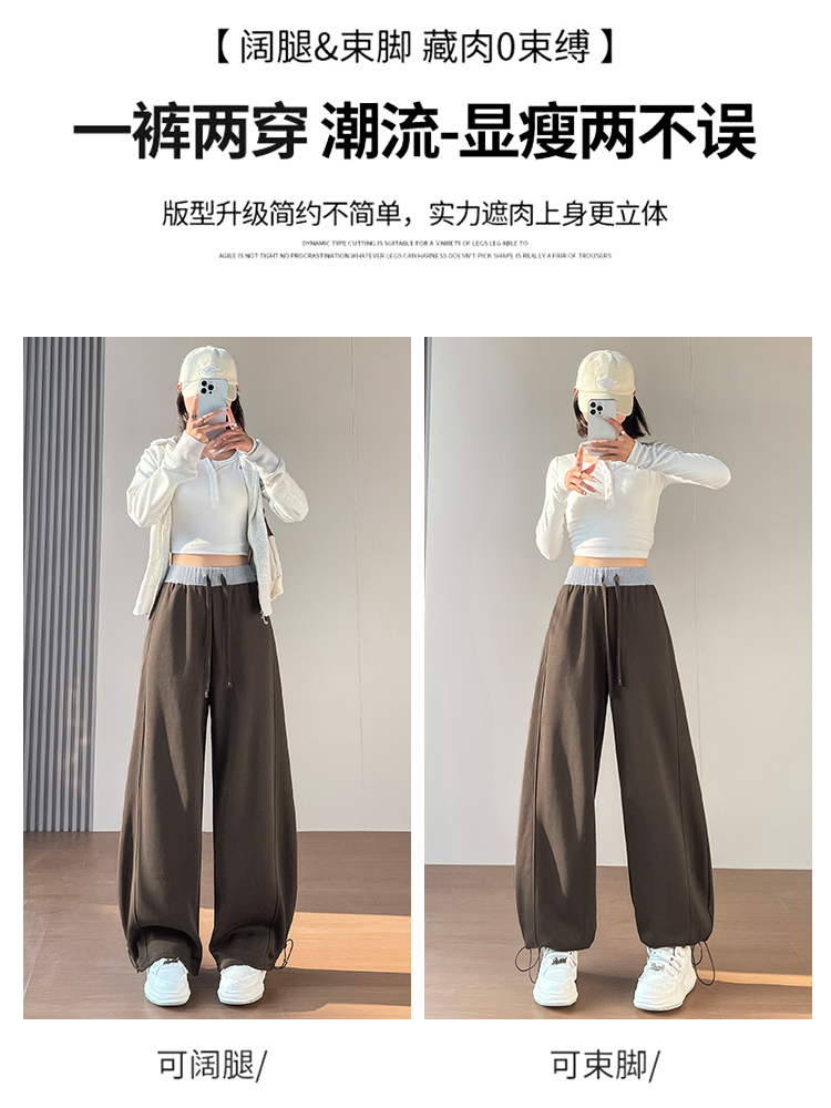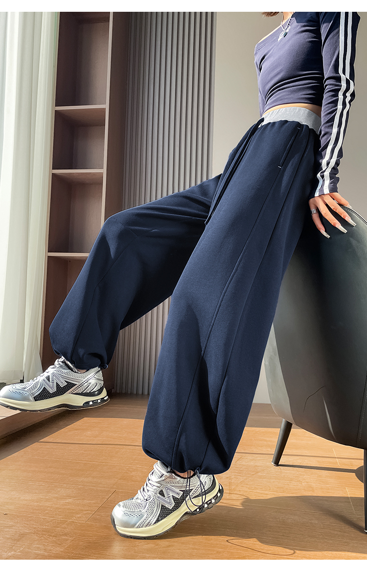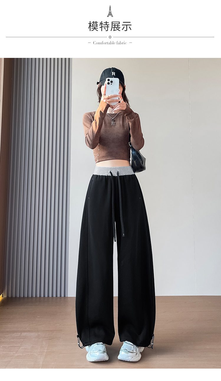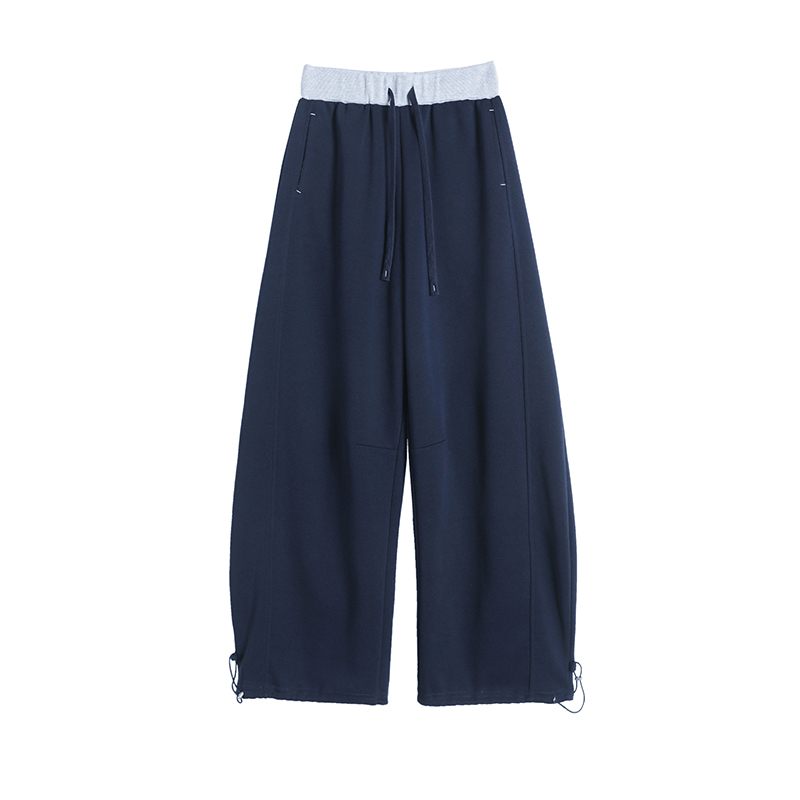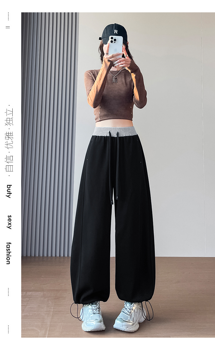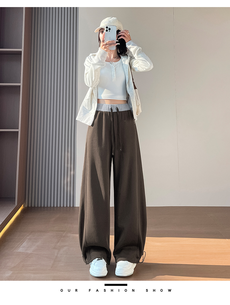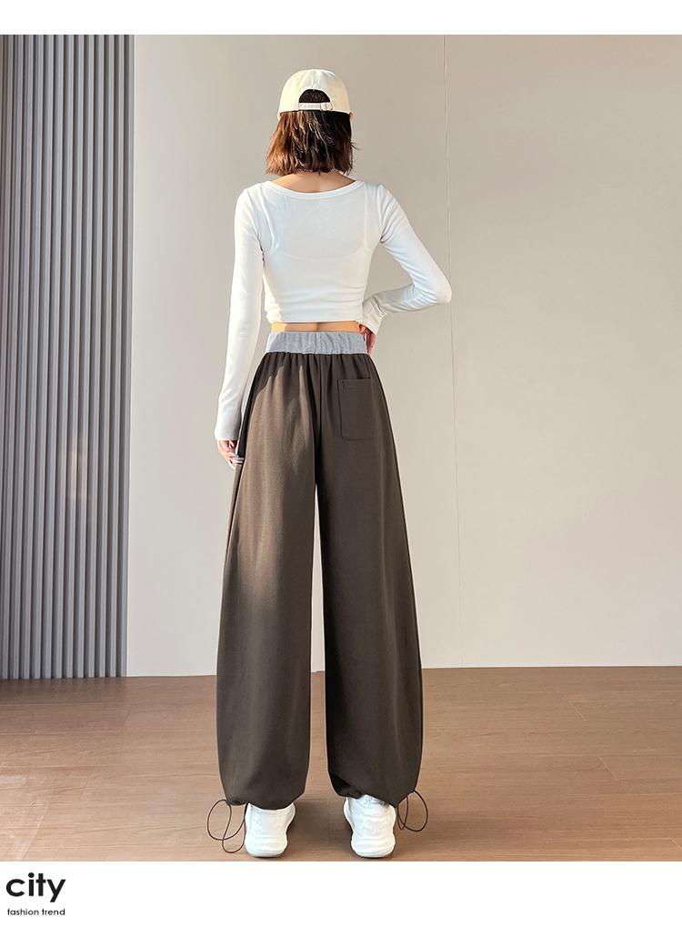MY13603# 时尚高腰拼接阔腿束脚两穿弯刀裤百搭休闲运动卫裤女裝貨源服裝批發