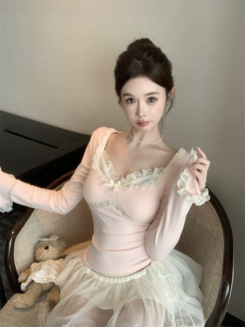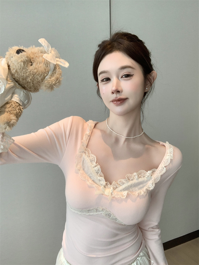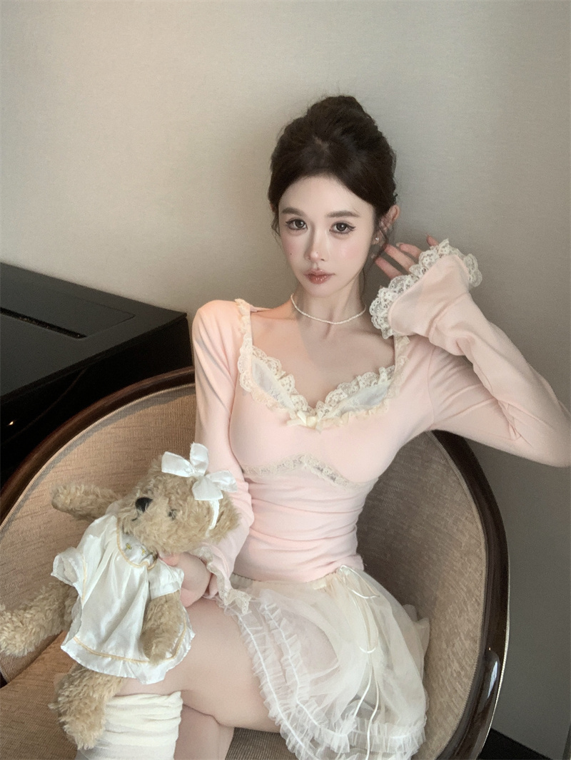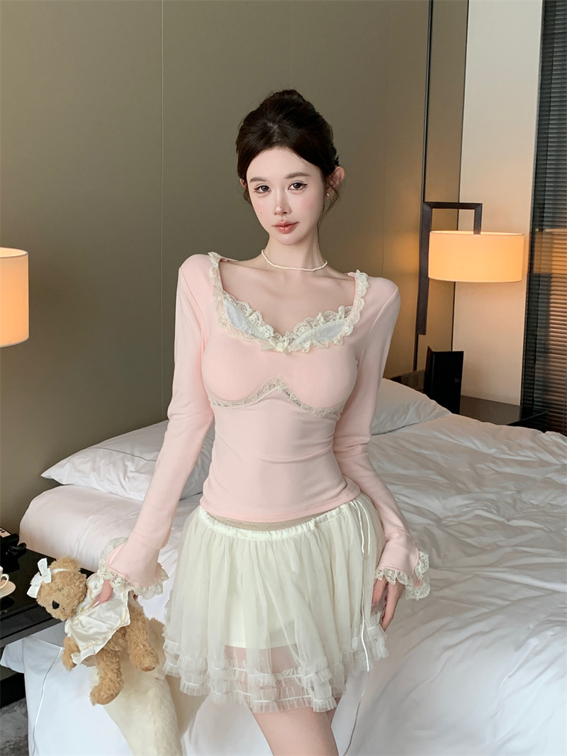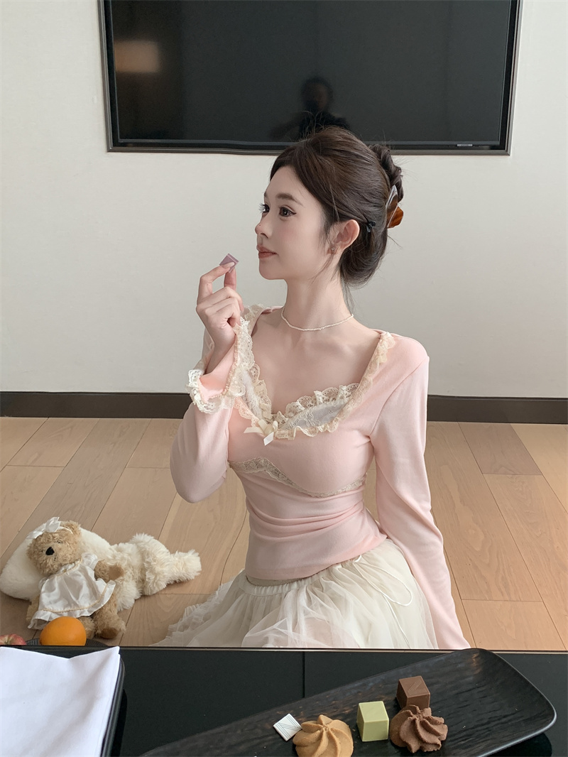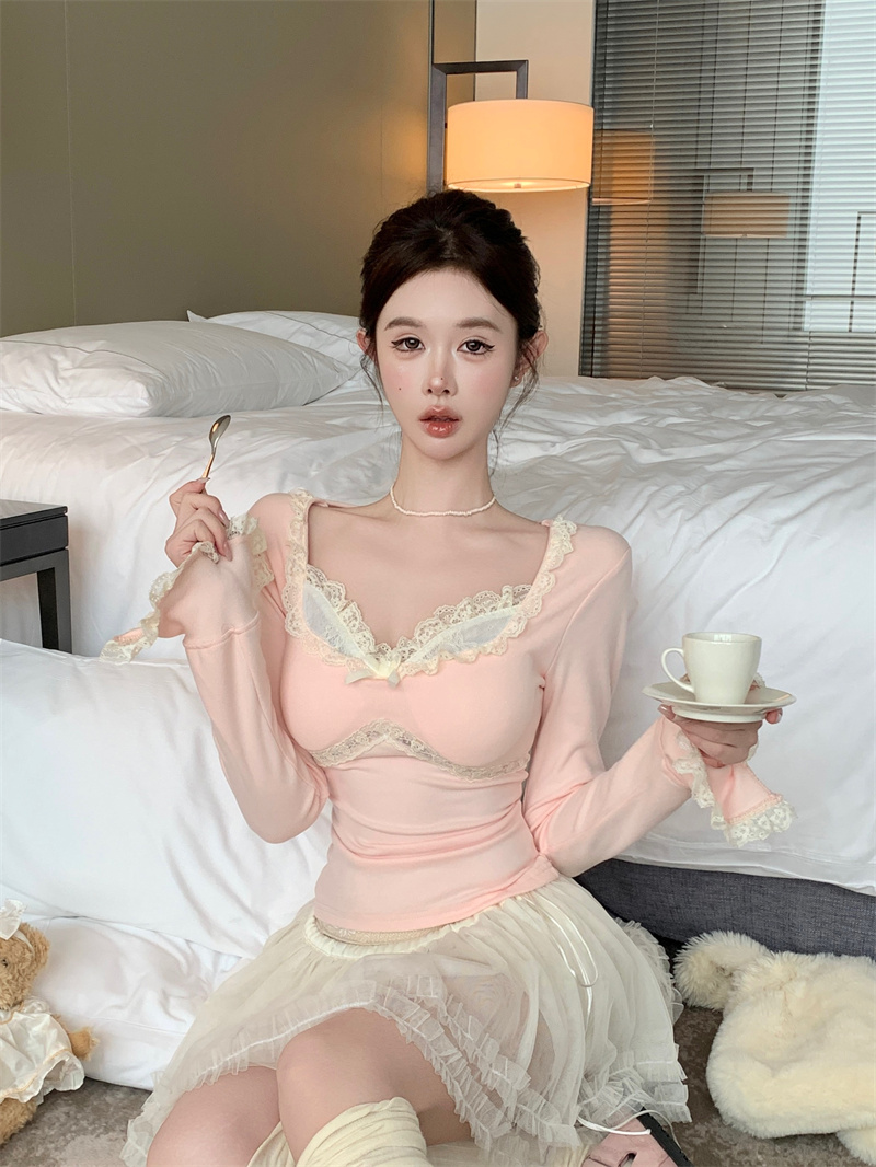 MY13661# 维斯小姐香草甜酒精致甜系少女收腰针织法蕾打底上衣女女裝貨源服裝批發