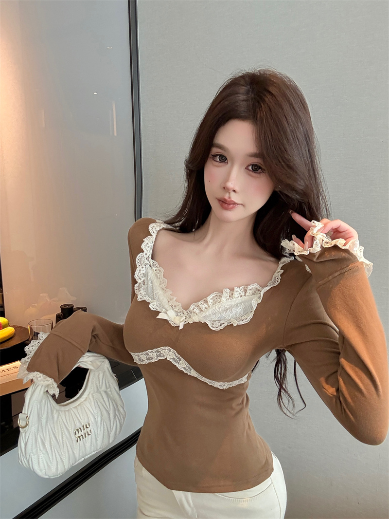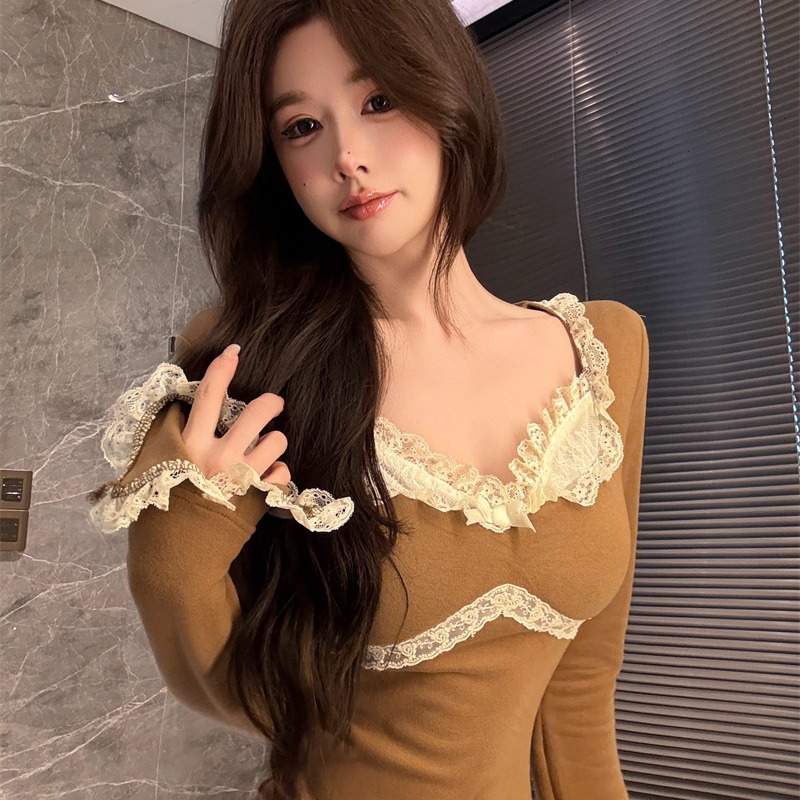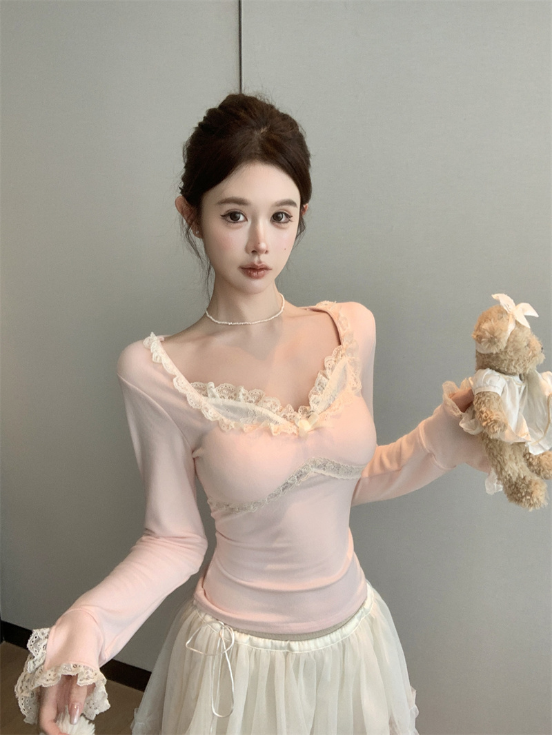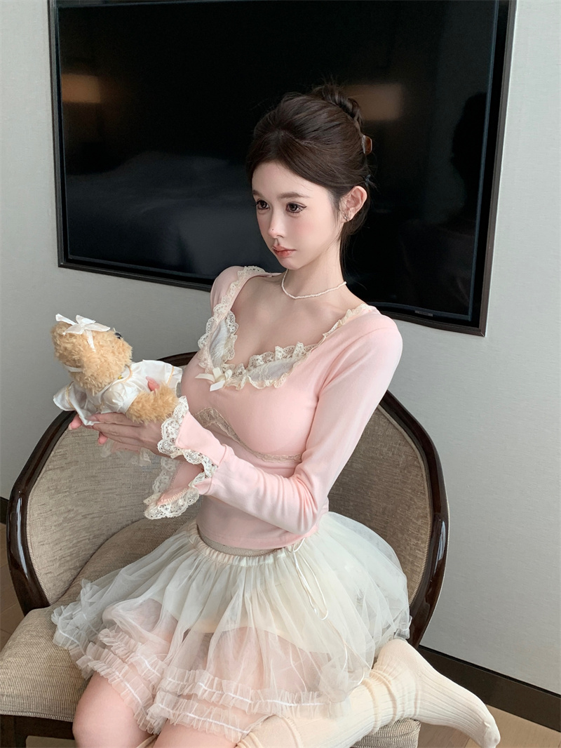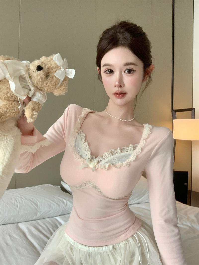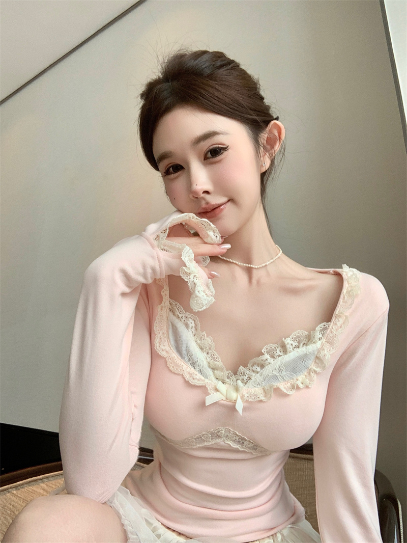 MY13661# 维斯小姐香草甜酒精致甜系少女收腰针织法蕾打底上衣女女裝貨源服裝批發