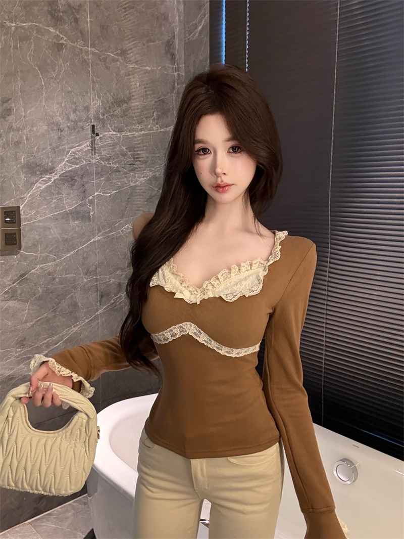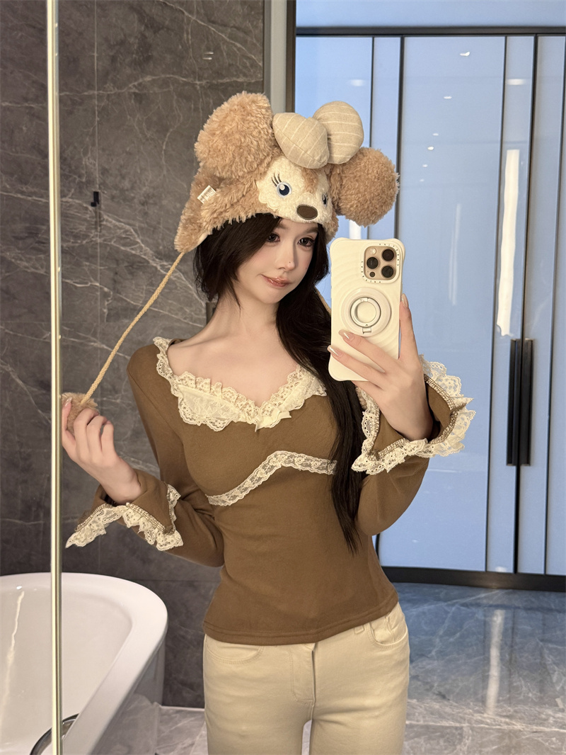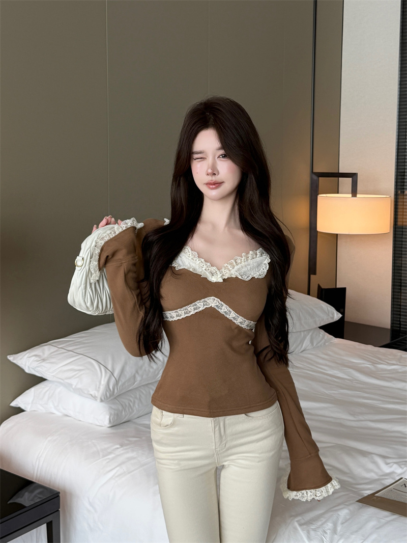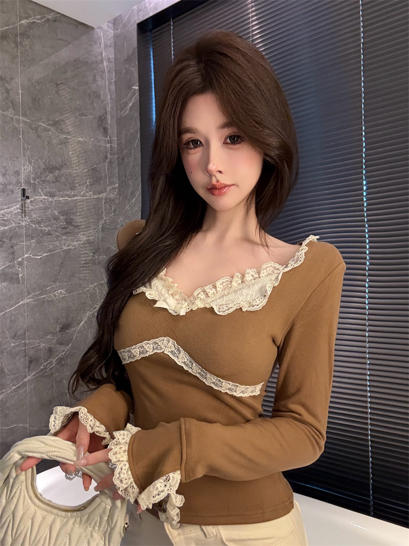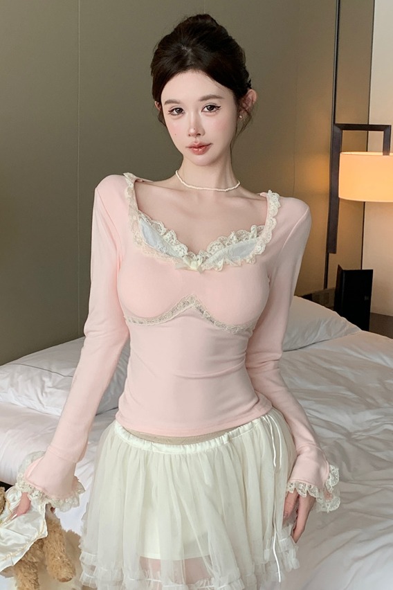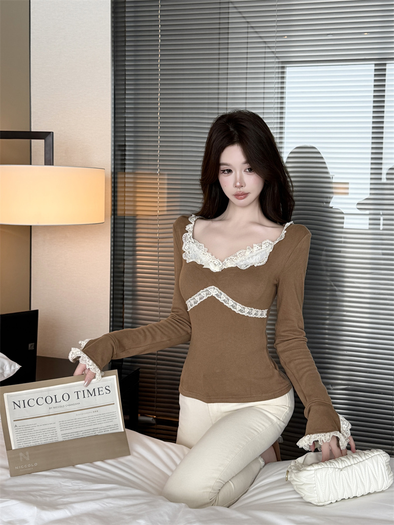MY13661# 维斯小姐香草甜酒精致甜系少女收腰针织法蕾打底上衣女女裝貨源服裝批發