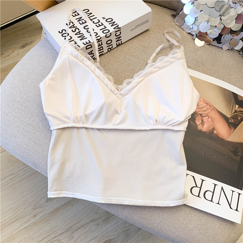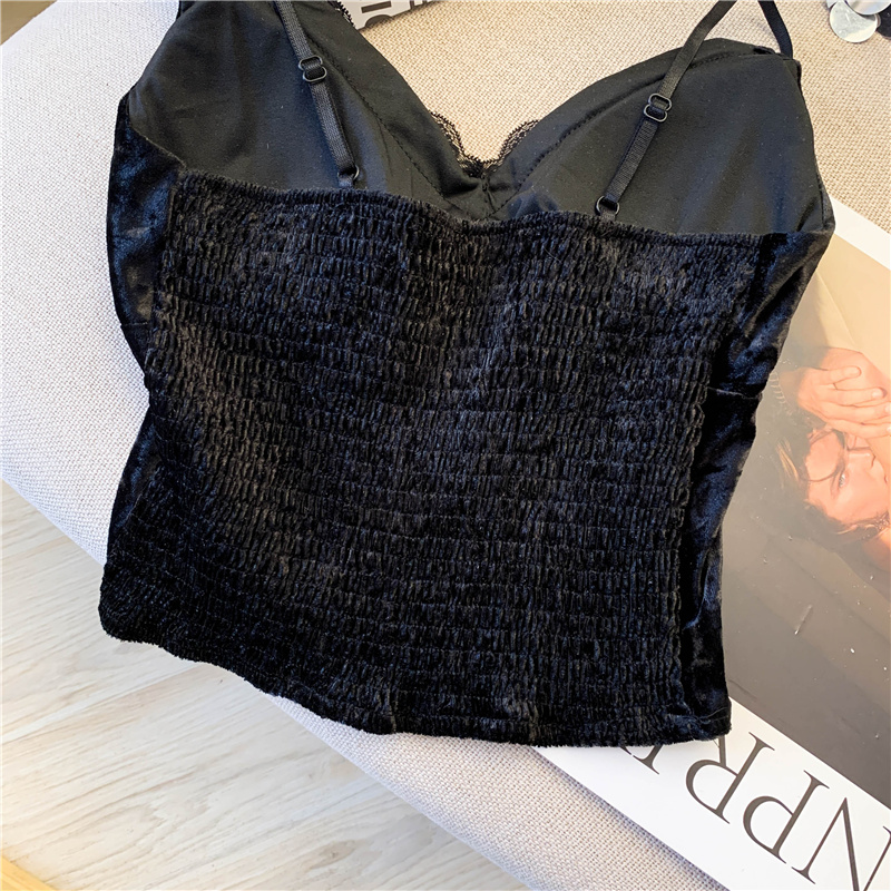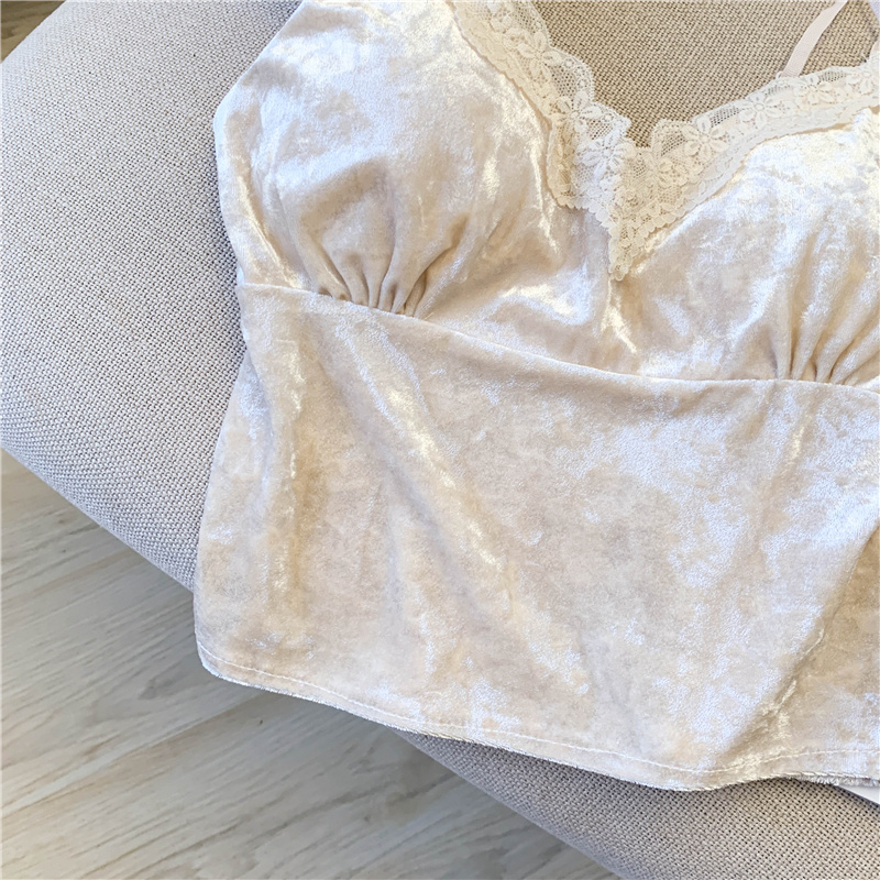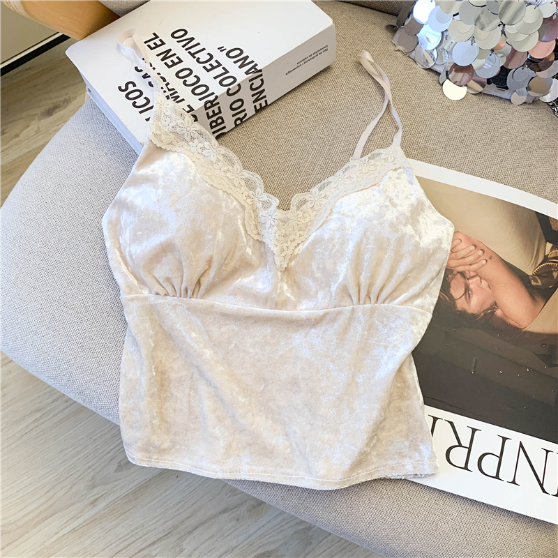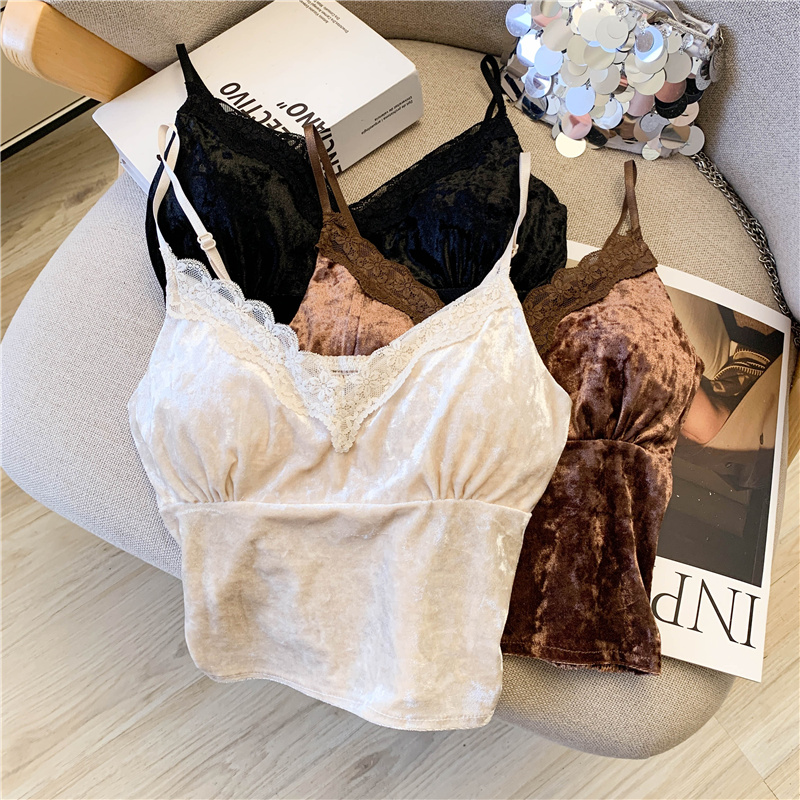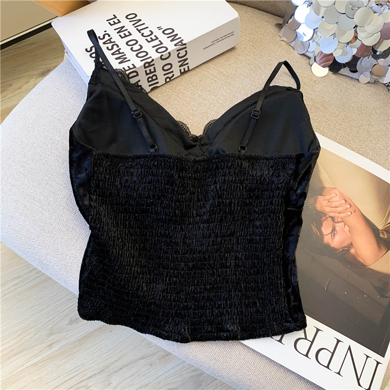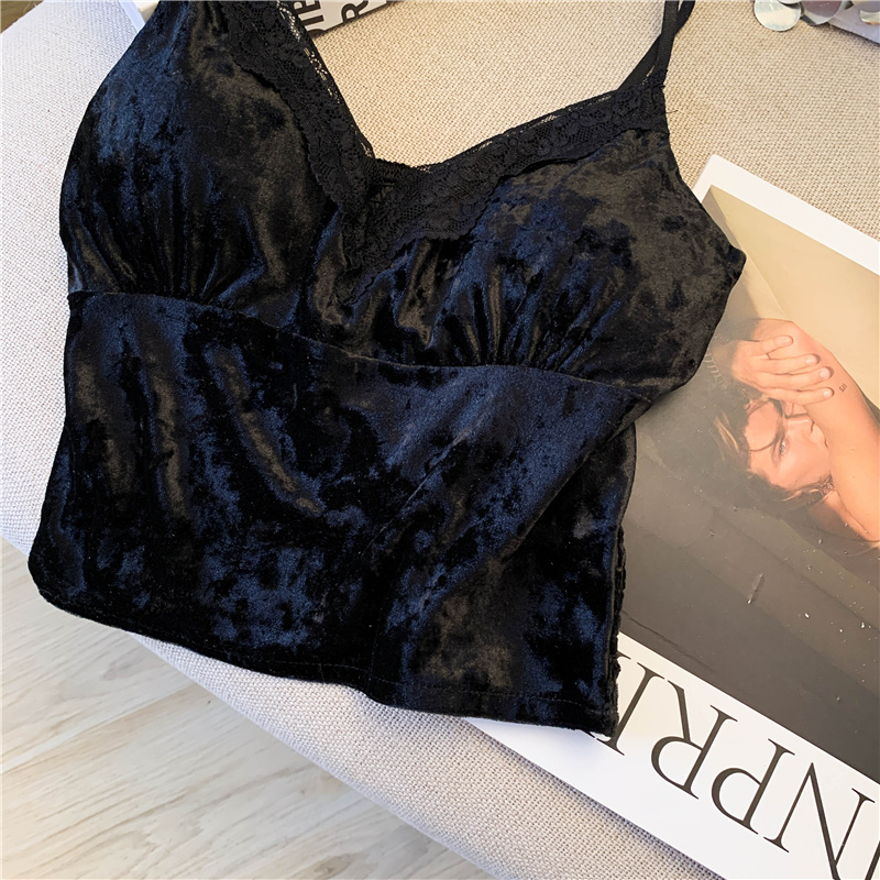 MY13662# 新款蕾丝拼接丝绒吊带带胸垫内搭打底美背上衣女裝貨源服裝批發