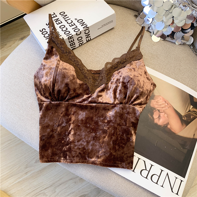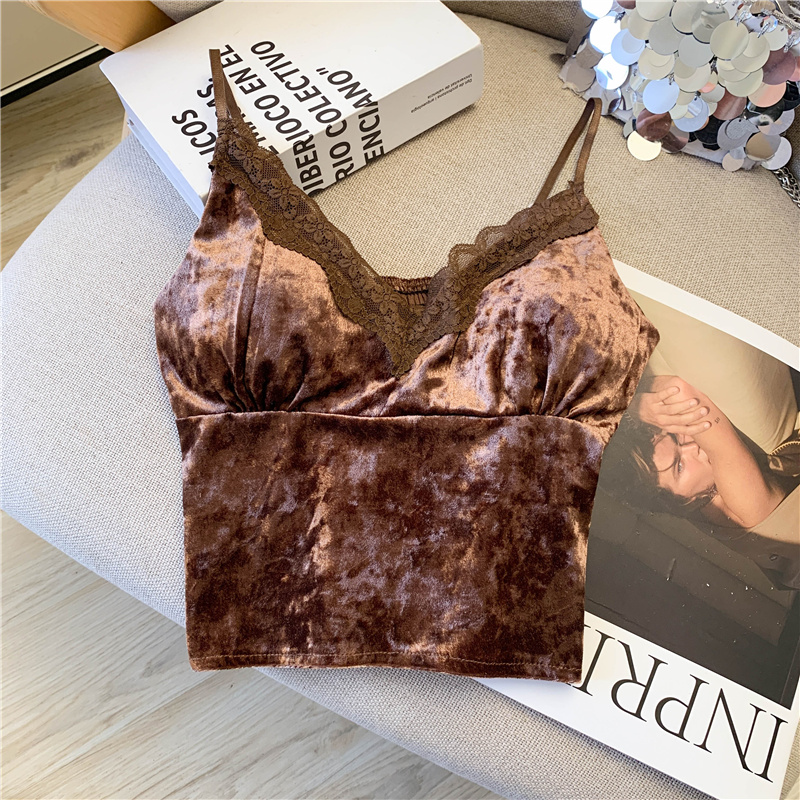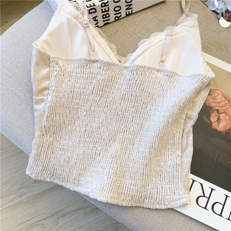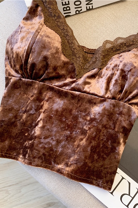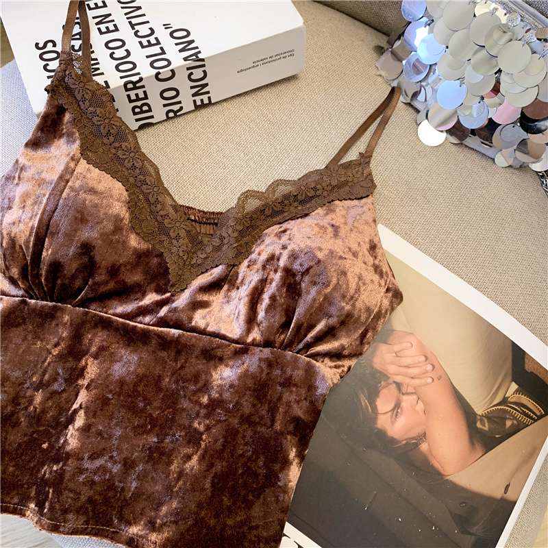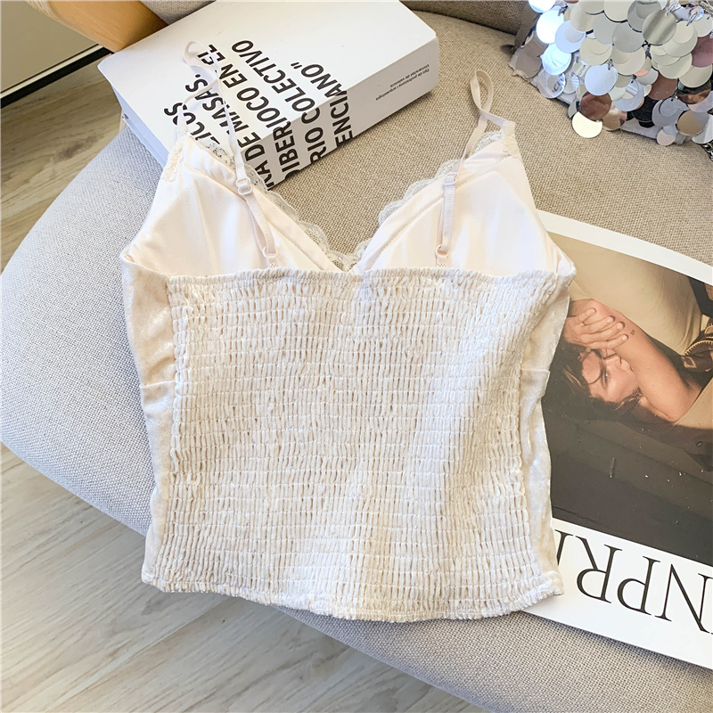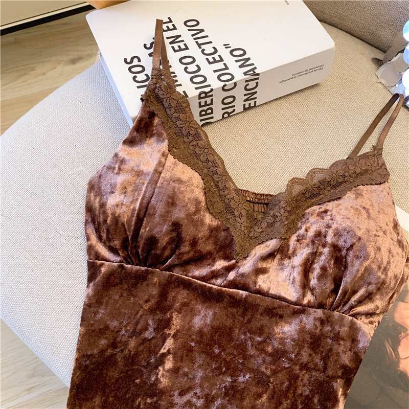 MY13662# 新款蕾丝拼接丝绒吊带带胸垫内搭打底美背上衣女裝貨源服裝批發