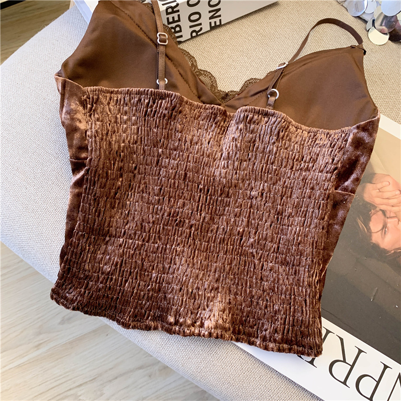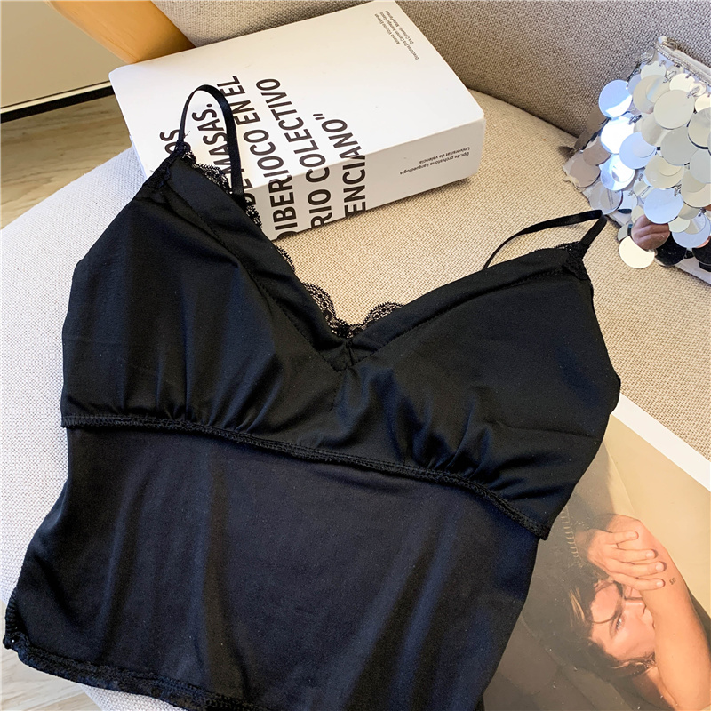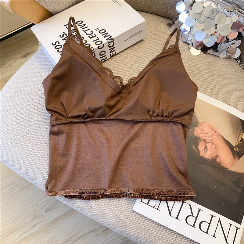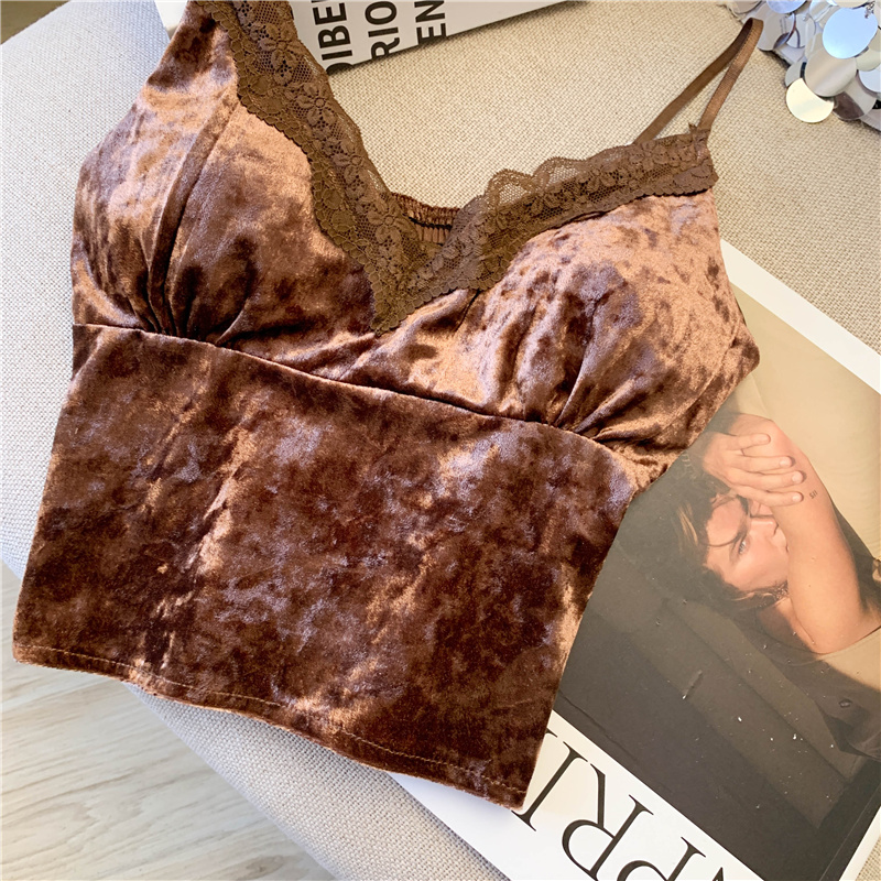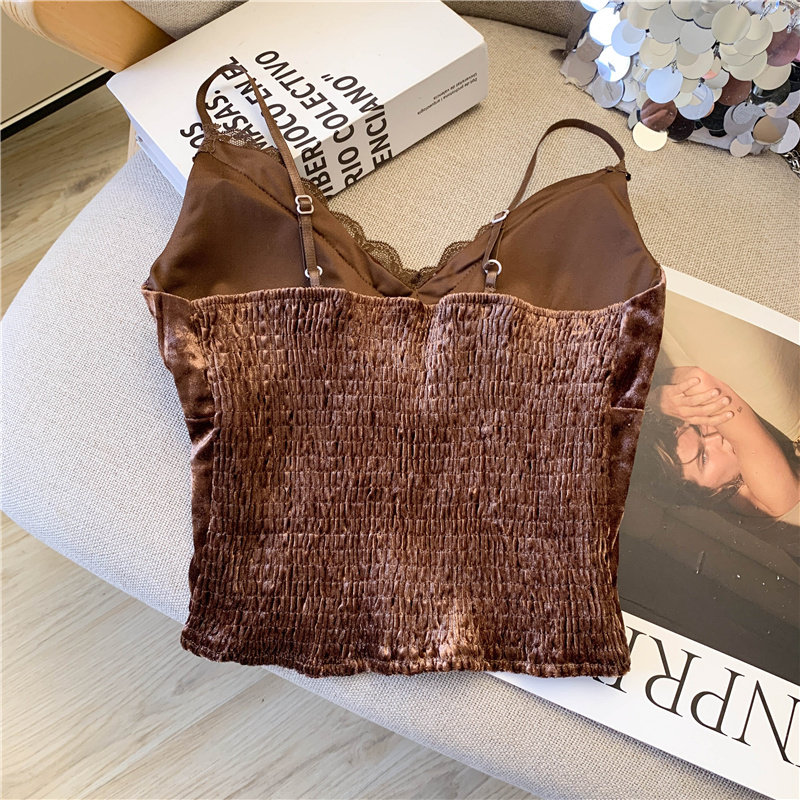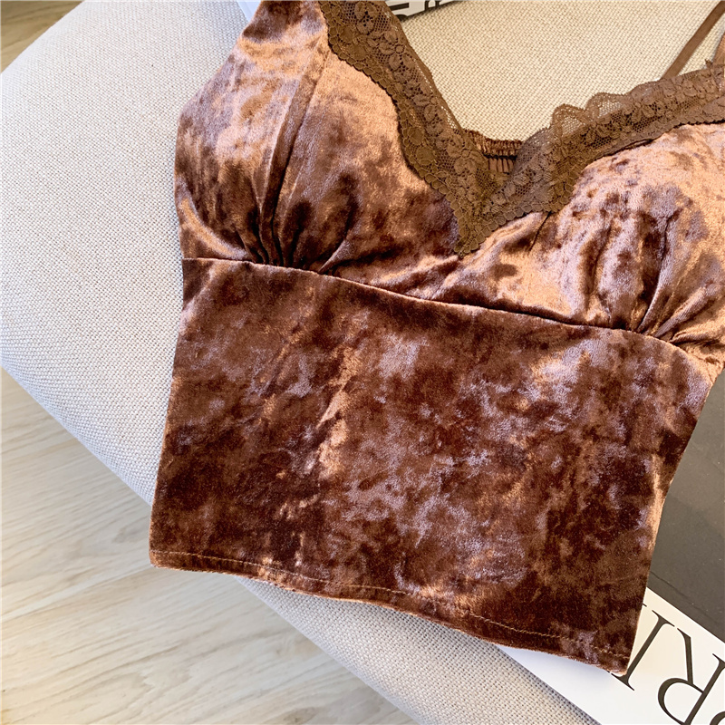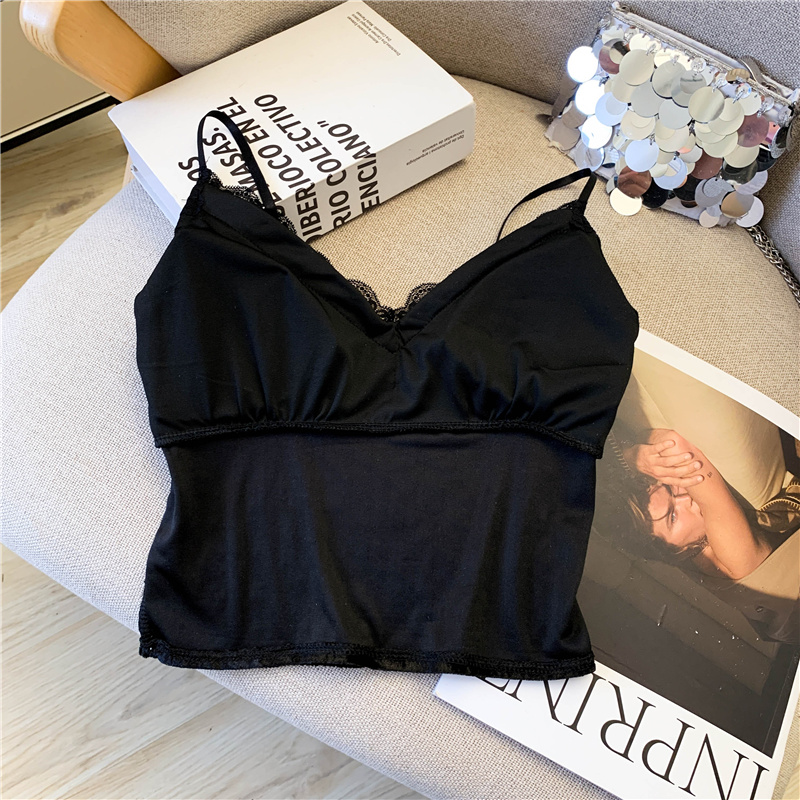 MY13662# 新款蕾丝拼接丝绒吊带带胸垫内搭打底美背上衣女裝貨源服裝批發