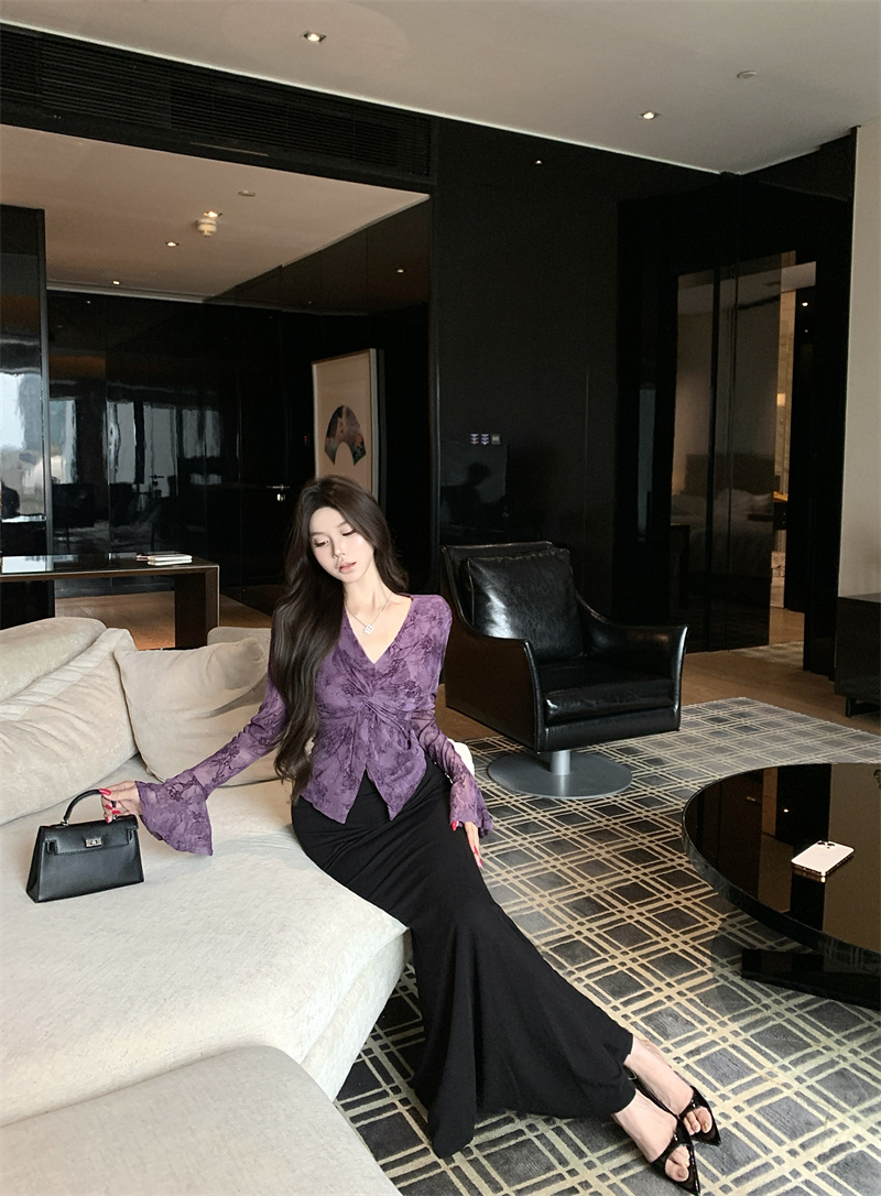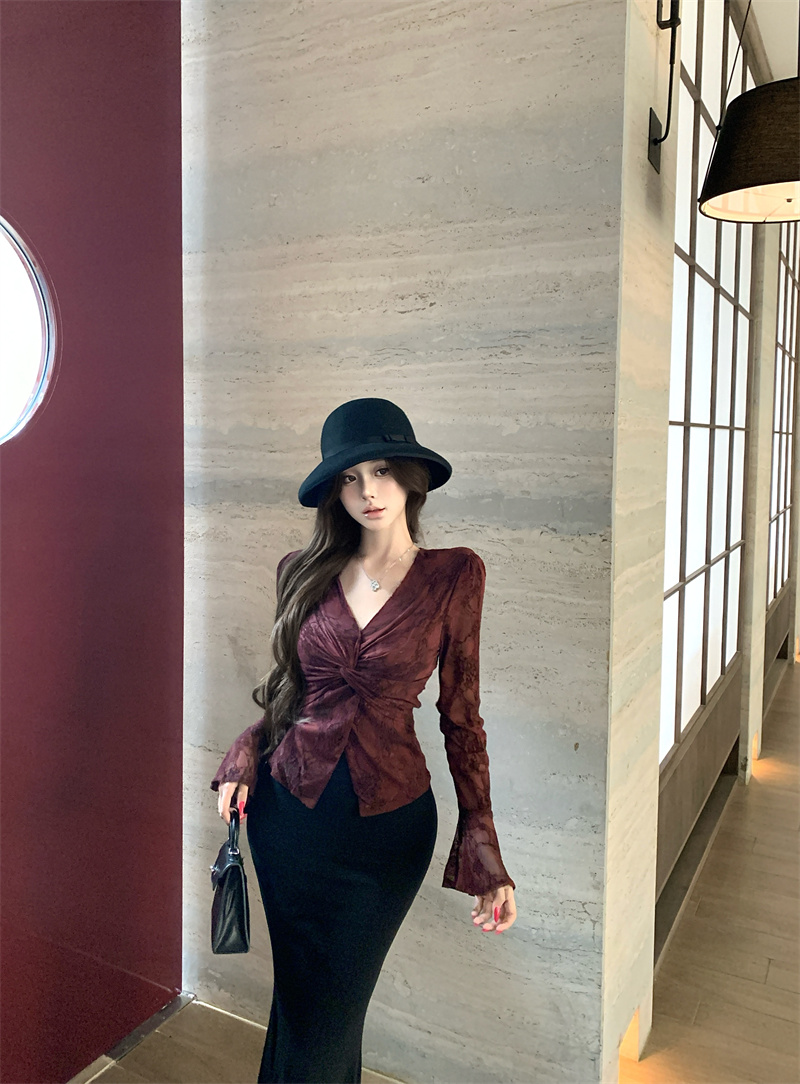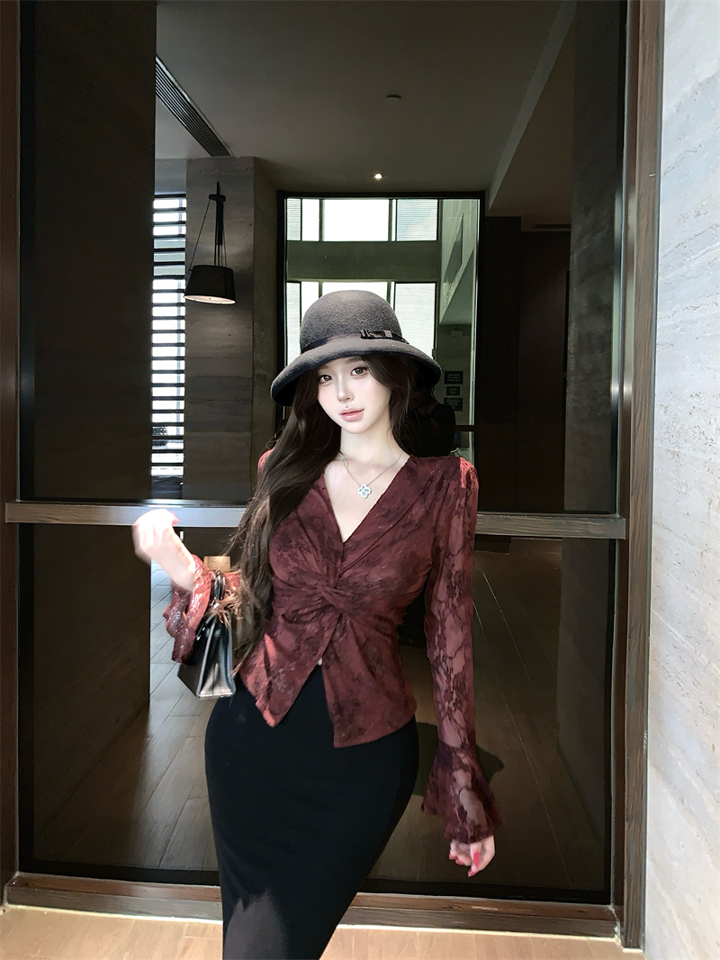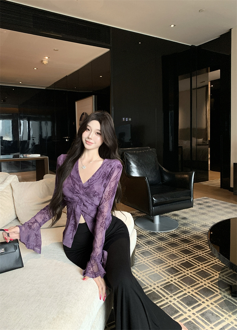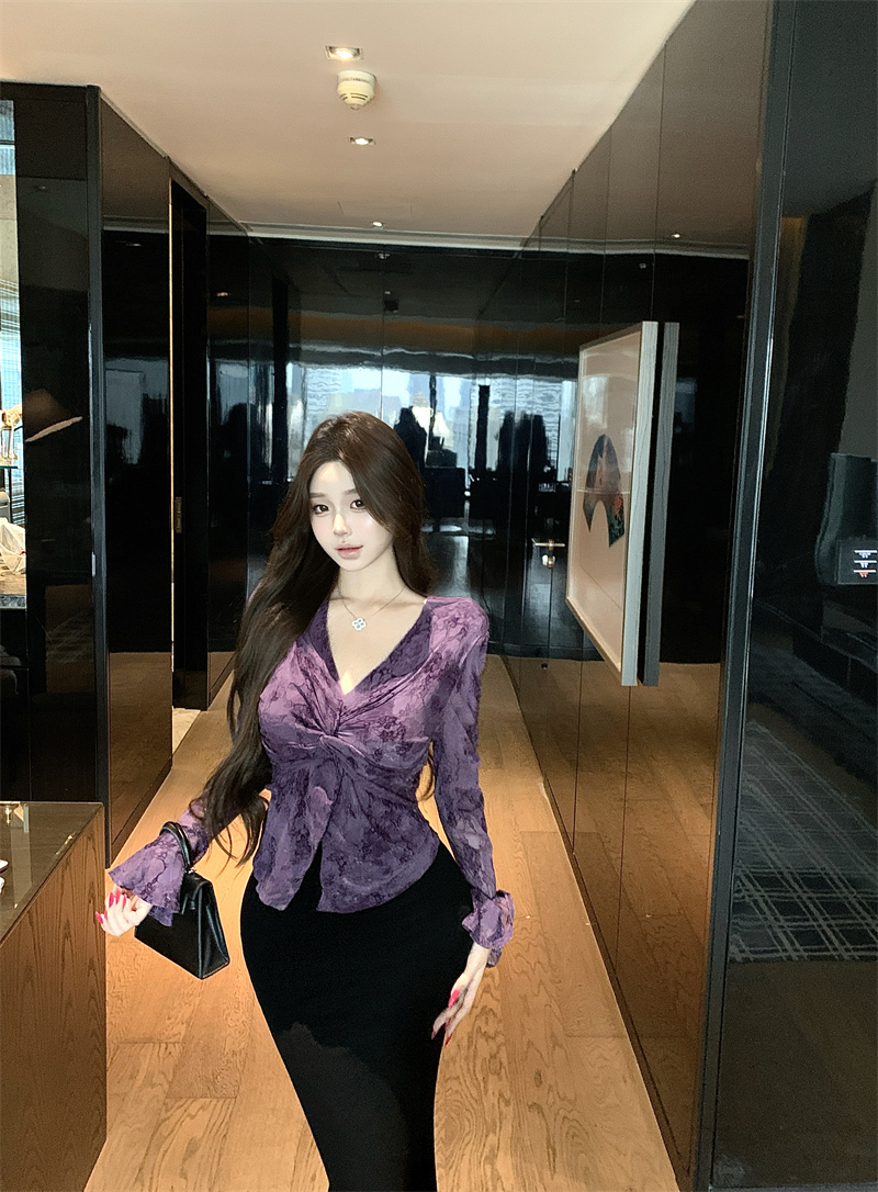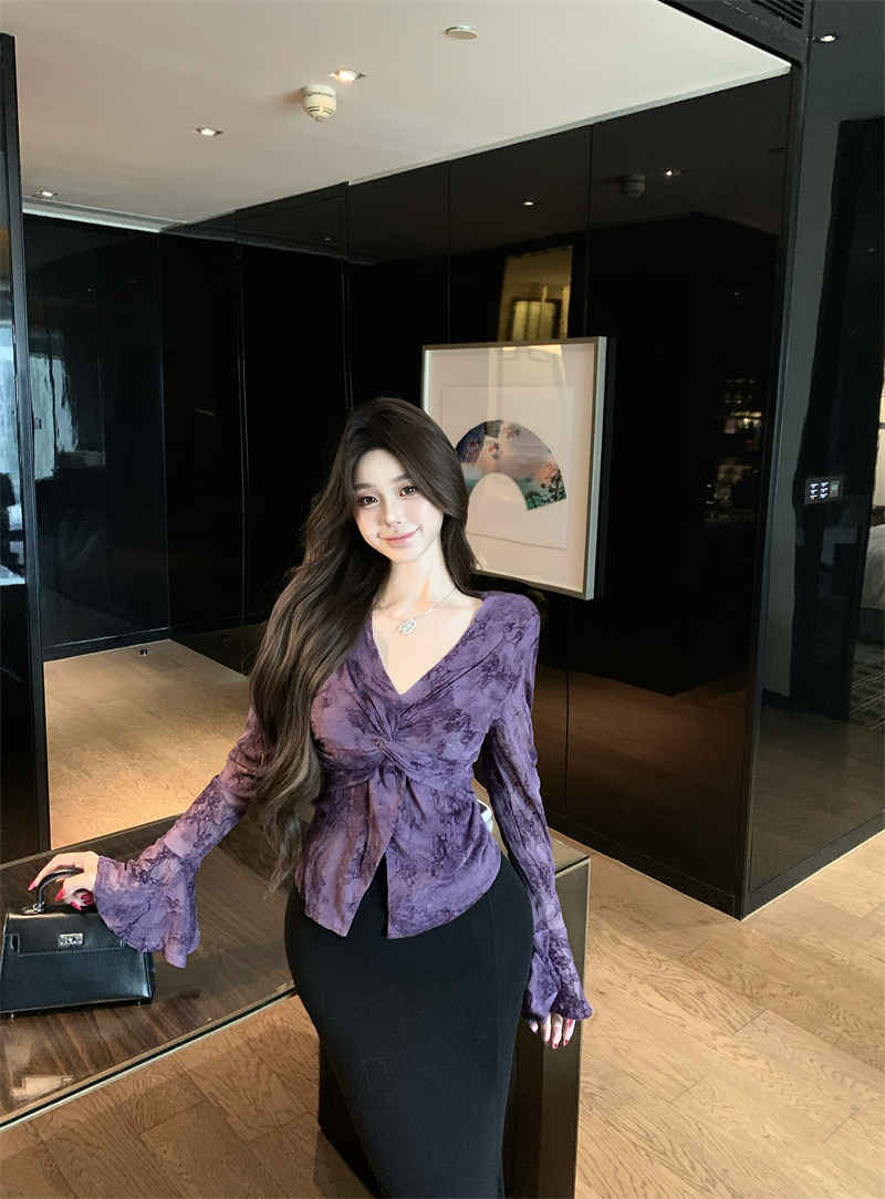 MY13678# 法式轻奢高级感喇叭袖衬衫秋季新款气质收腰纽结上衣女女裝貨源服裝批發