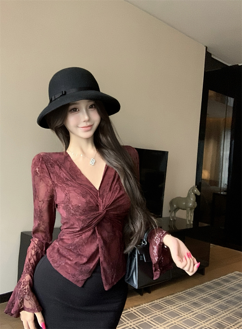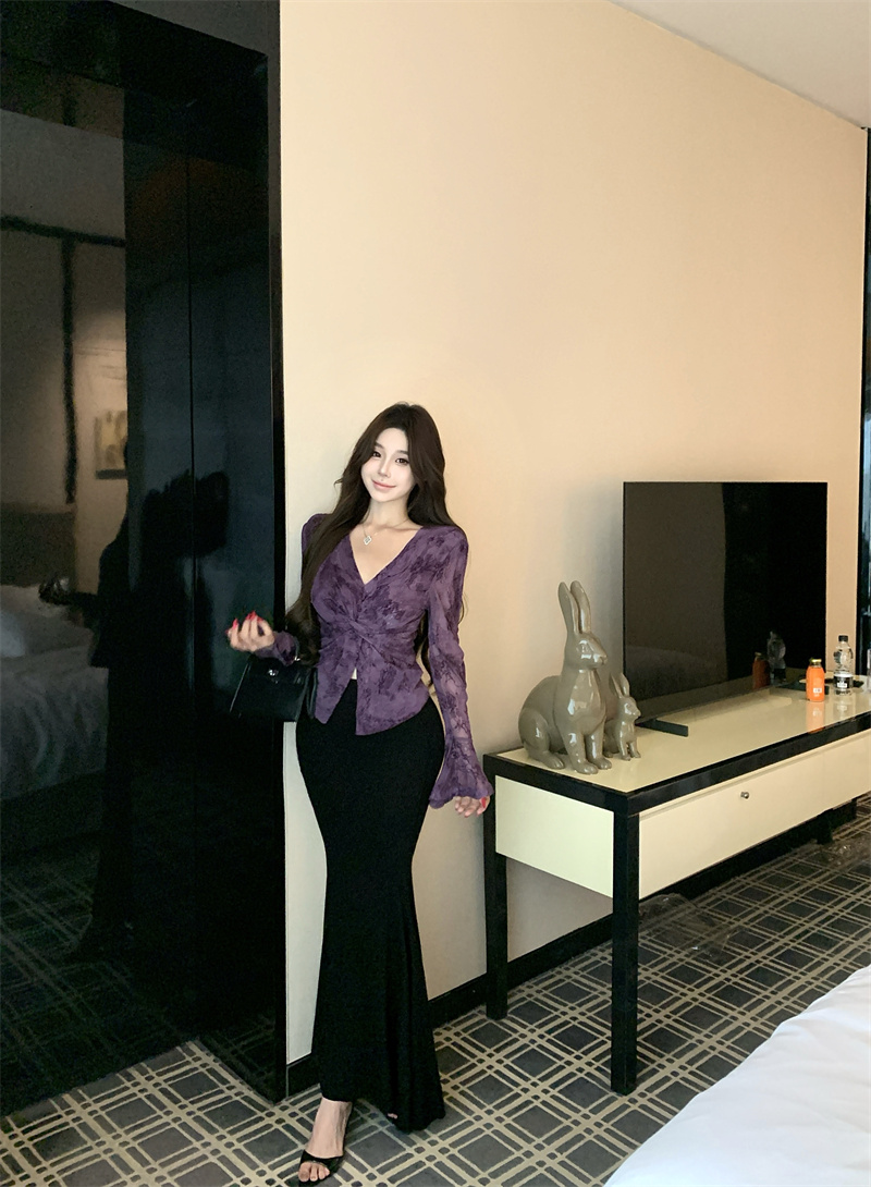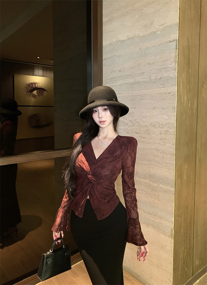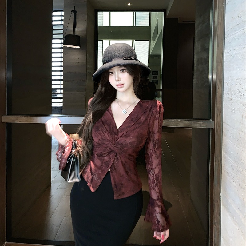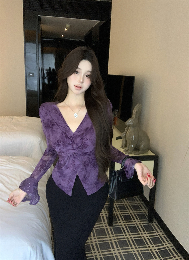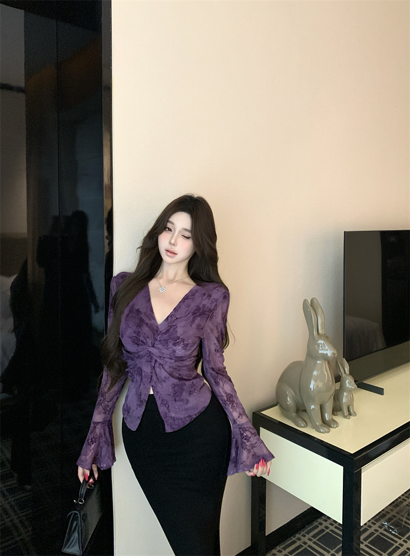 MY13678# 法式轻奢高级感喇叭袖衬衫秋季新款气质收腰纽结上衣女女裝貨源服裝批發