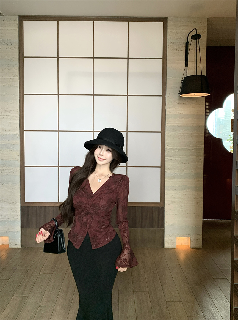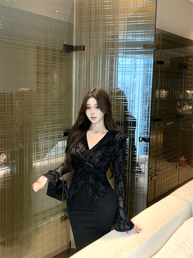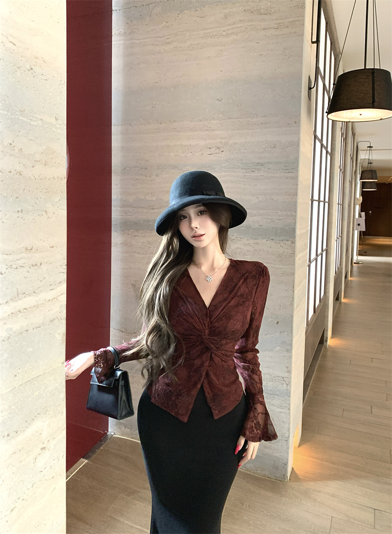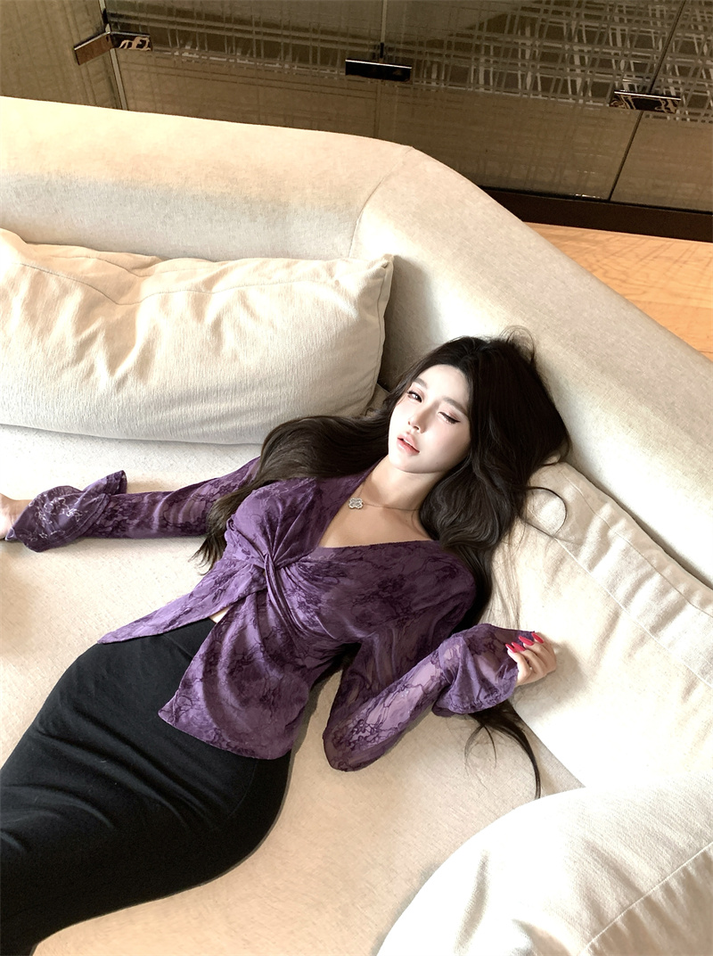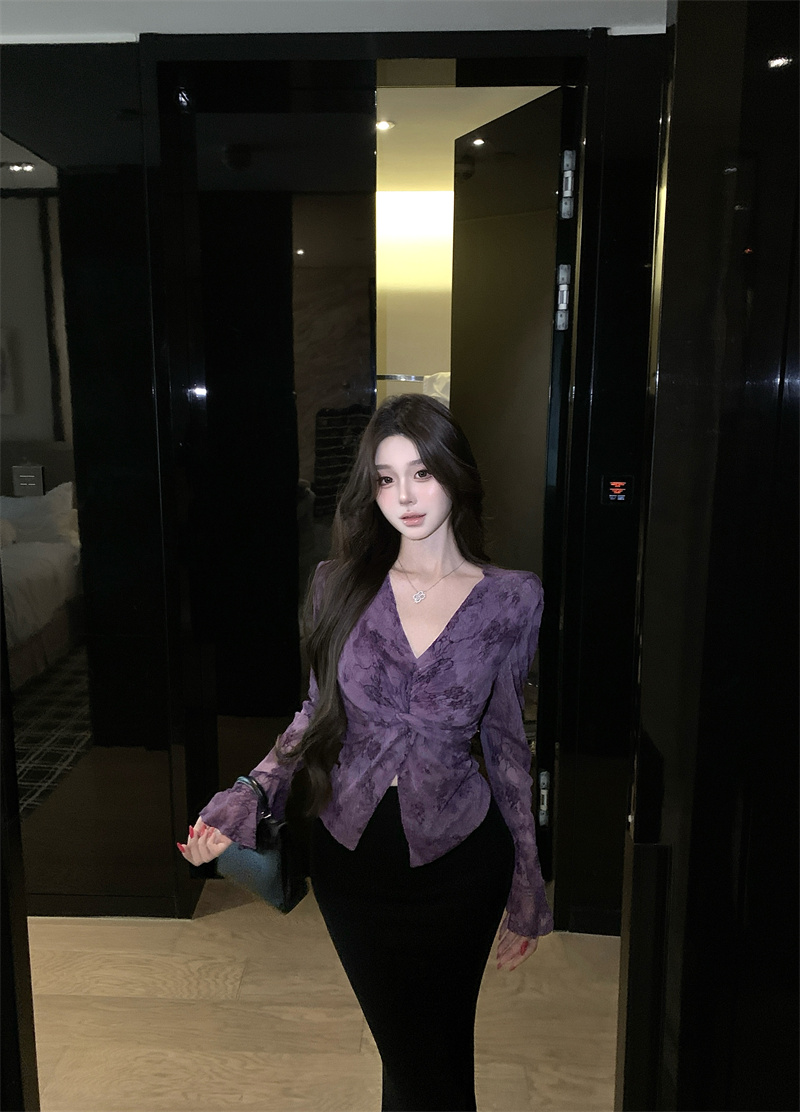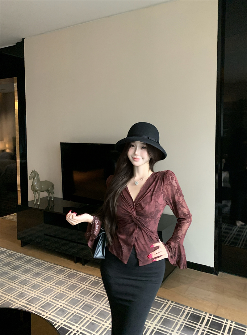 MY13678# 法式轻奢高级感喇叭袖衬衫秋季新款气质收腰纽结上衣女女裝貨源服裝批發