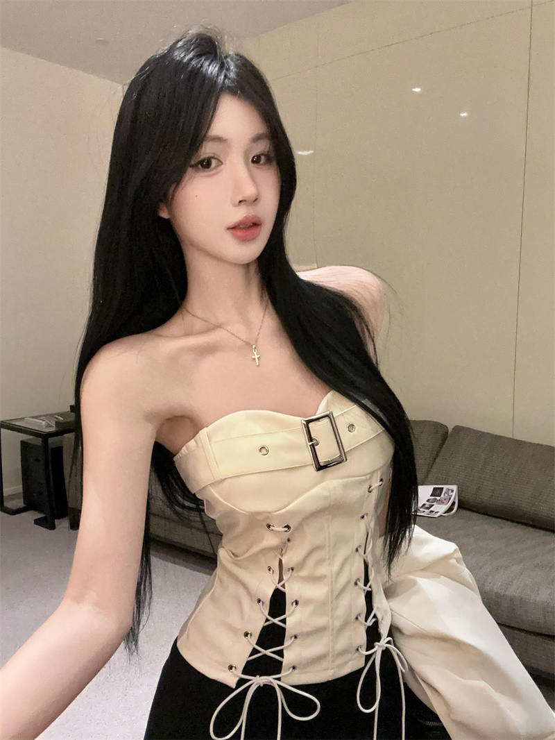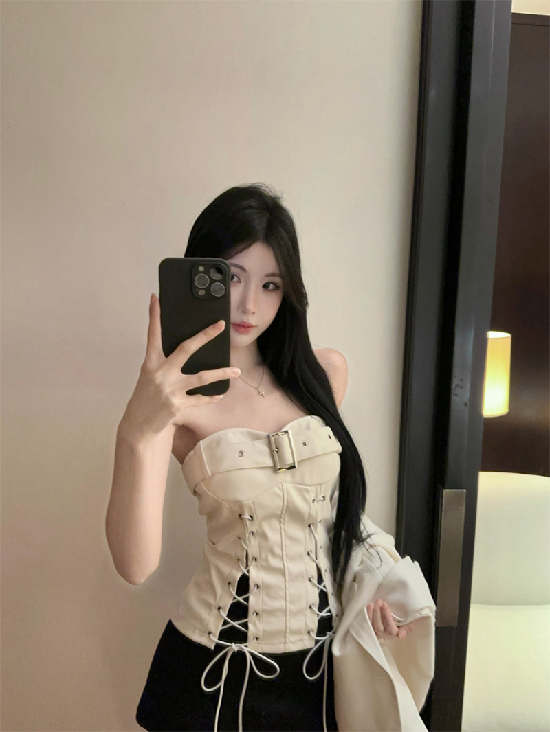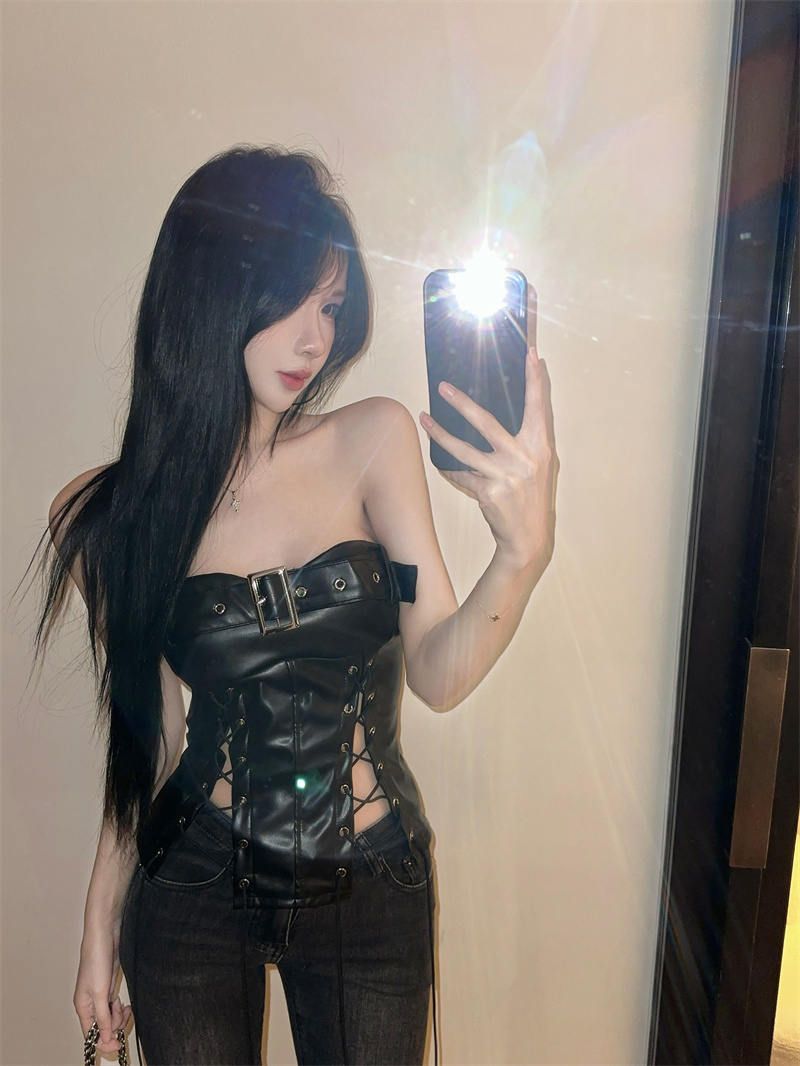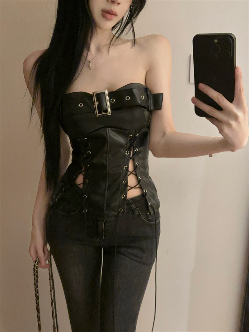 MY13679# 纯欲性感辣妹绑带开叉收腰抹胸背心PU皮系带裹胸上衣女女裝貨源服裝批發