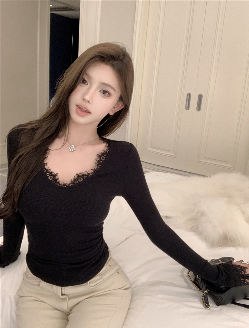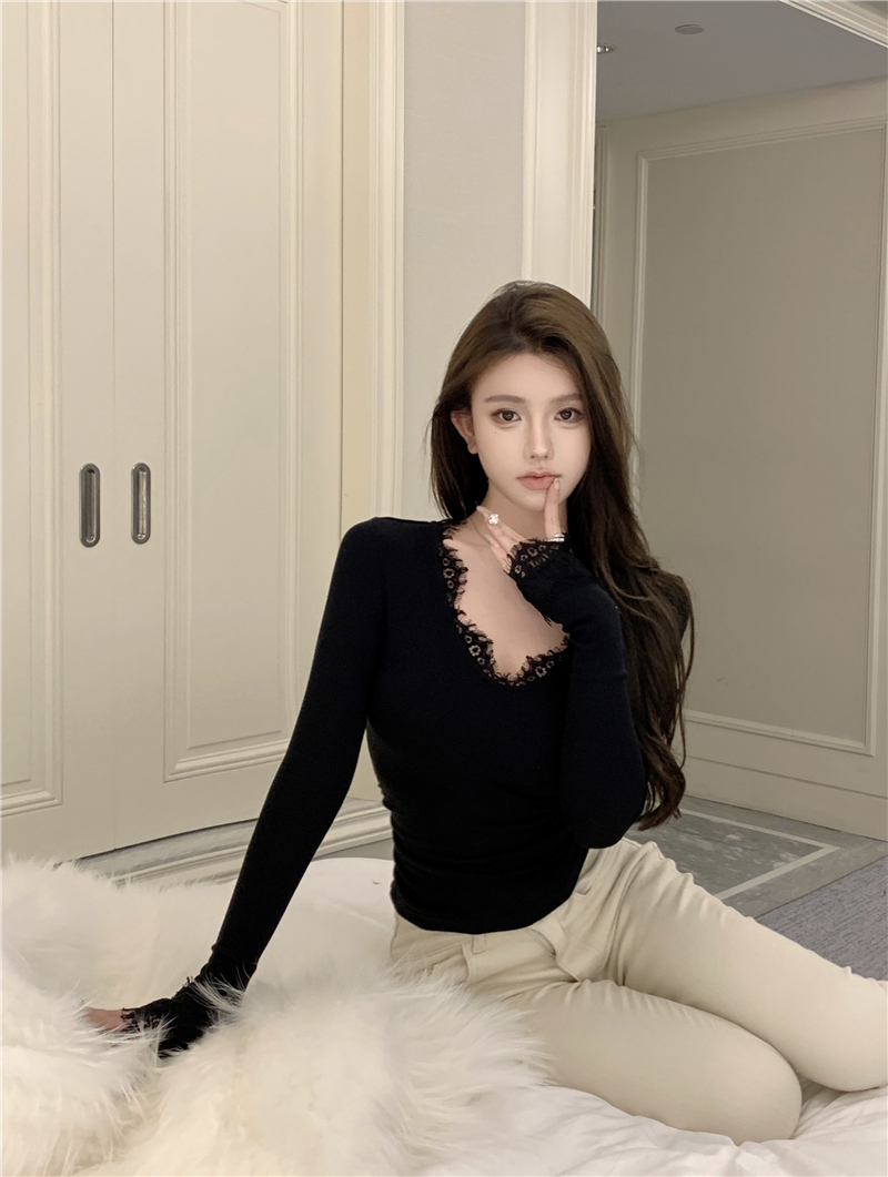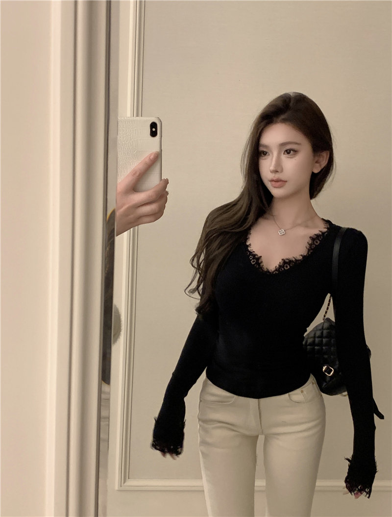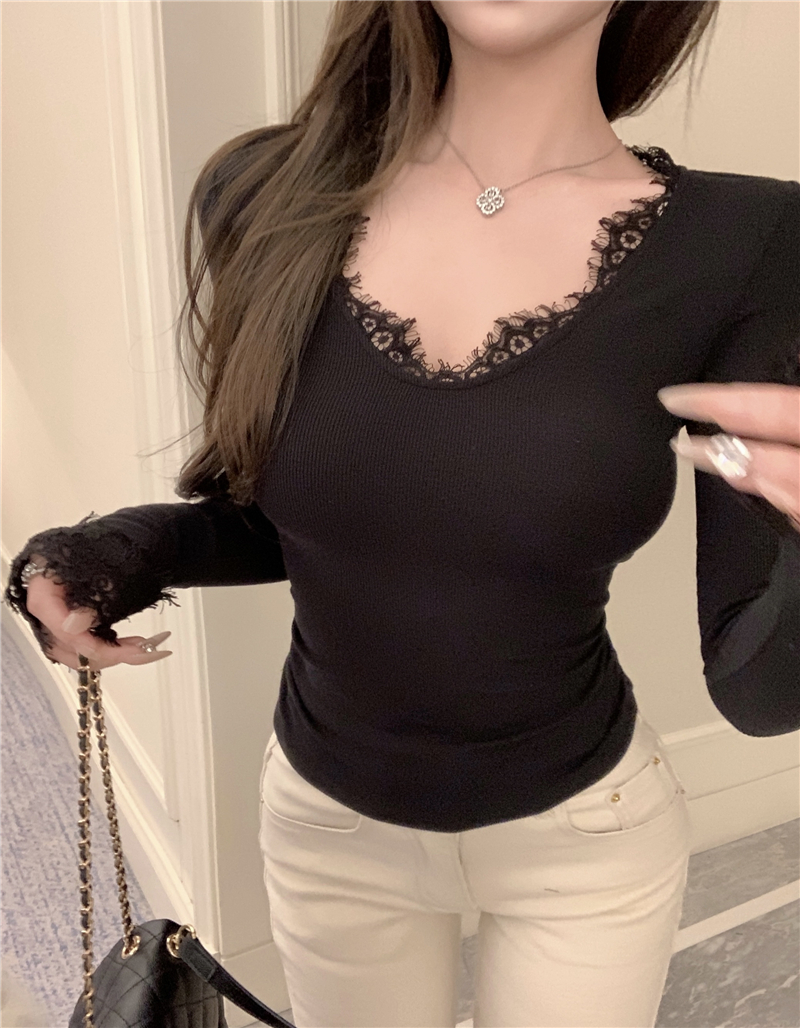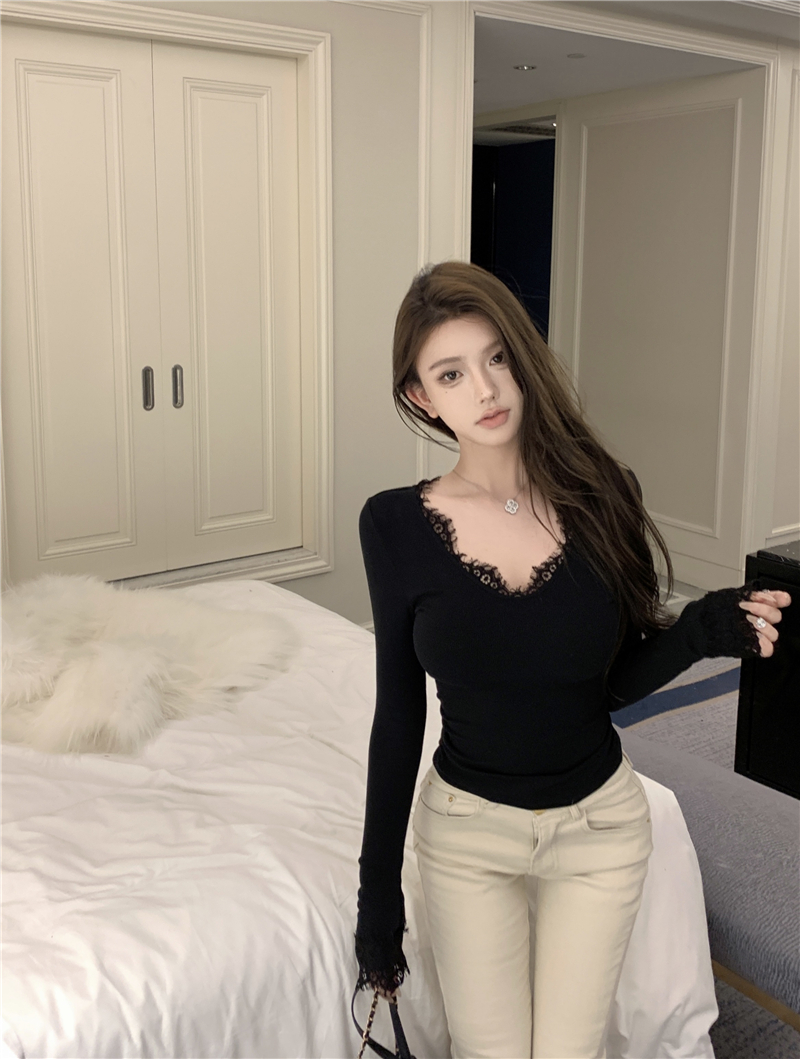 MY13685# 基础款 自留!蕾丝睫毛边V领打底上衣女裝貨源服裝批發
