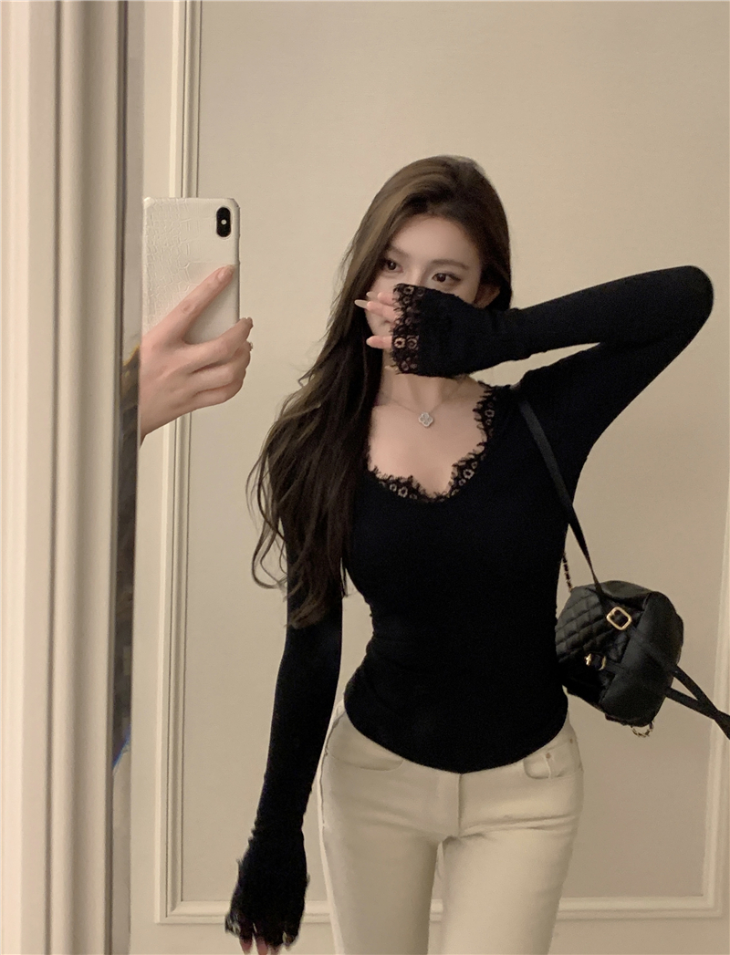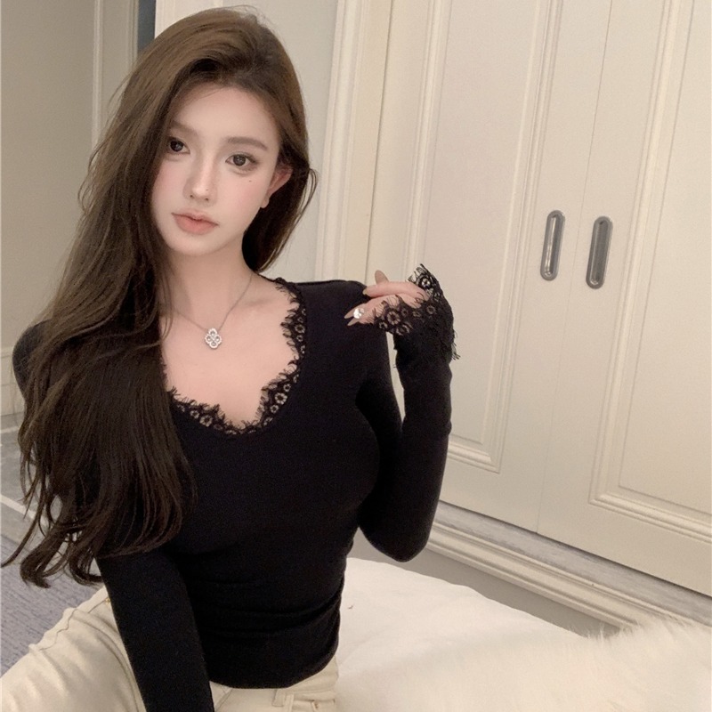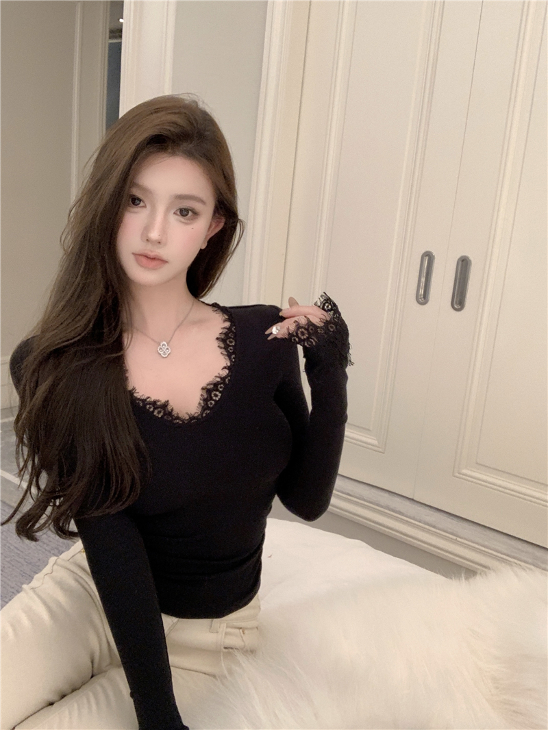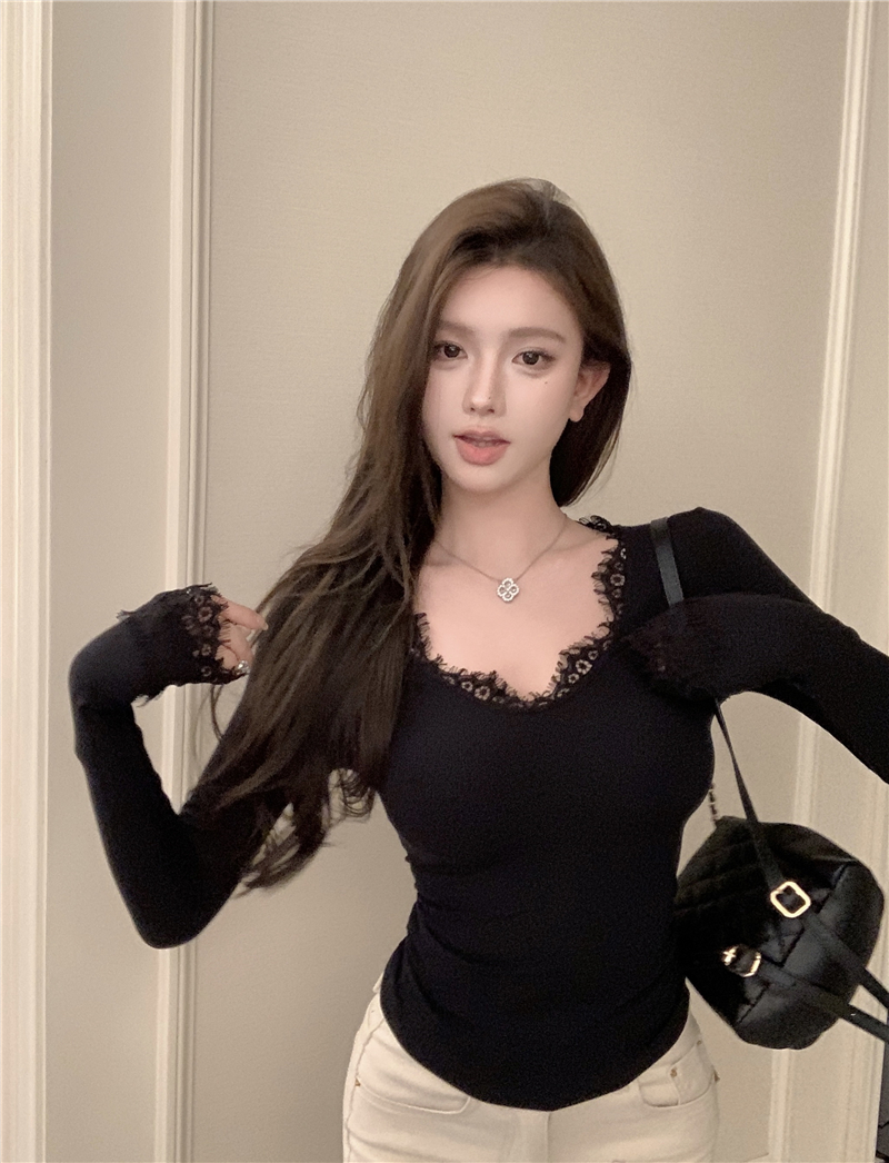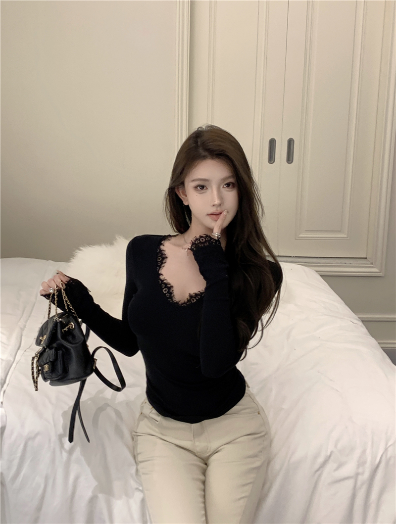 MY13685# 基础款 自留!蕾丝睫毛边V领打底上衣女裝貨源服裝批發