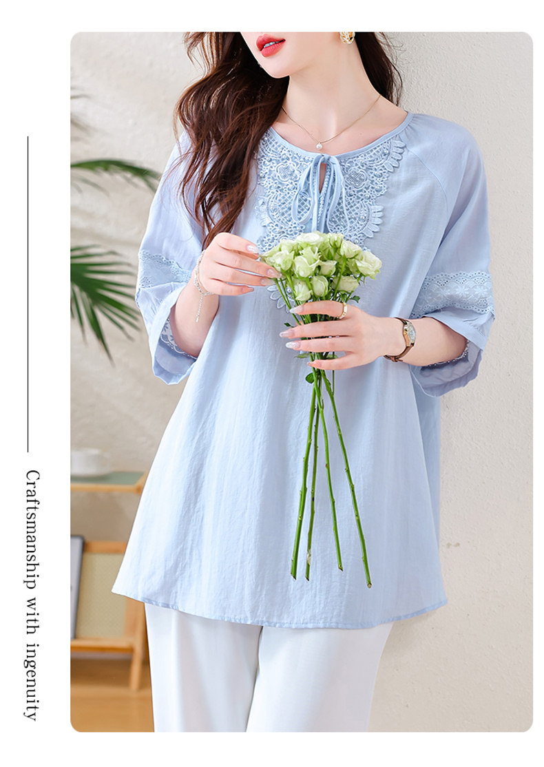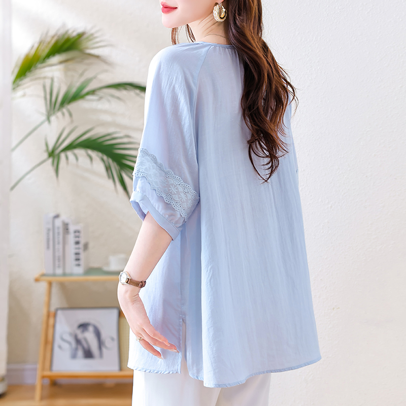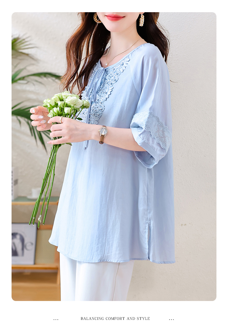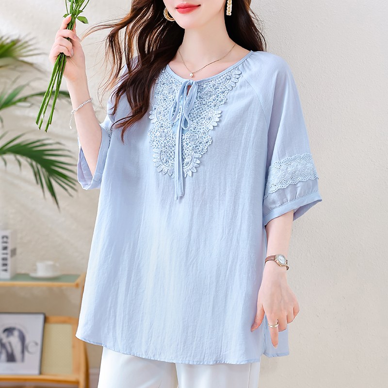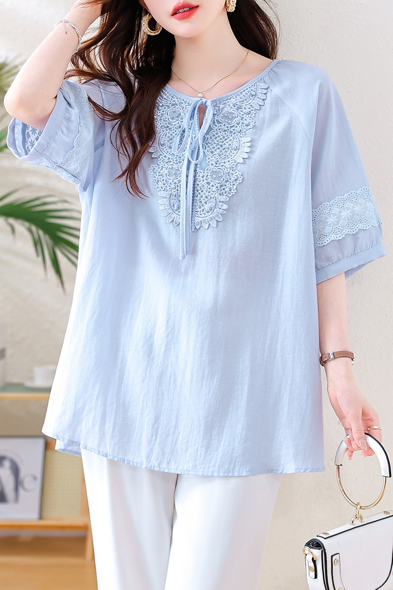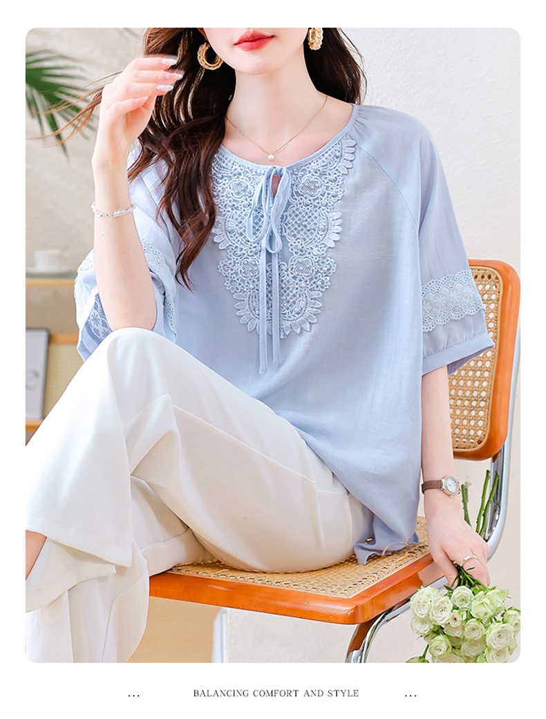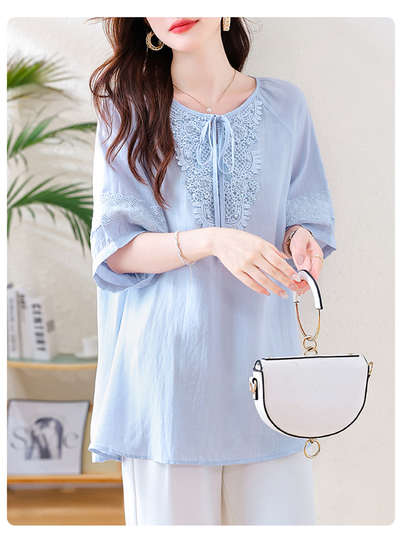 MY13769#时尚蕾丝雪纺衬衫女夏季新款短袖衬衣欧货大码女装上衣