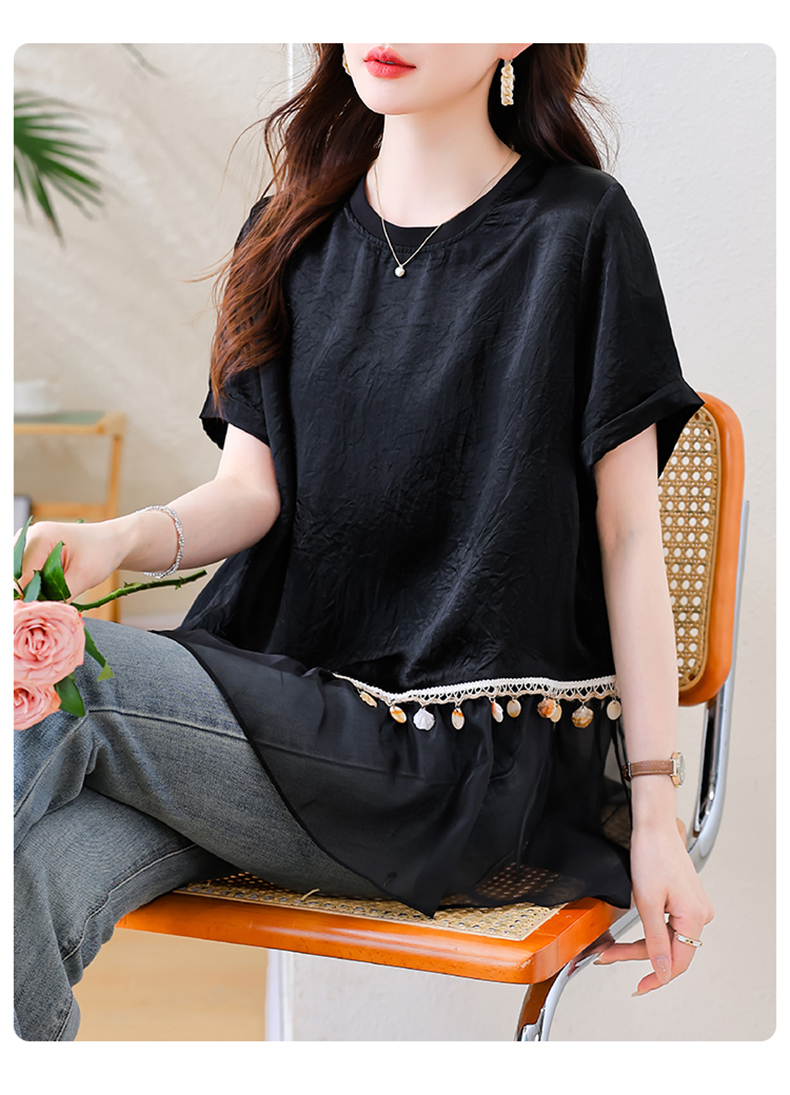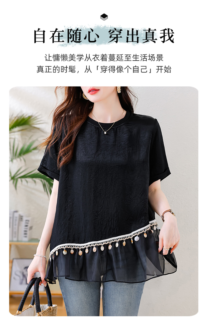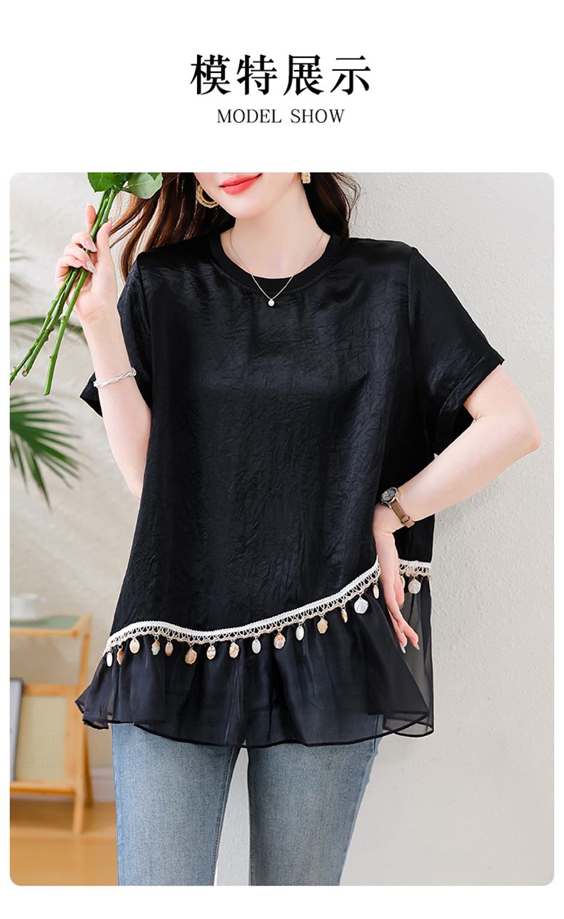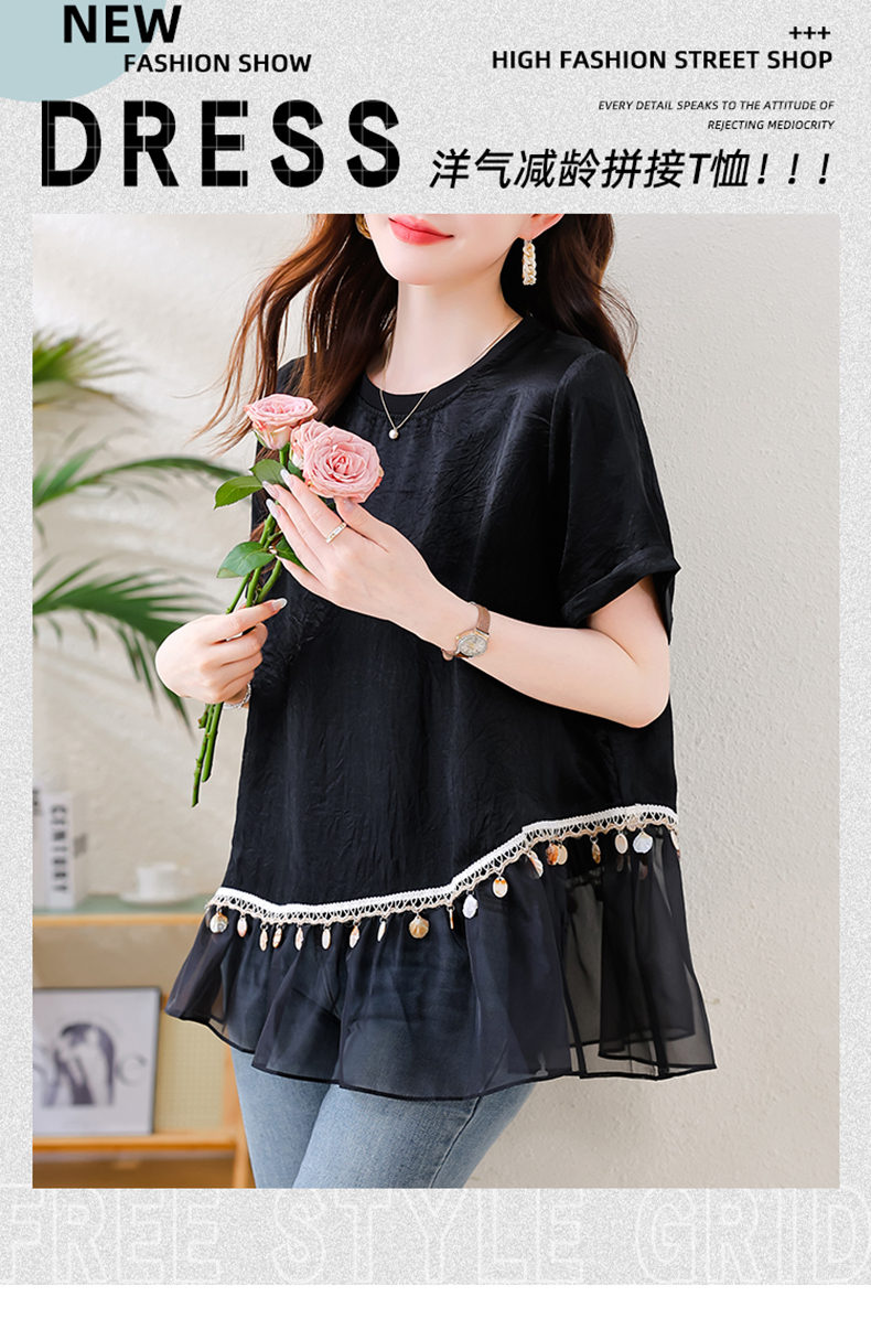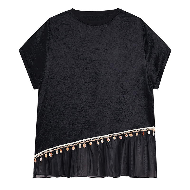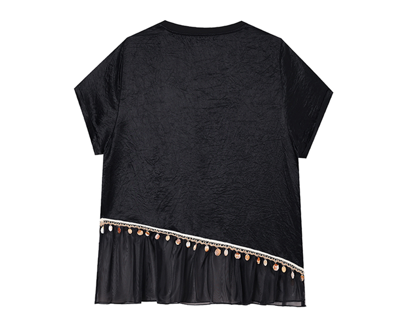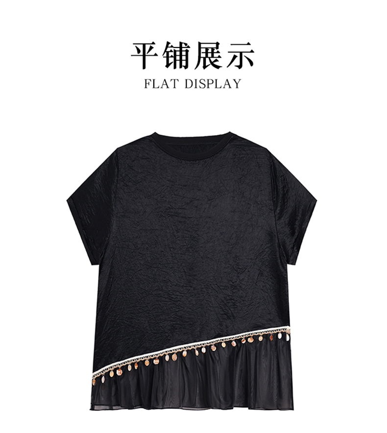 MY13770#圆领亮片拼接T恤女夏季新款短袖上衣欧洲站大码女装