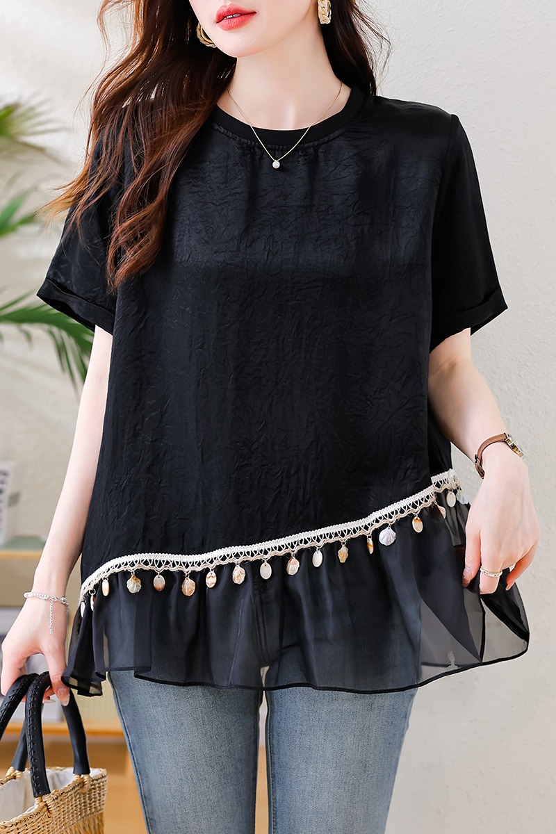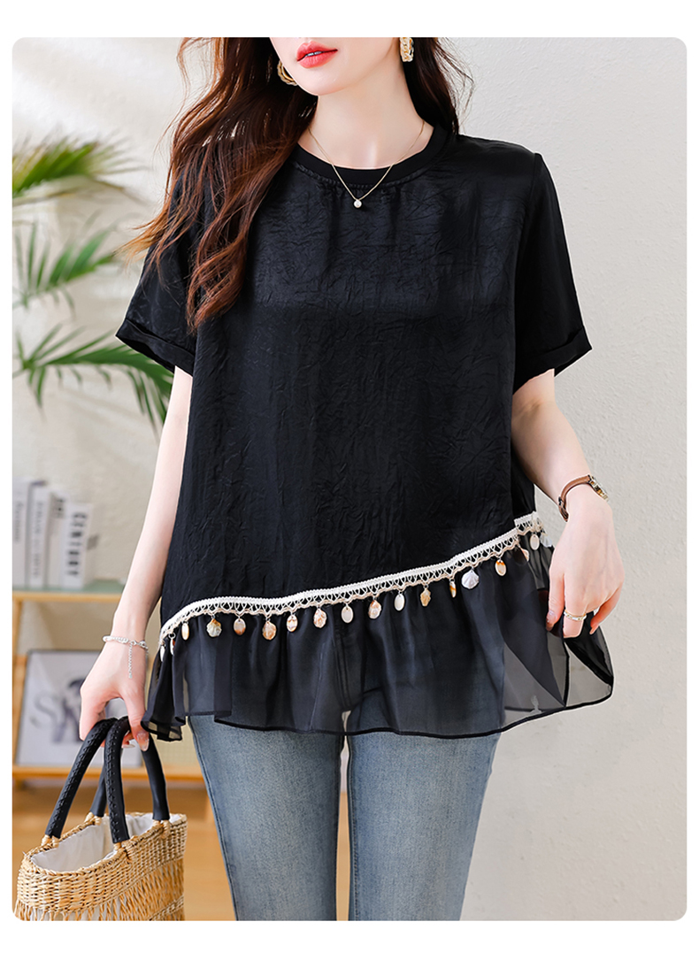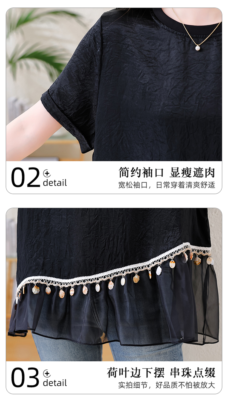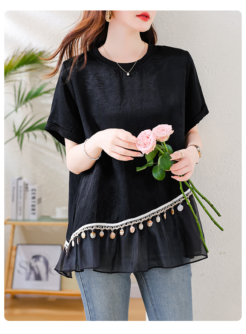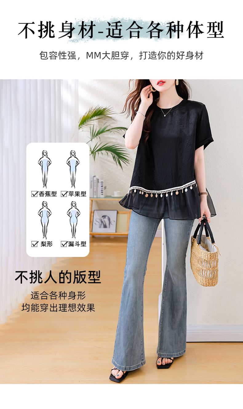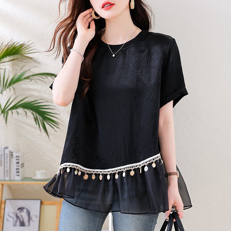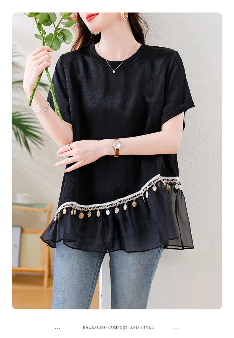 MY13770#圆领亮片拼接T恤女夏季新款短袖上衣欧洲站大码女装