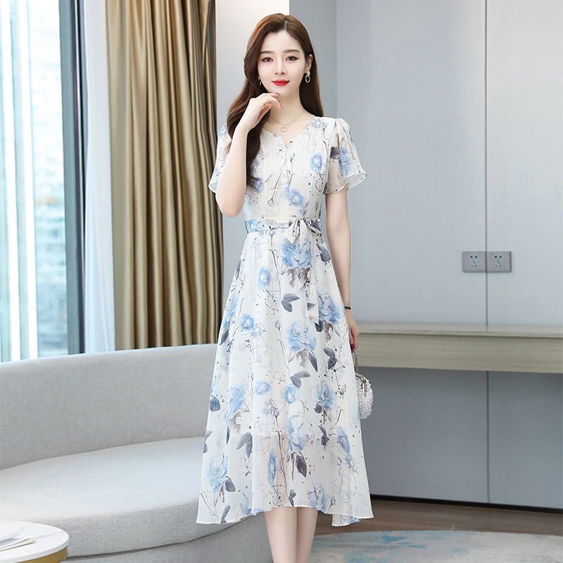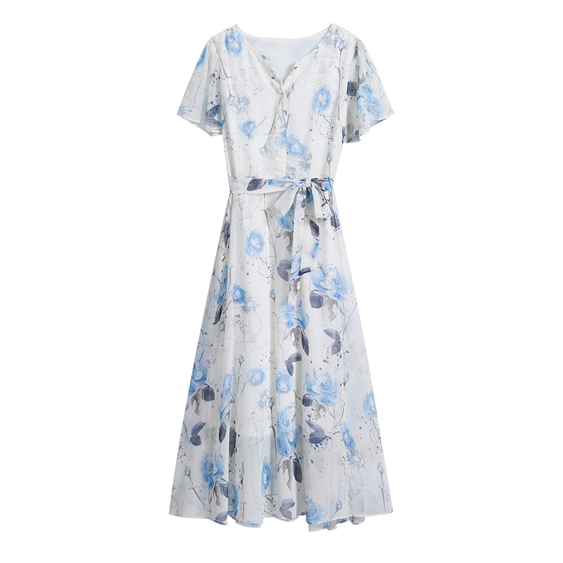 MY13772#夏装时尚修身清新长裙气质雪纺连衣裙女收腰流行印花裙子