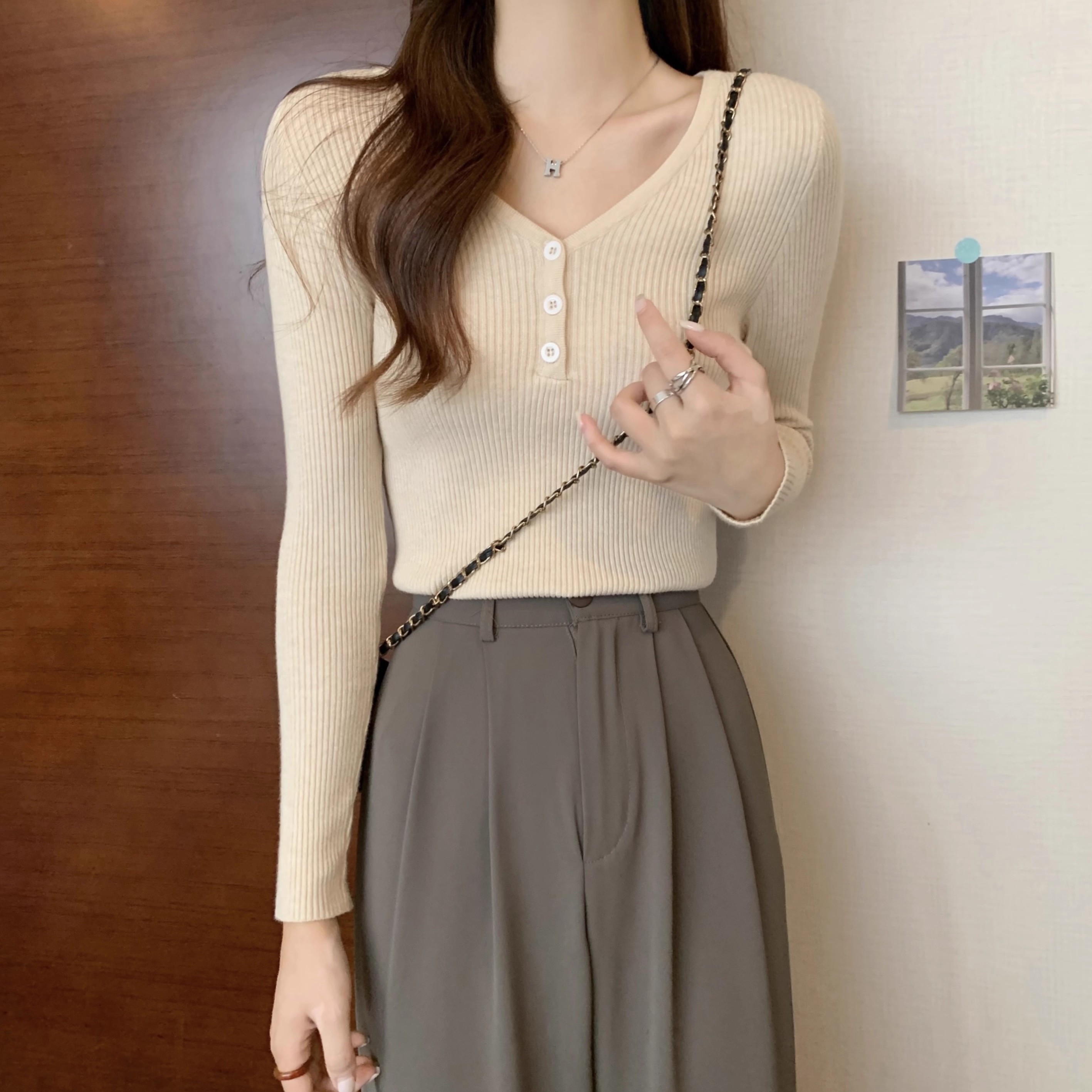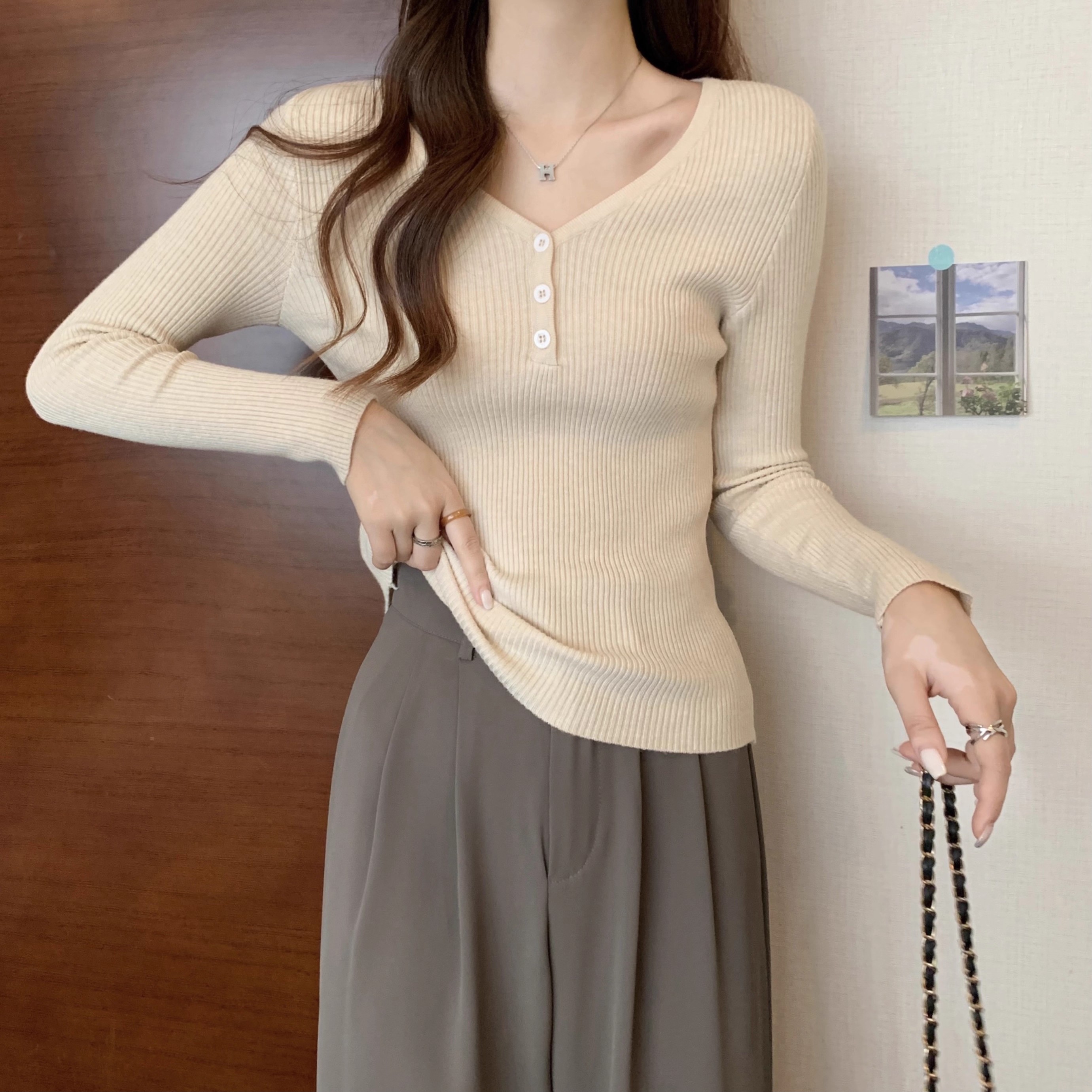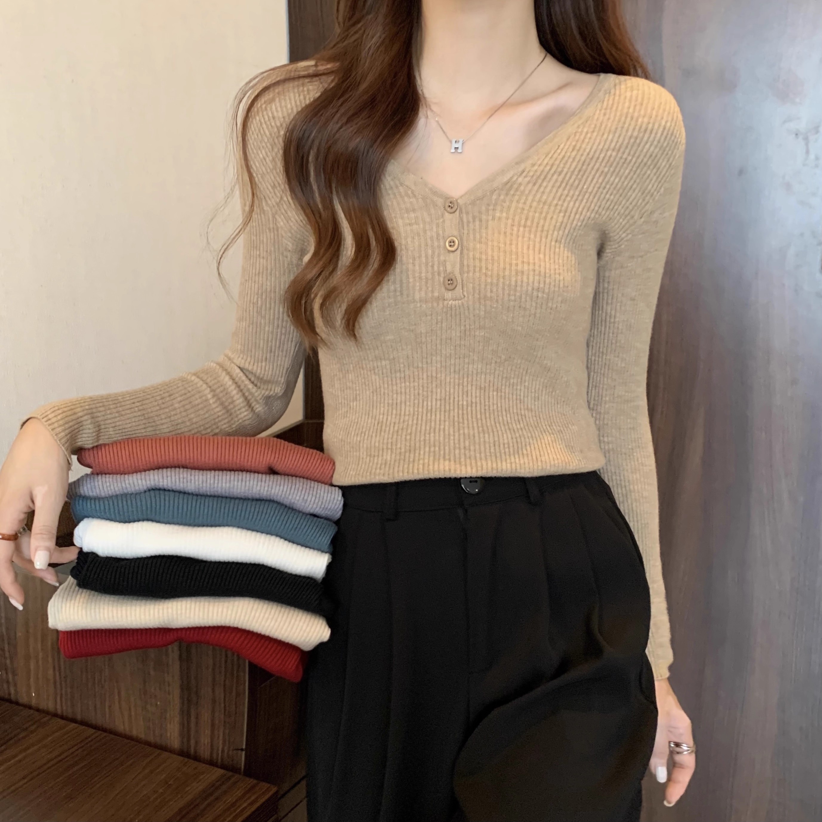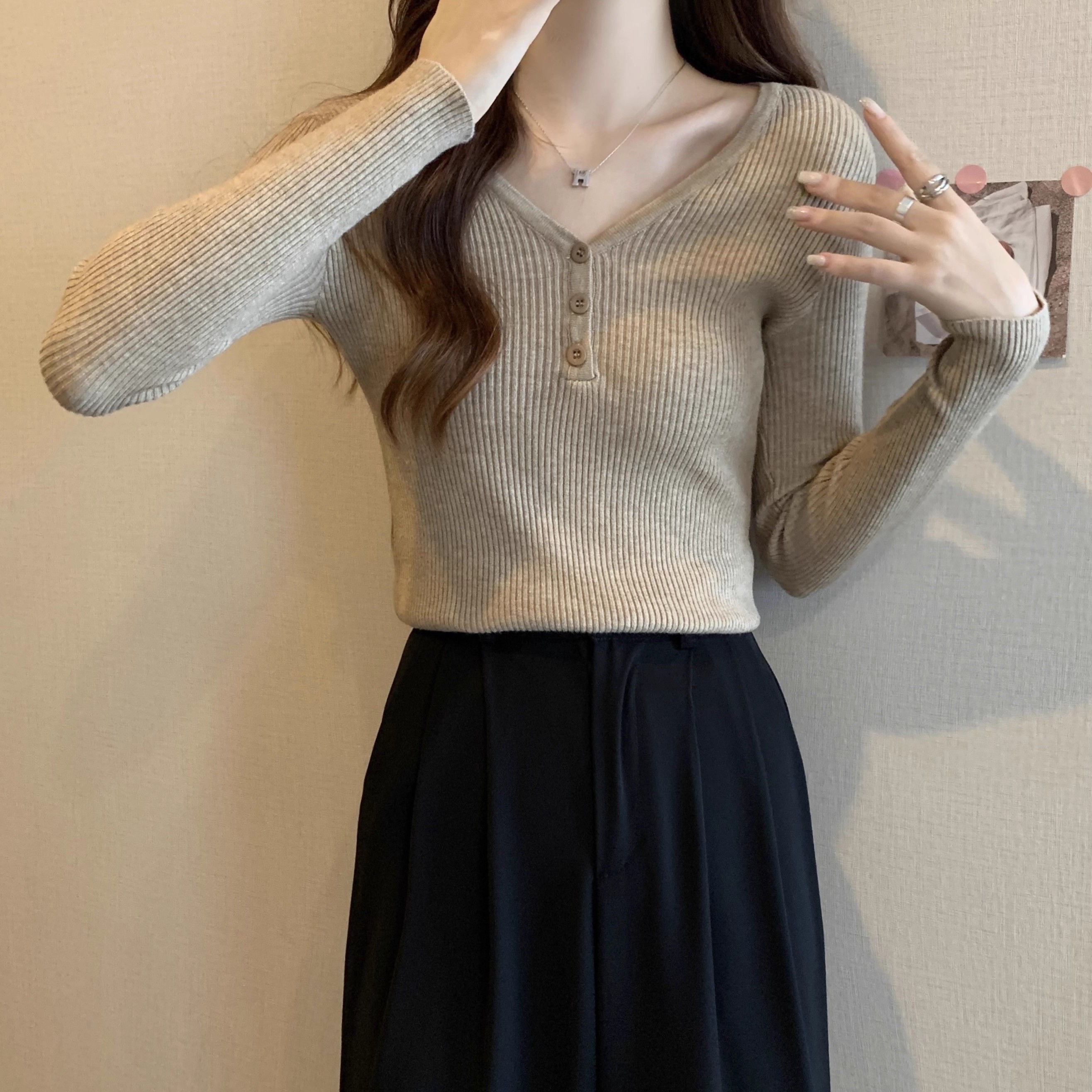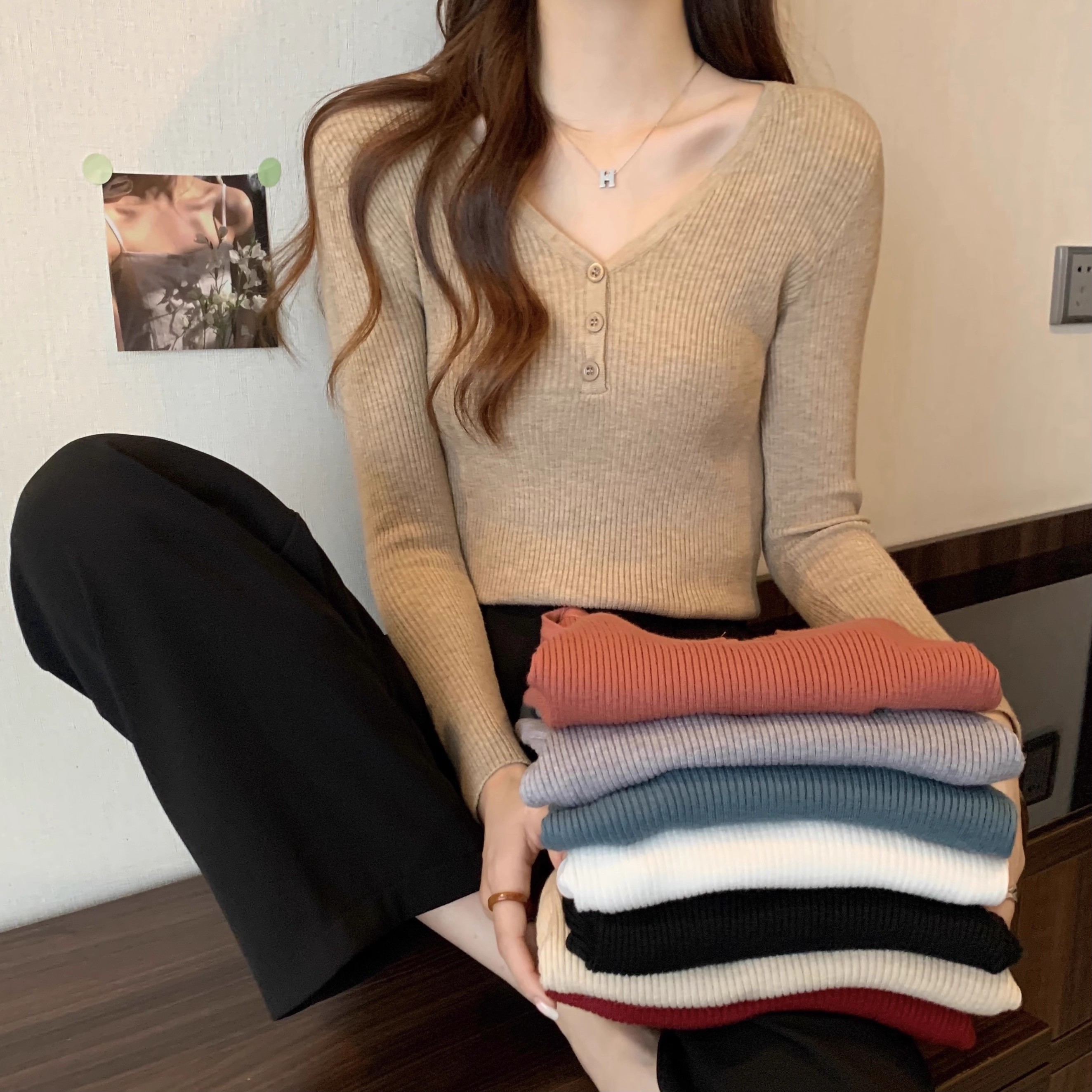 MY13803# 女裝貨源粉色v领紧身内搭针织衫韩系设计感纯欲修身显瘦打底...