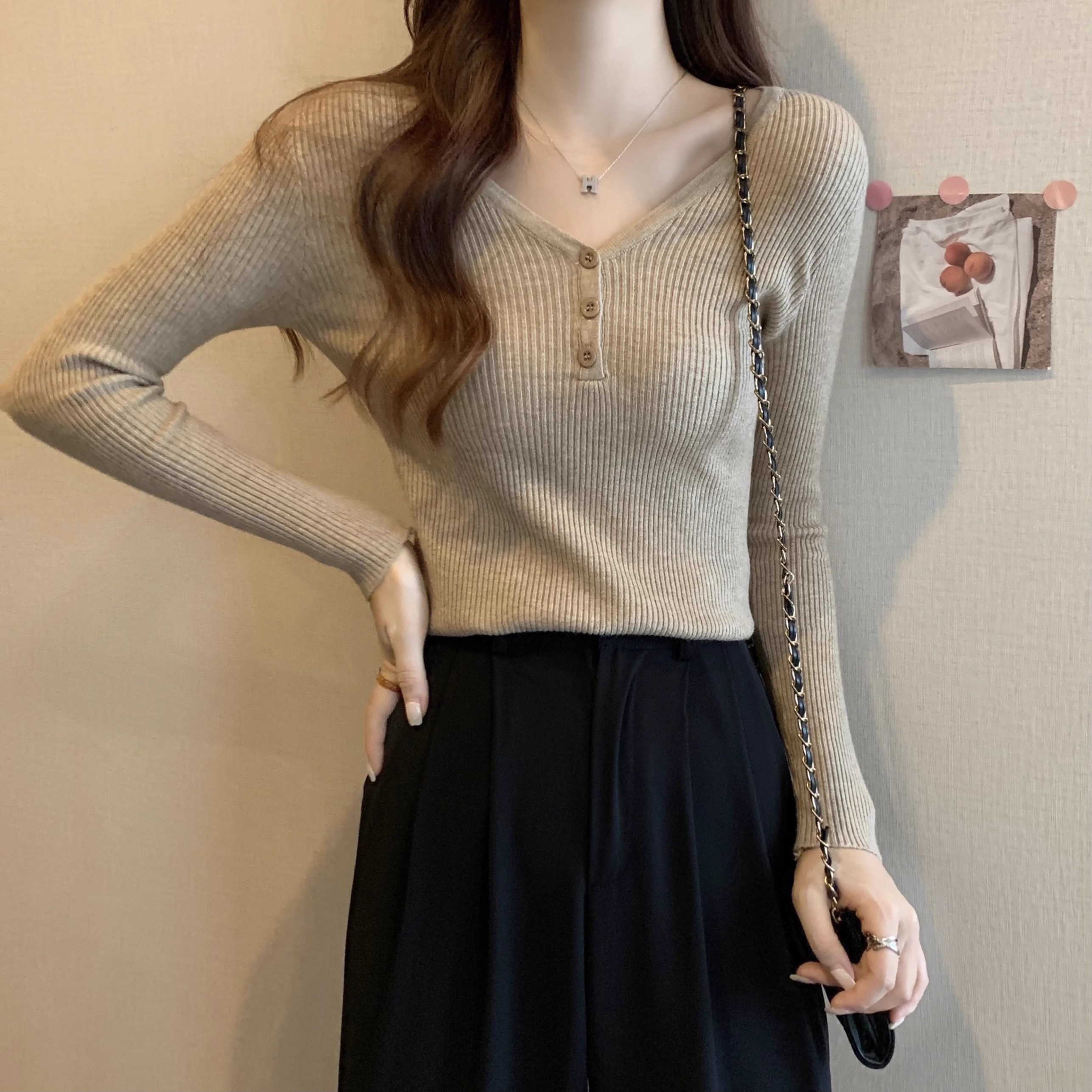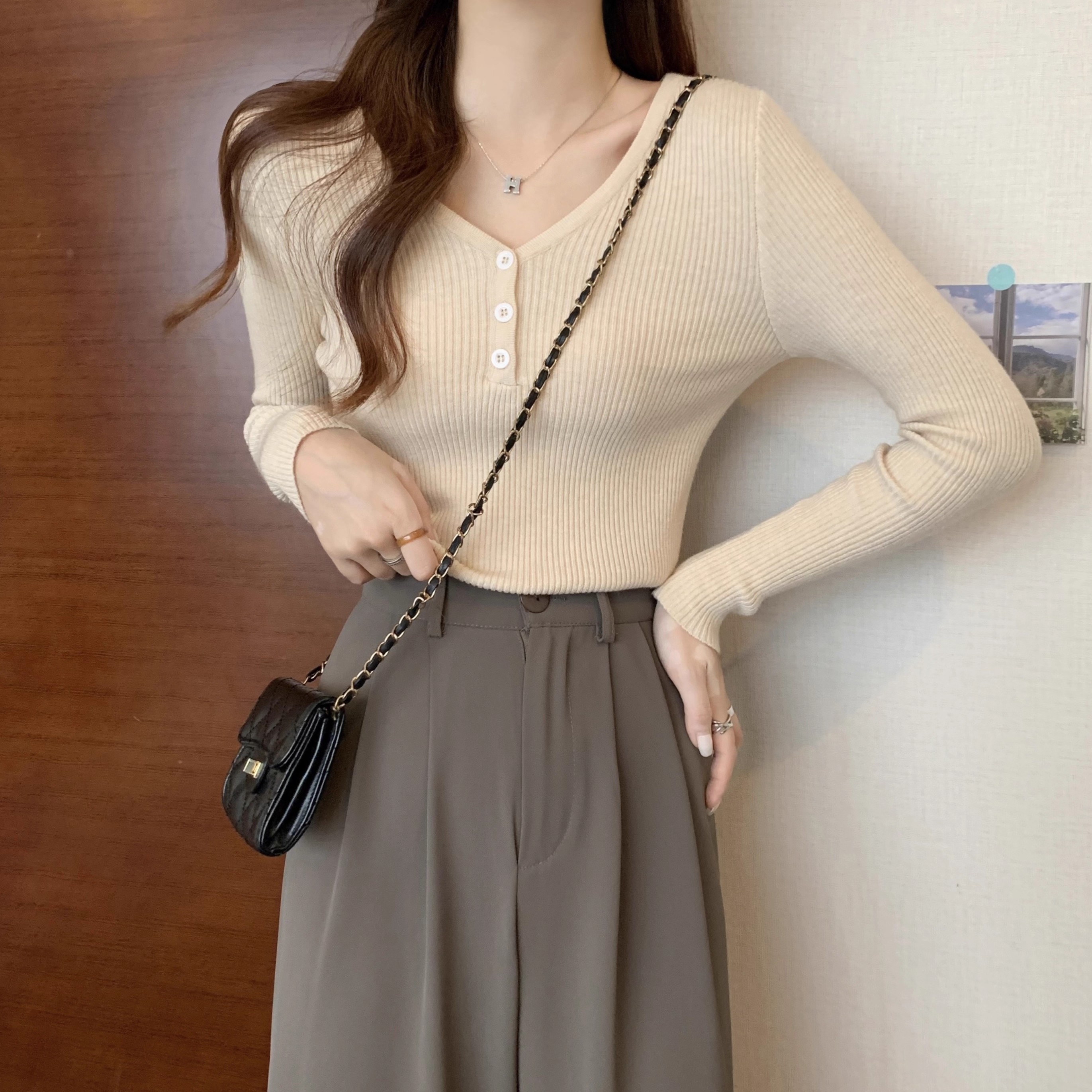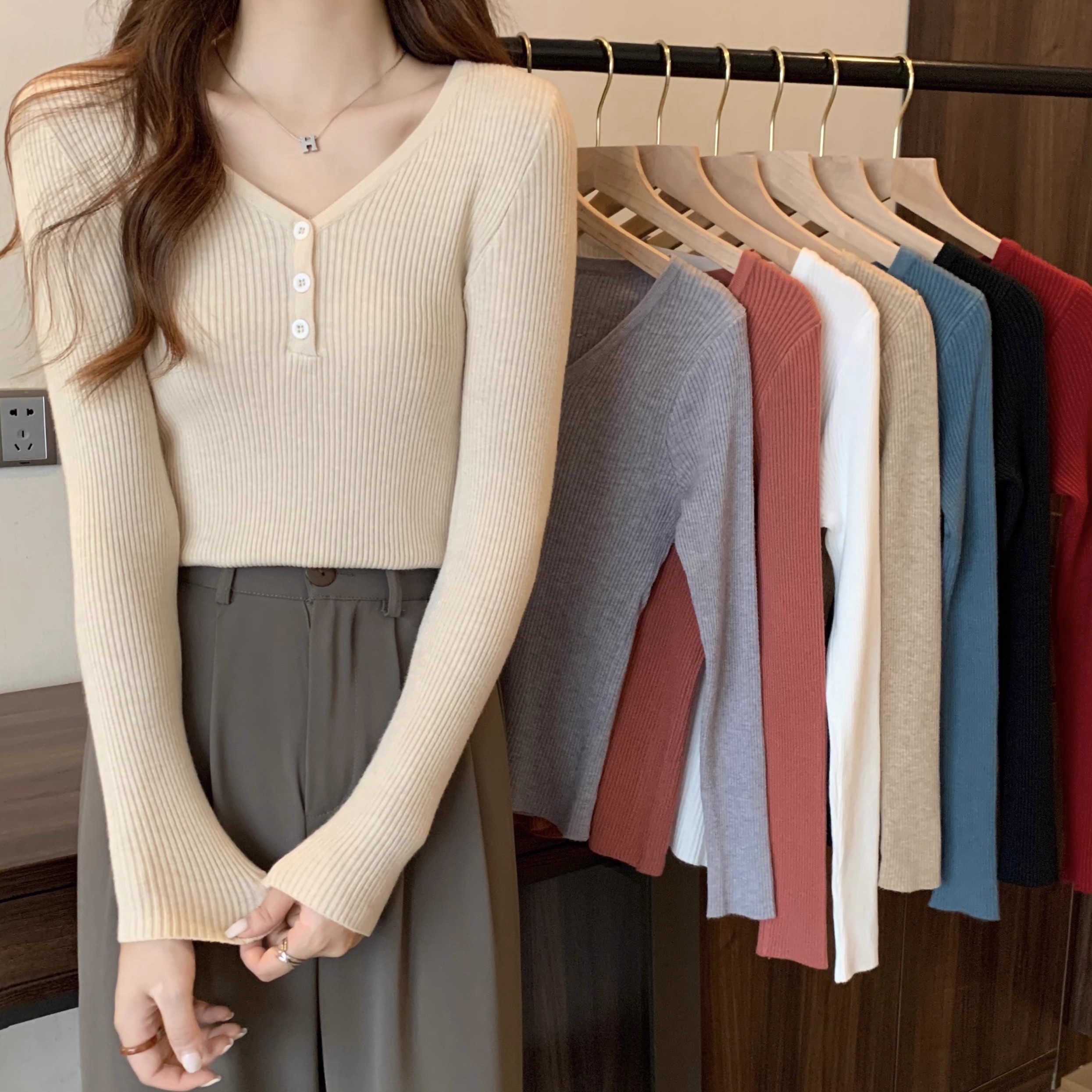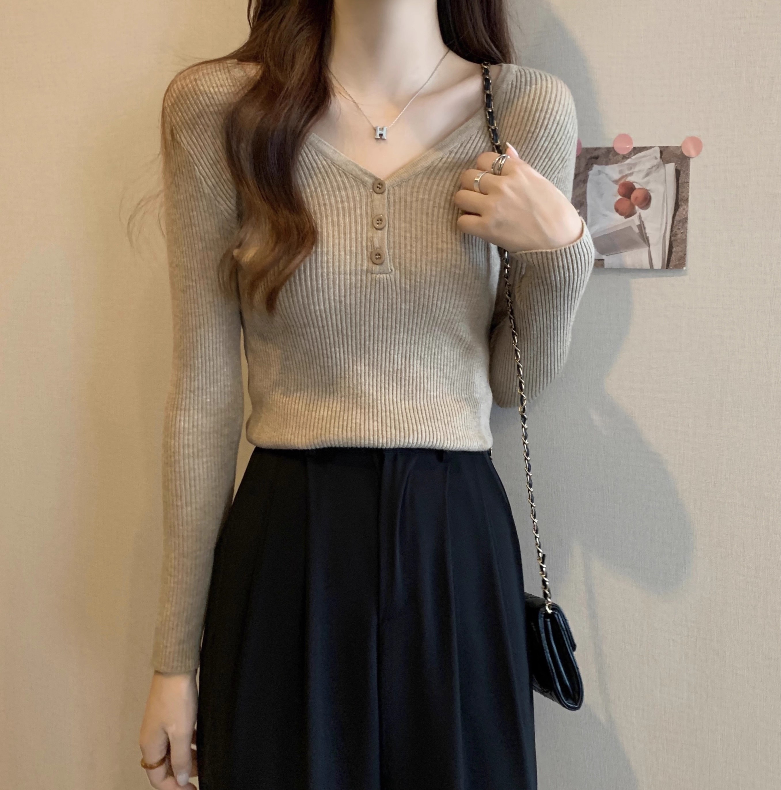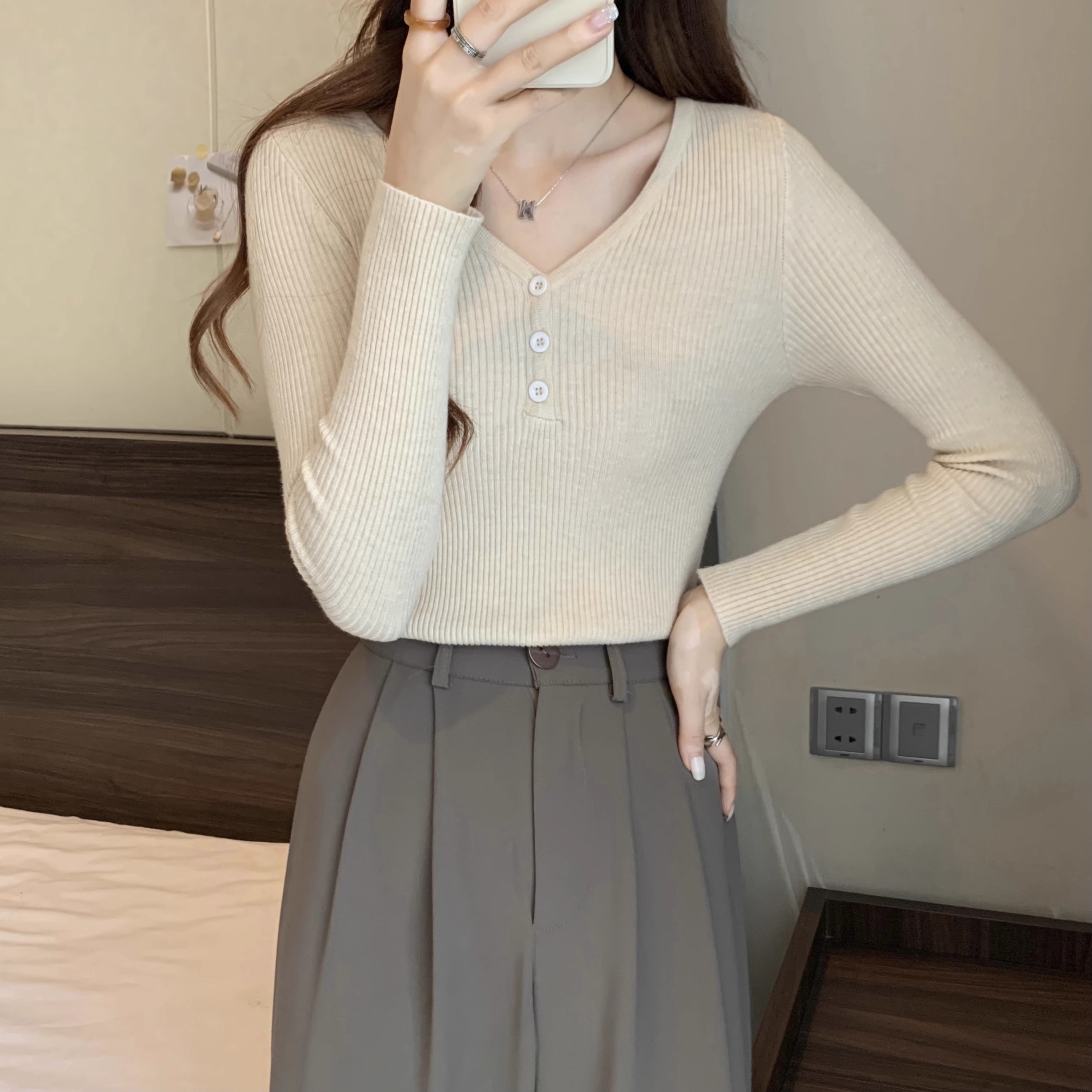 MY13803# 女裝貨源粉色v领紧身内搭针织衫韩系设计感纯欲修身显瘦打底...