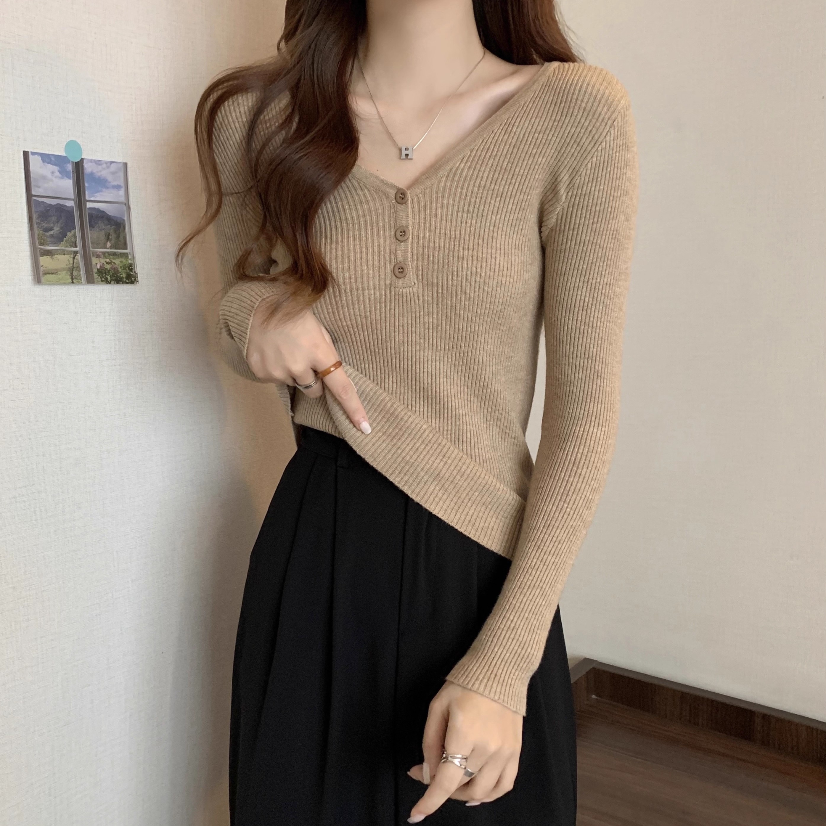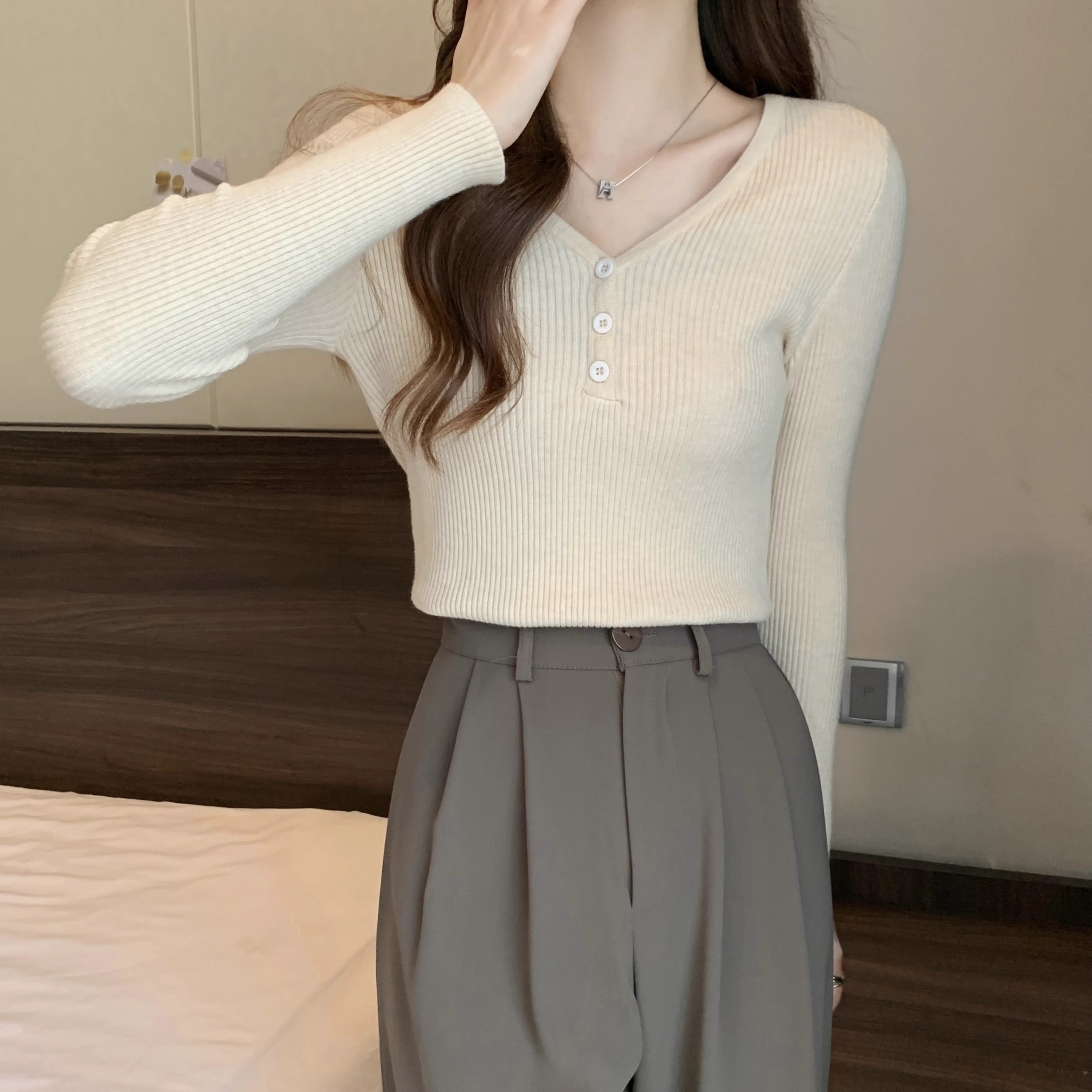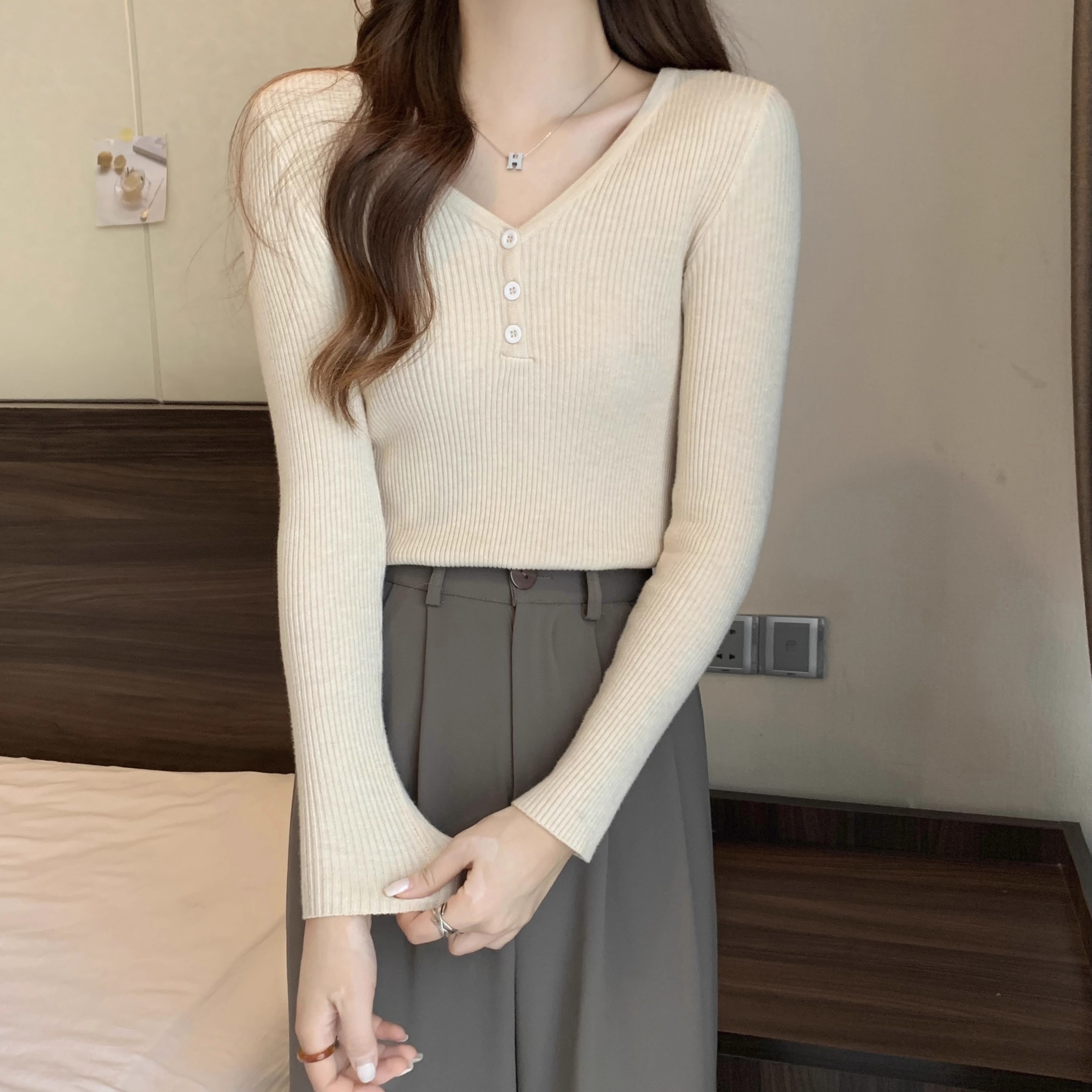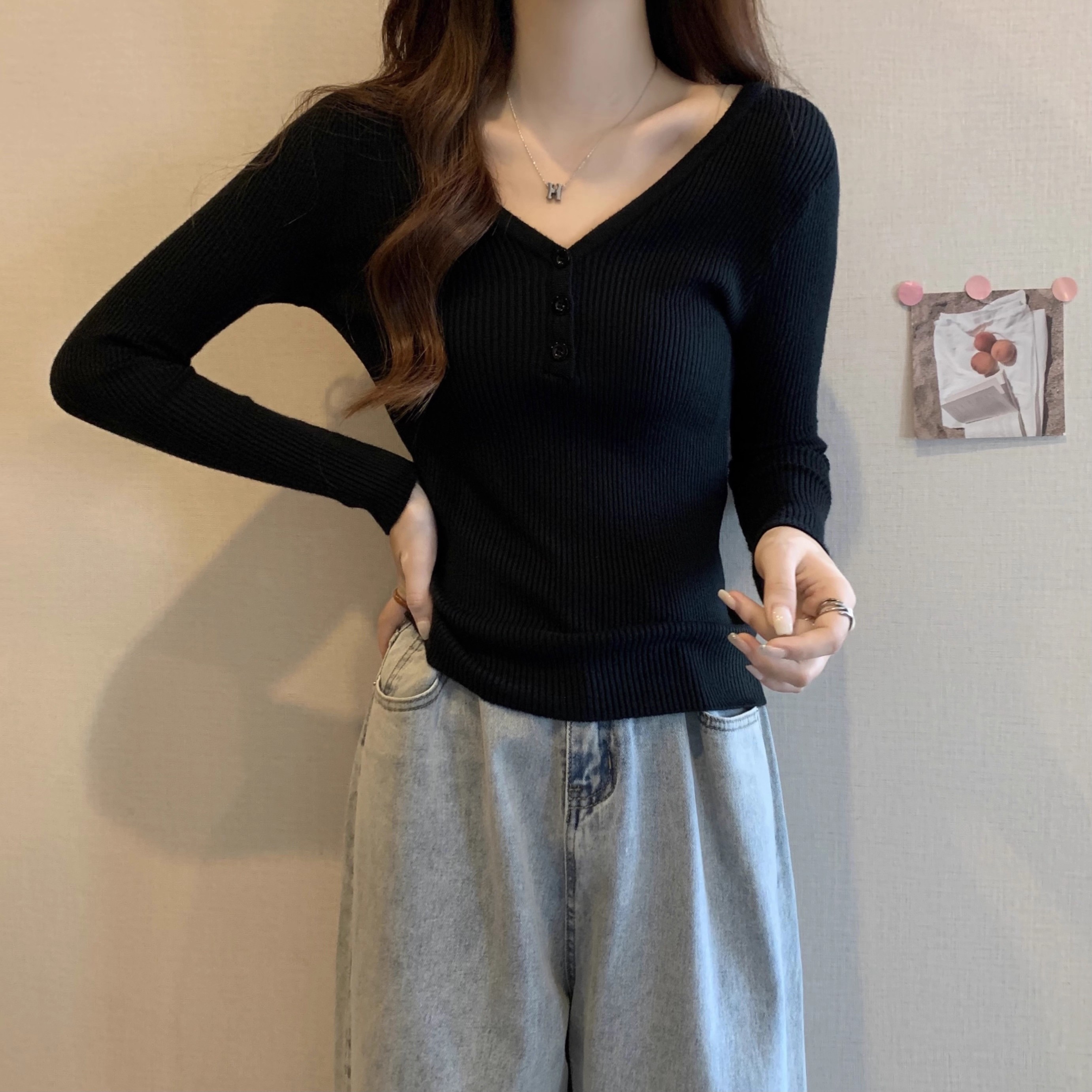 MY13803# 女裝貨源粉色v领紧身内搭针织衫韩系设计感纯欲修身显瘦打底...