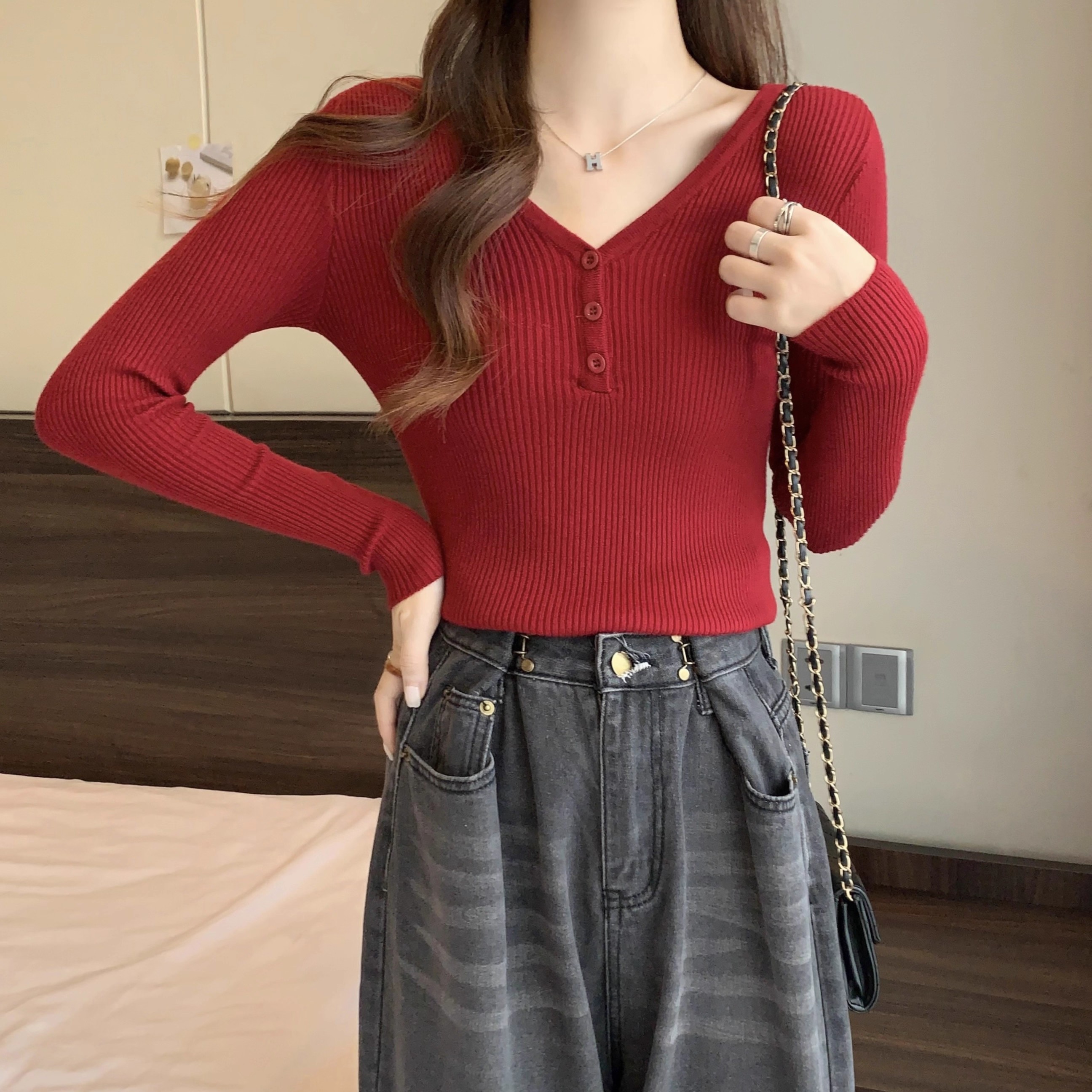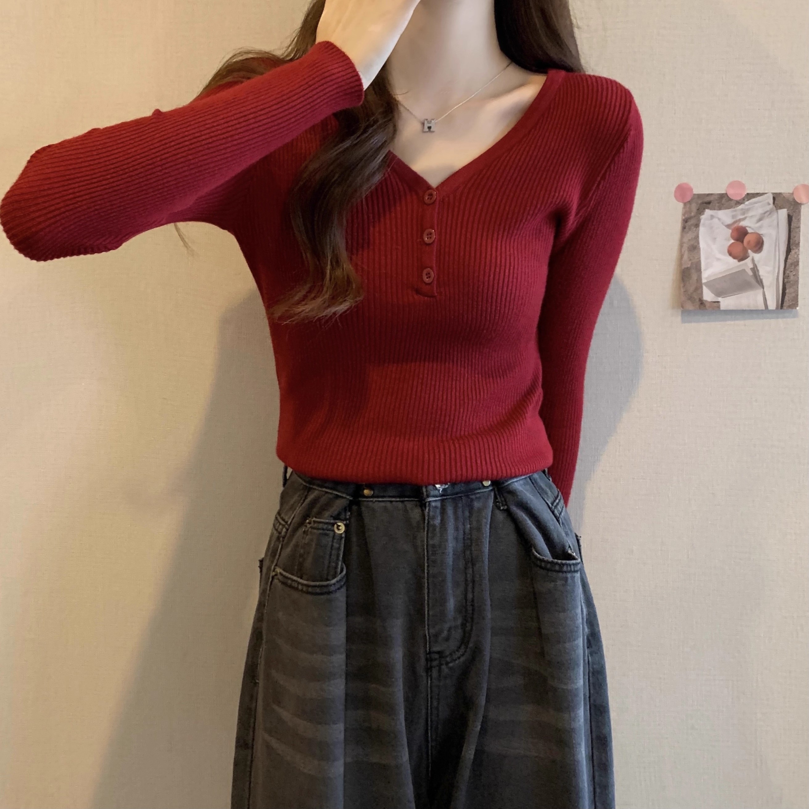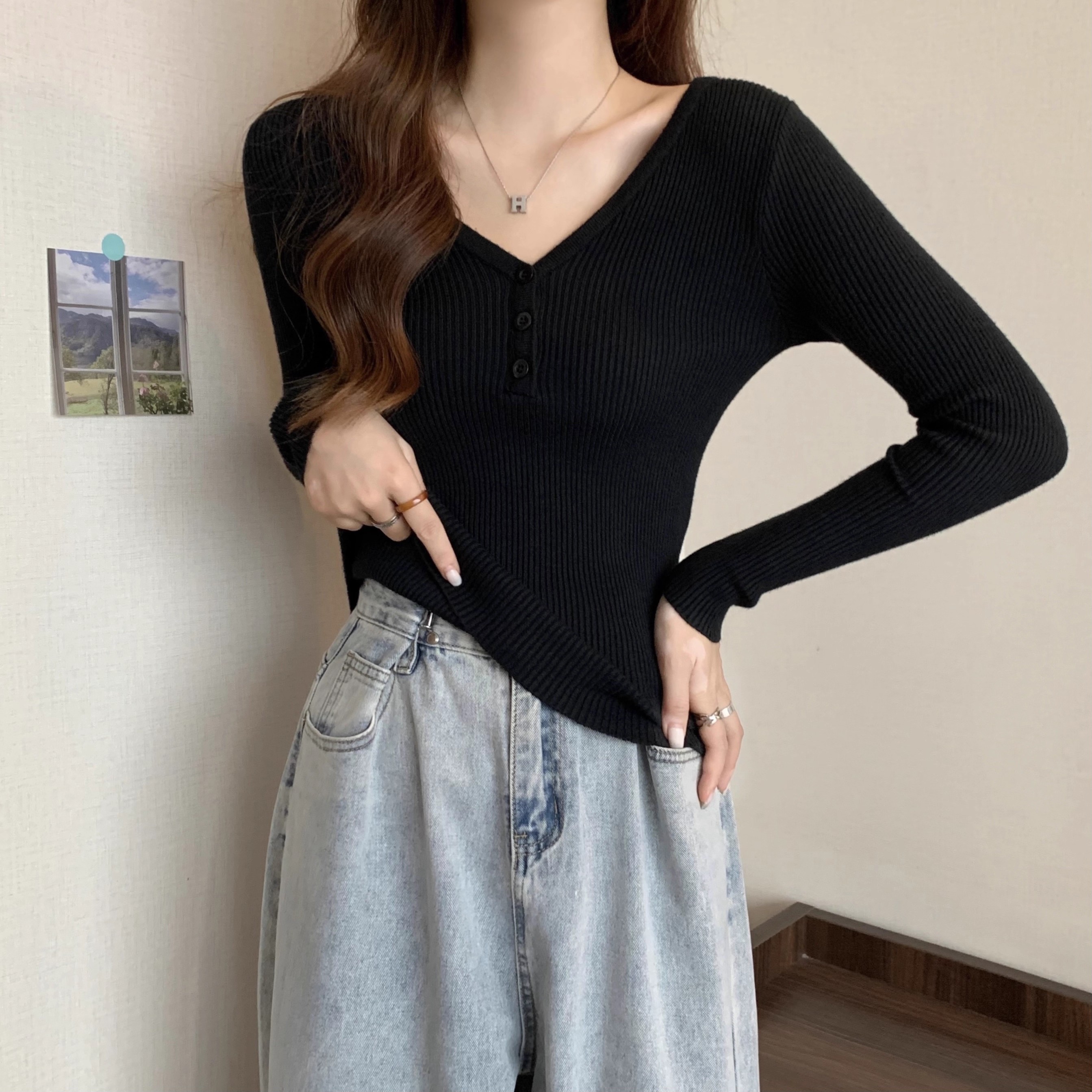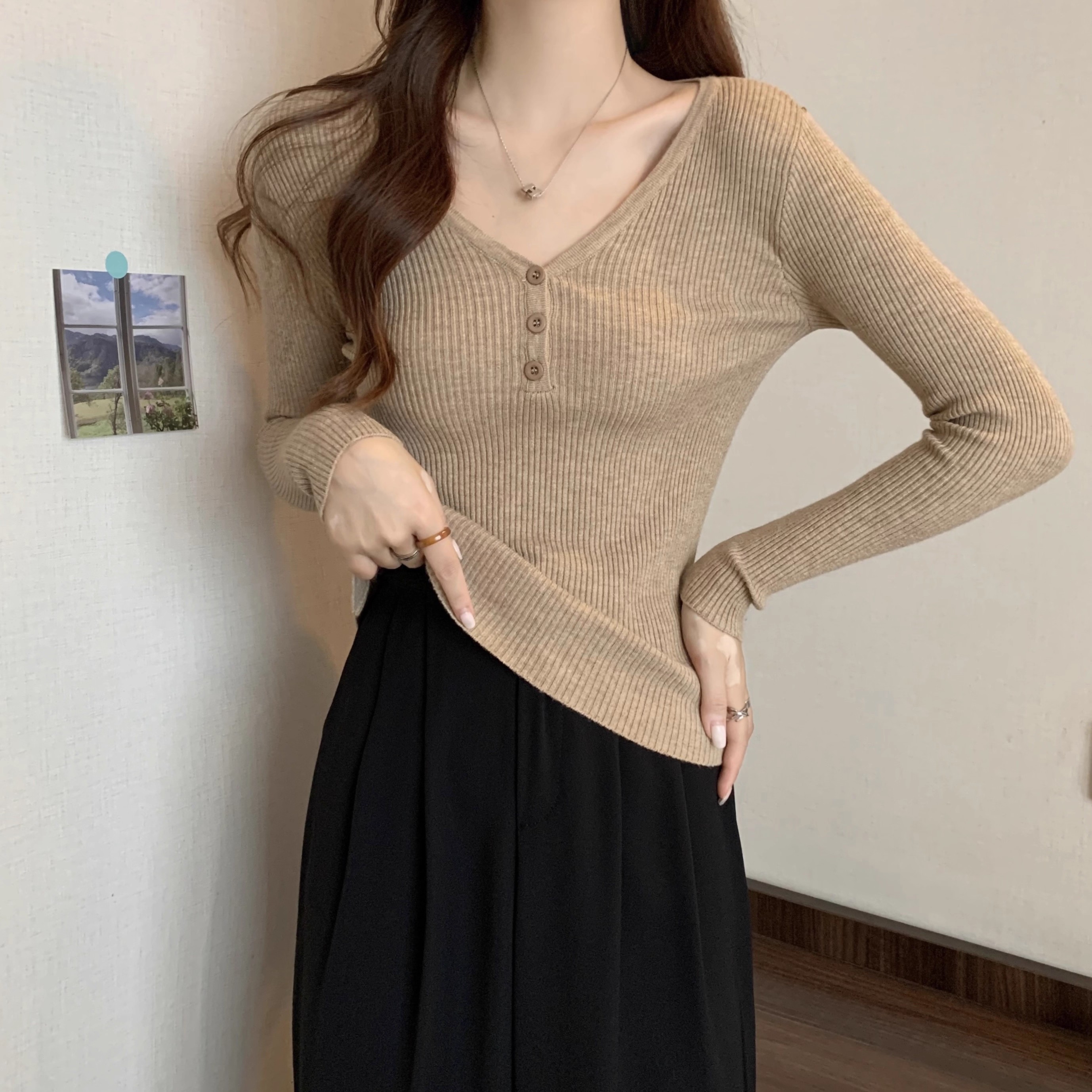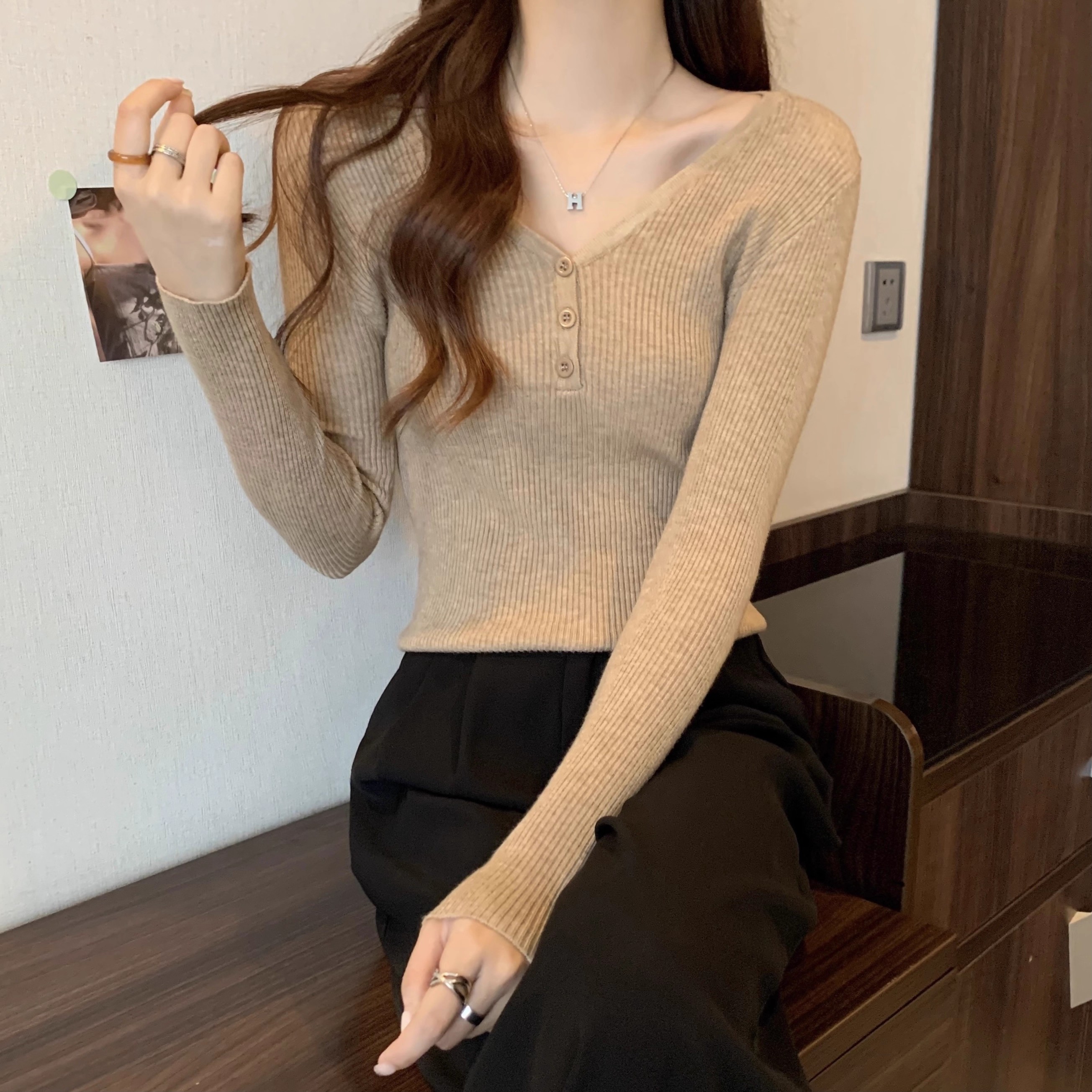 MY13803# 女裝貨源粉色v领紧身内搭针织衫韩系设计感纯欲修身显瘦打底...