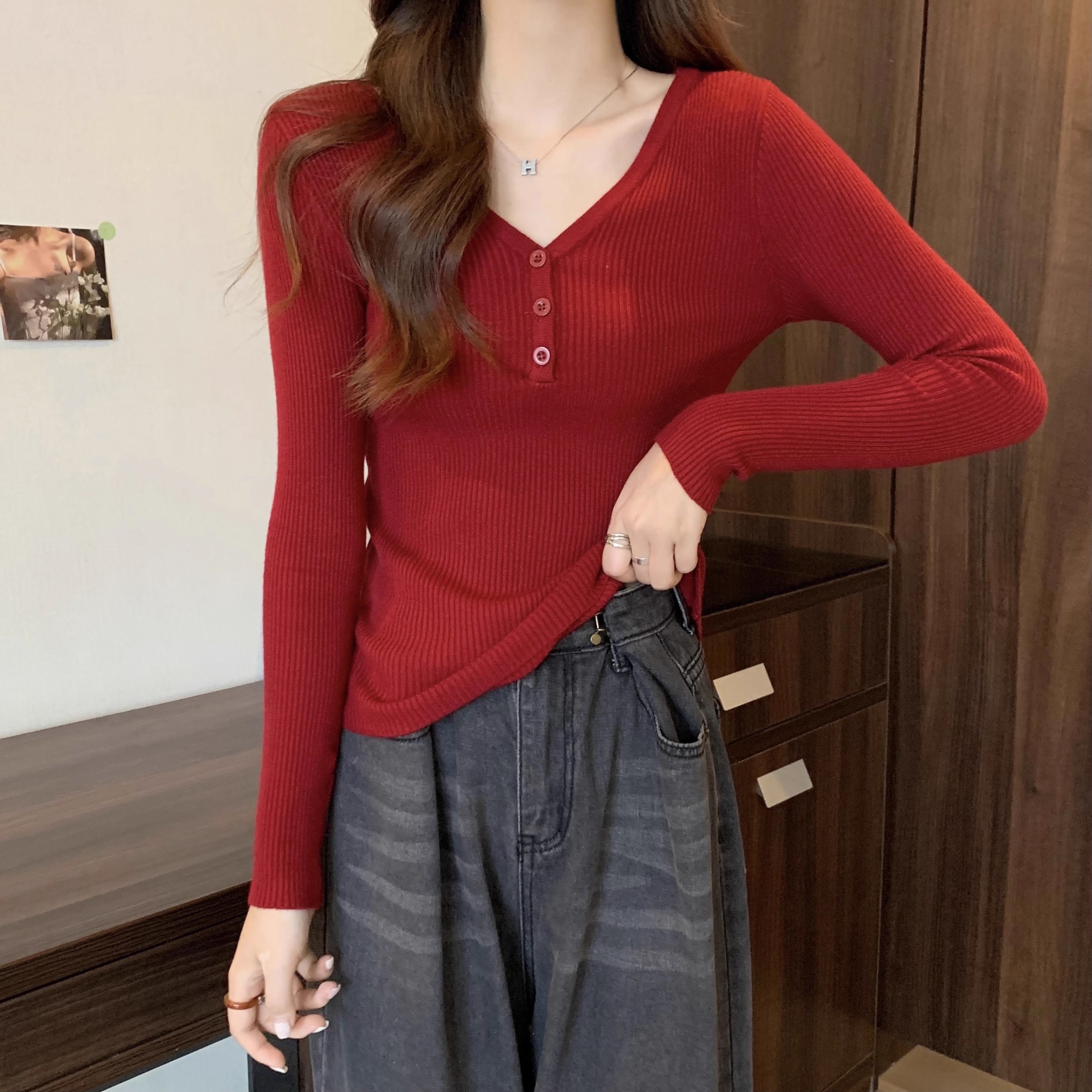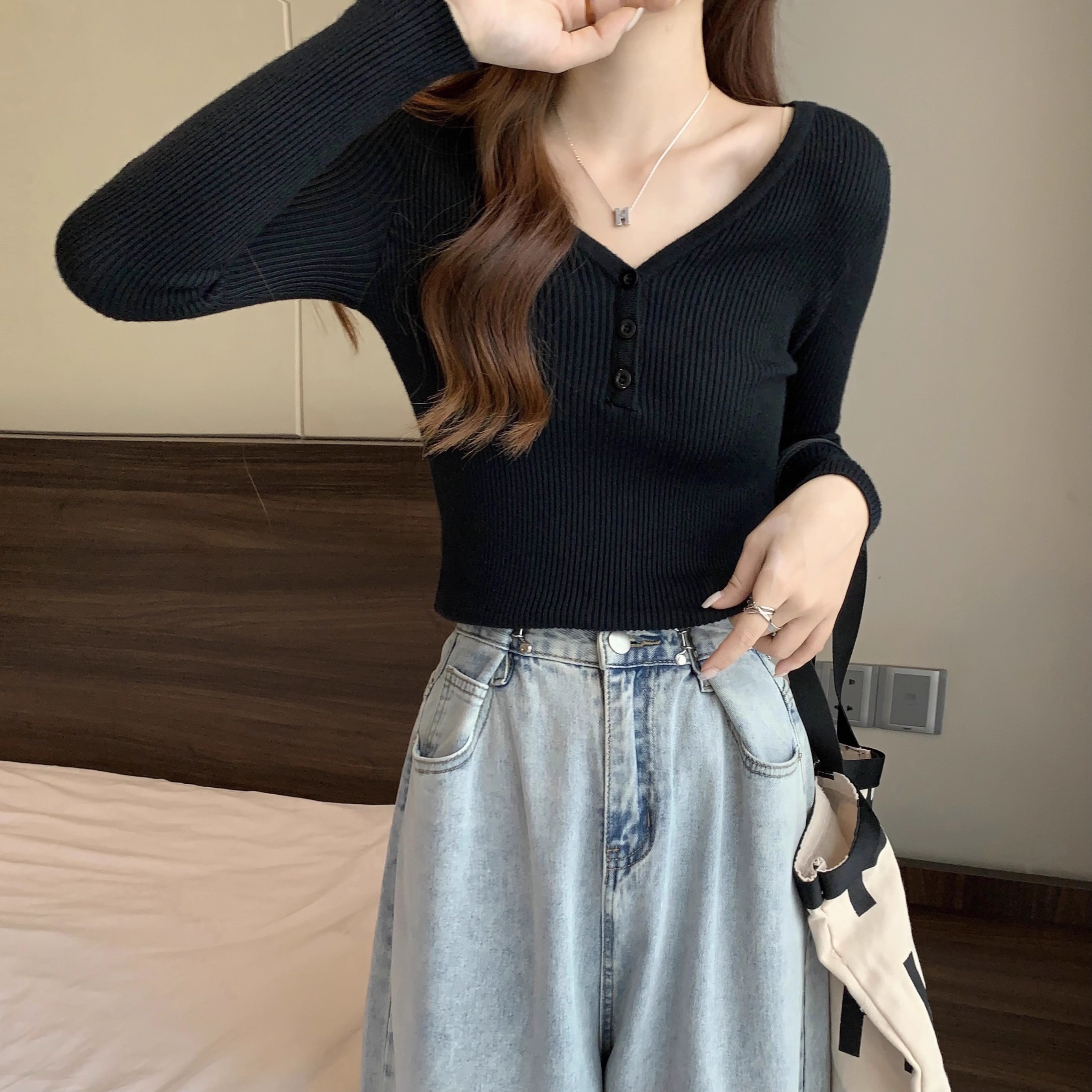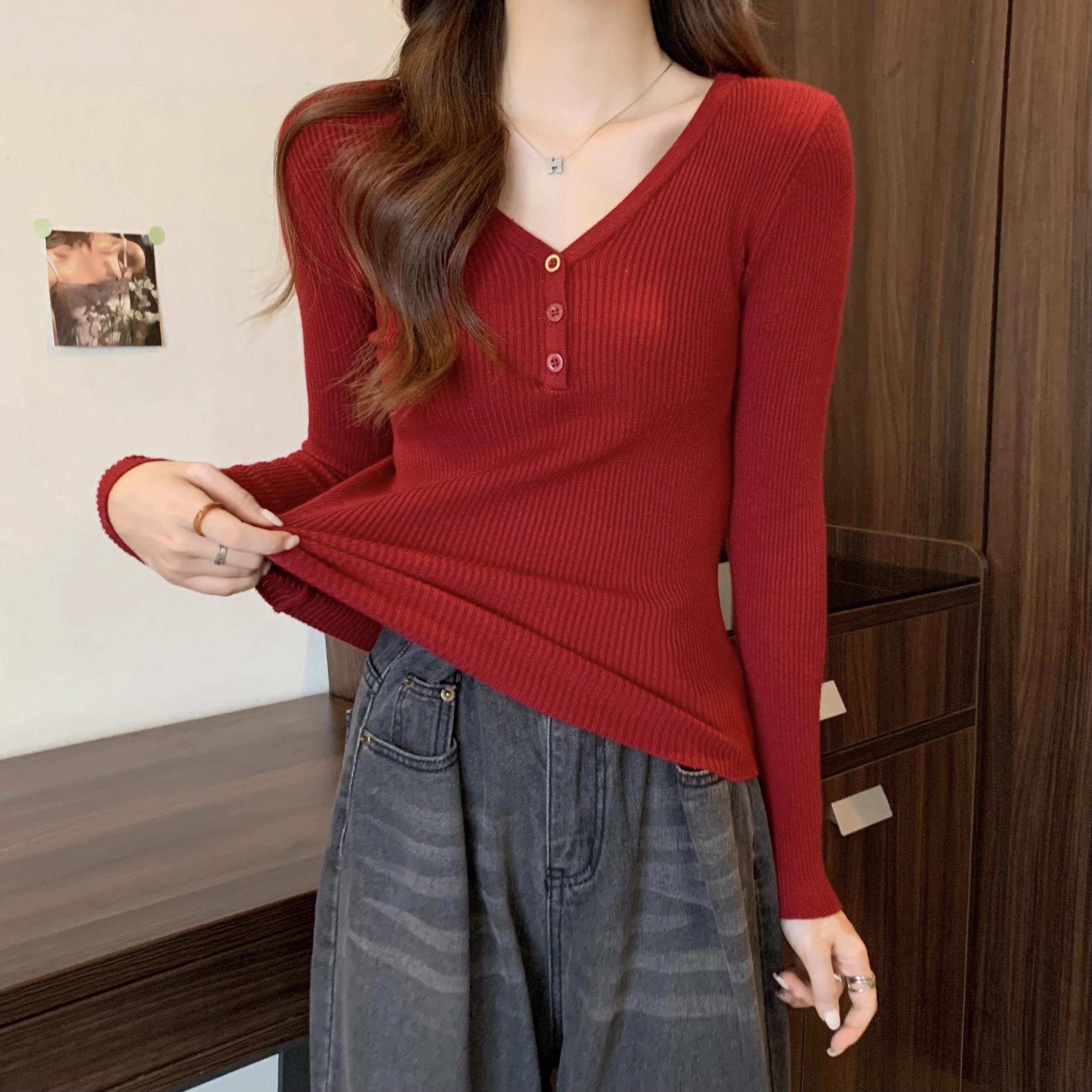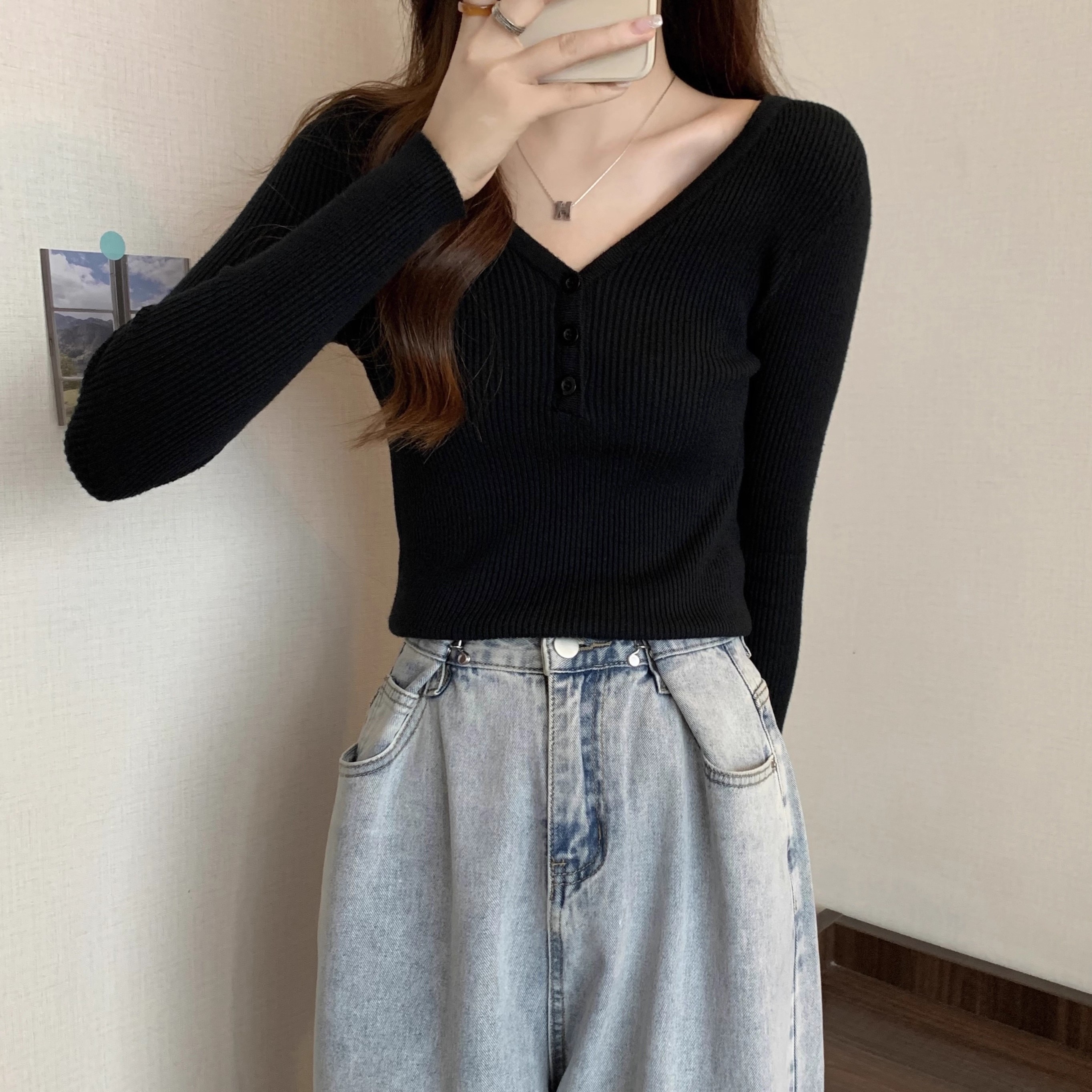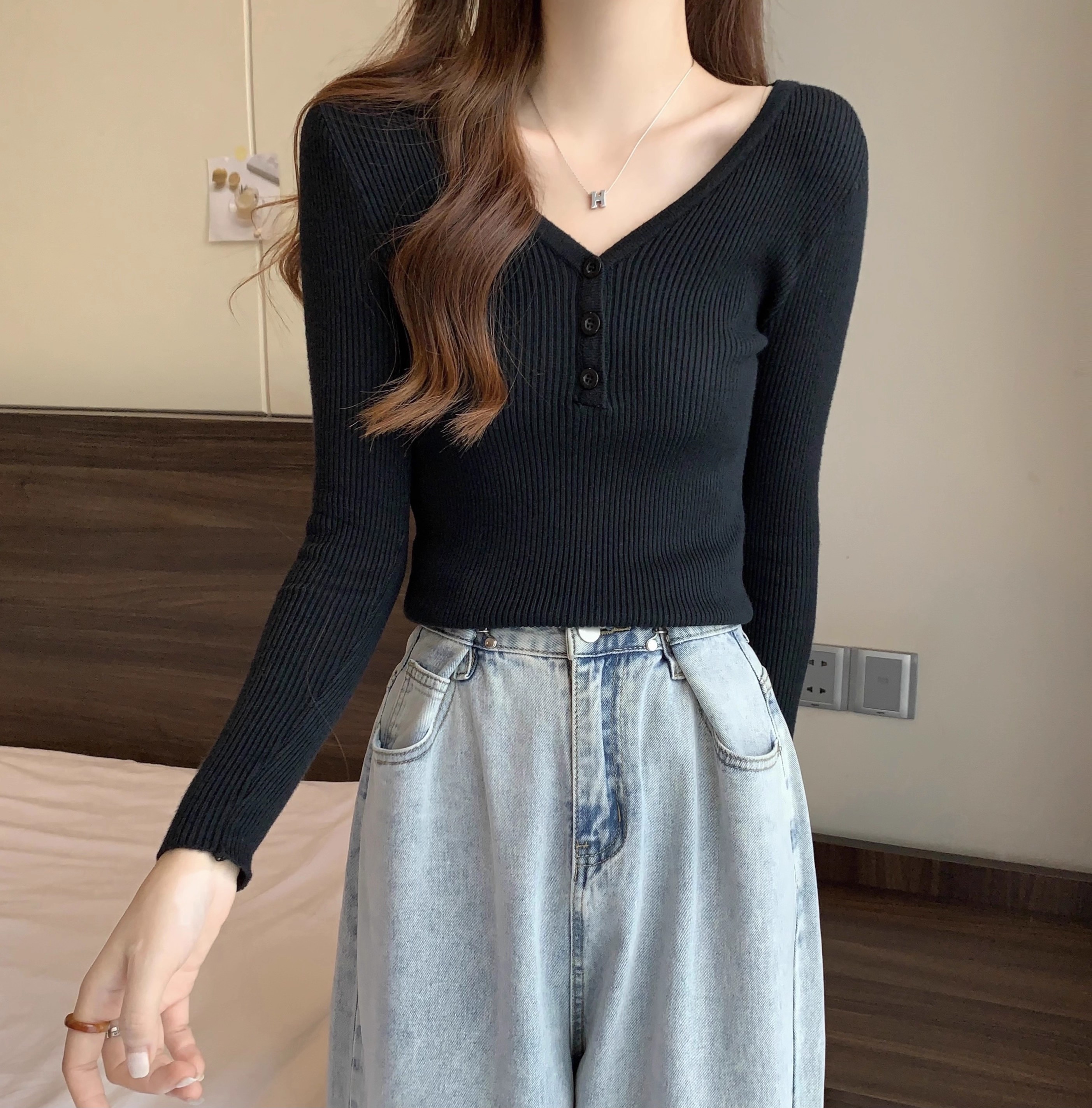 MY13803# 女裝貨源粉色v领紧身内搭针织衫韩系设计感纯欲修身显瘦打底...