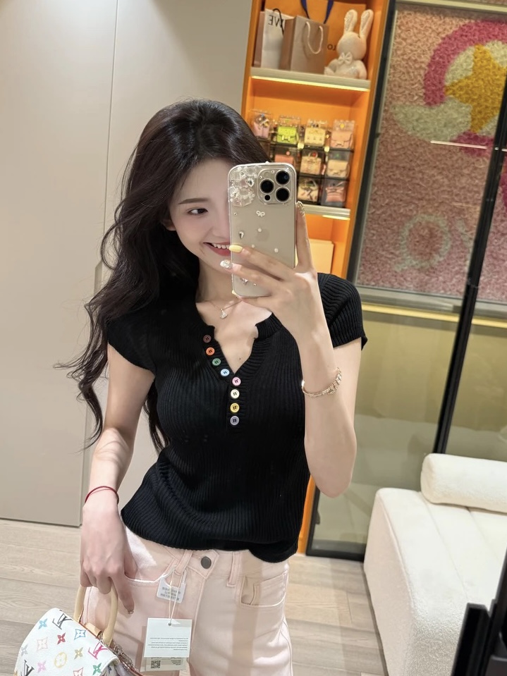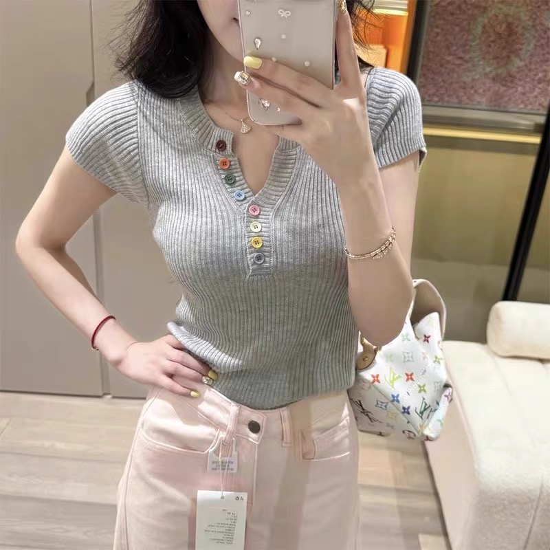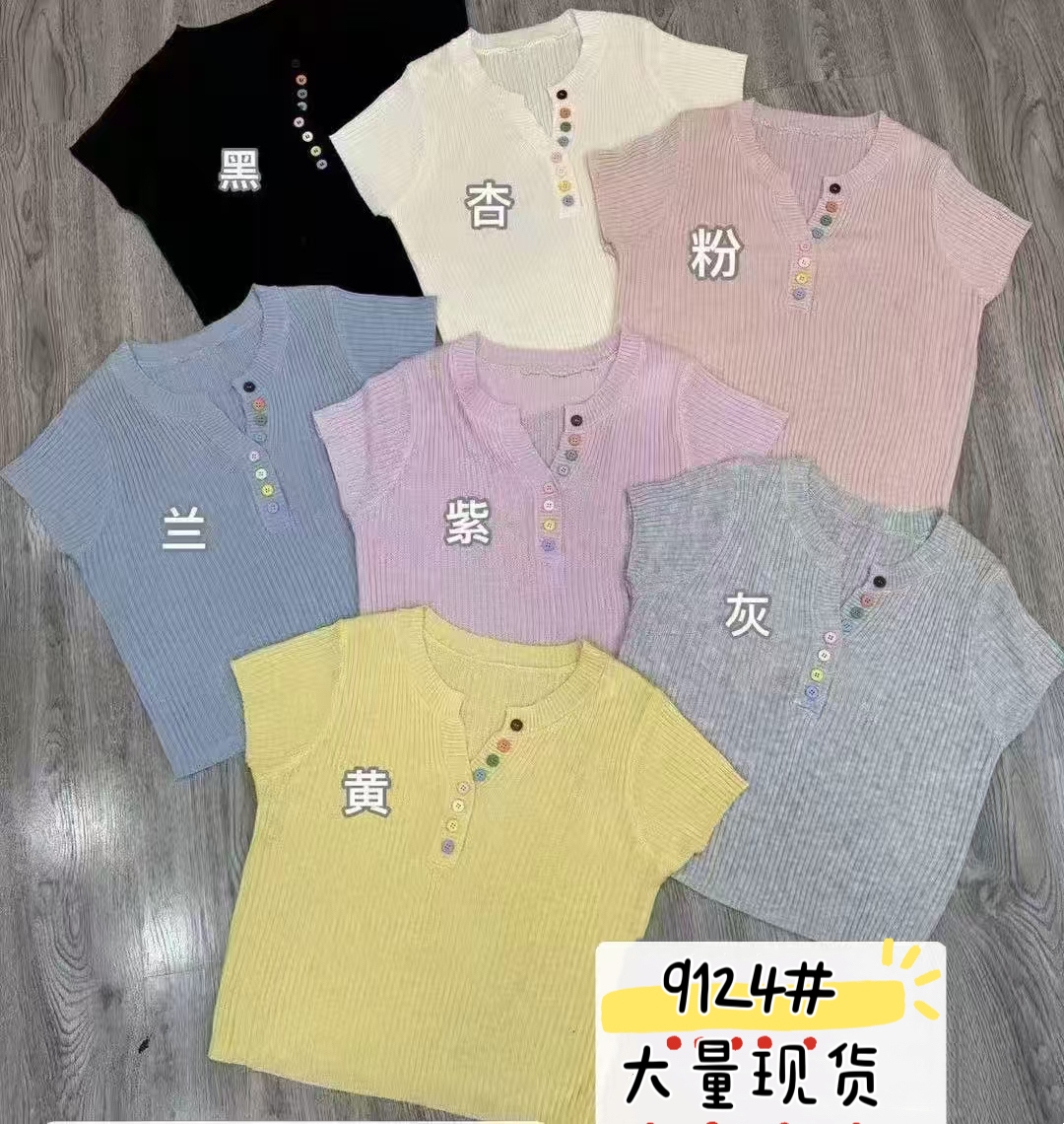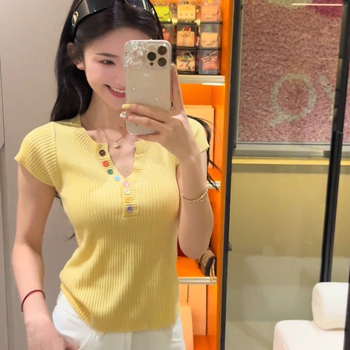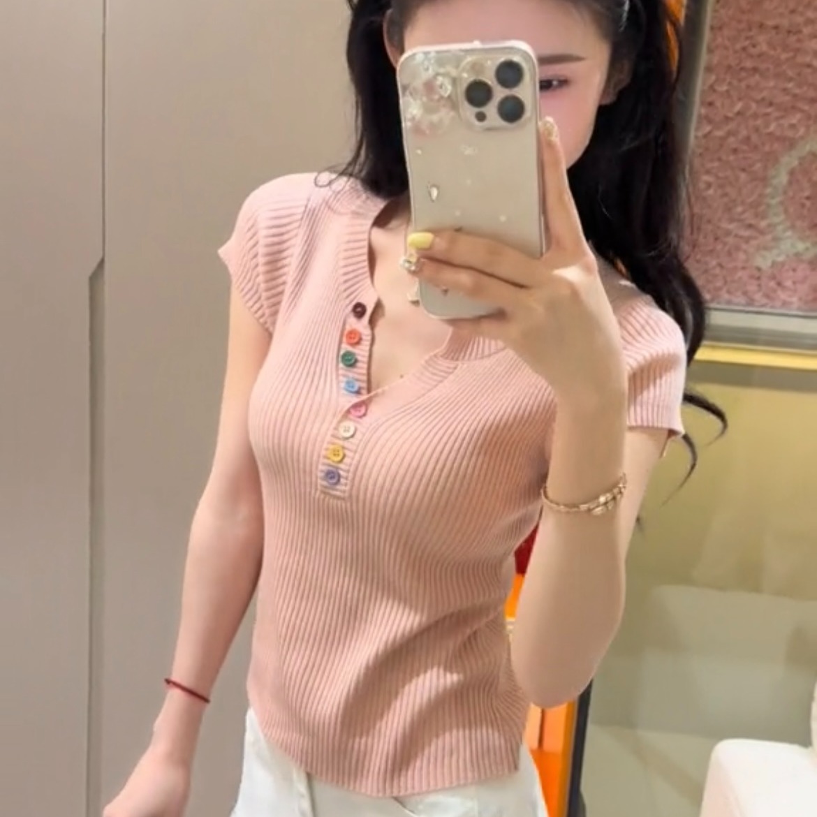 MY13782# 女裝貨源韩版彩色纽扣V领小香风针织衫夏新款减龄时尚别致显瘦上衣女裝貨源服裝批發服裝批發