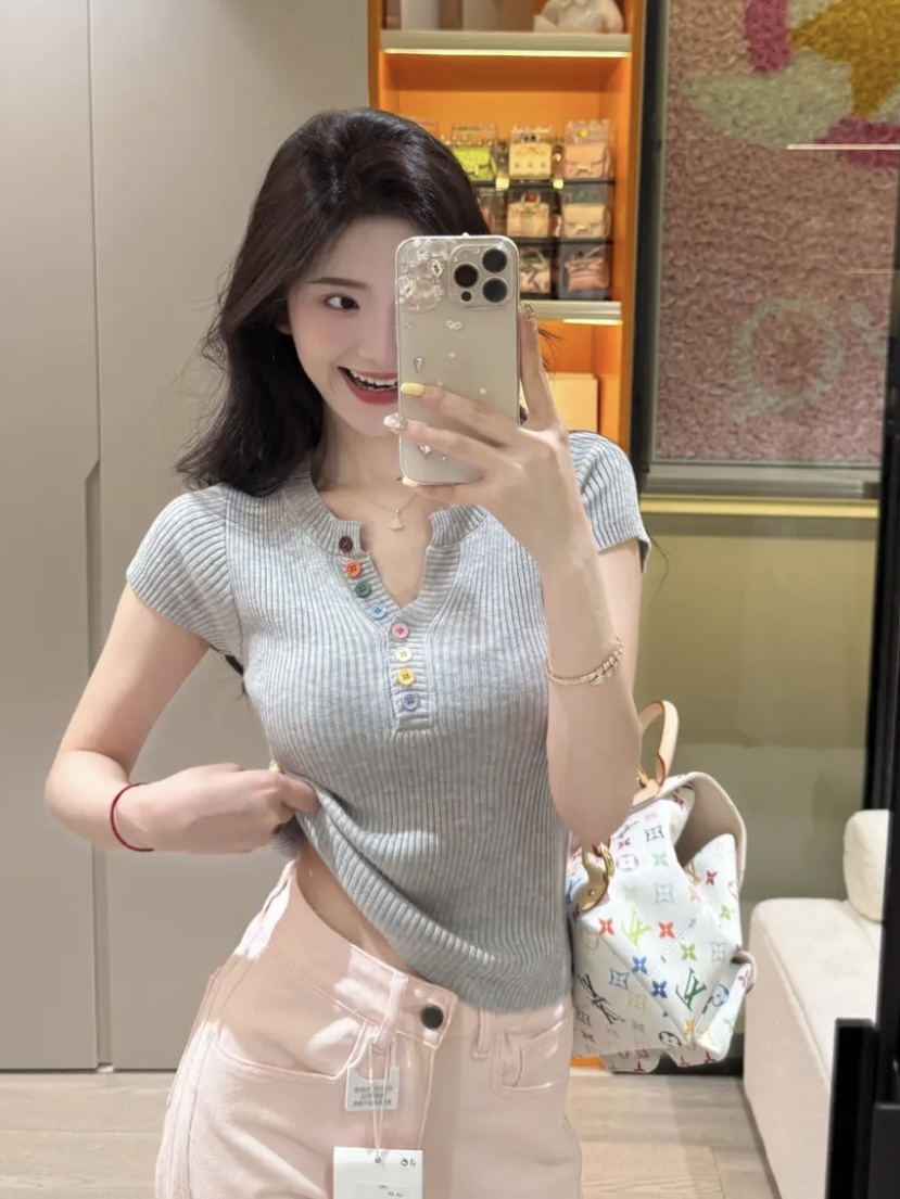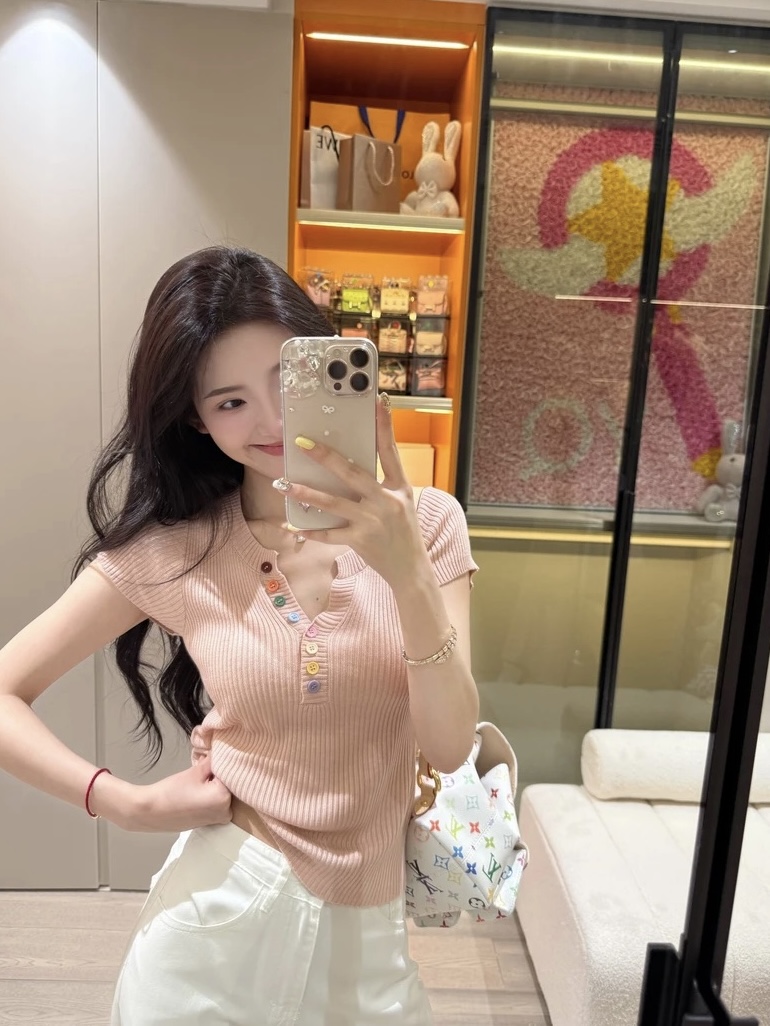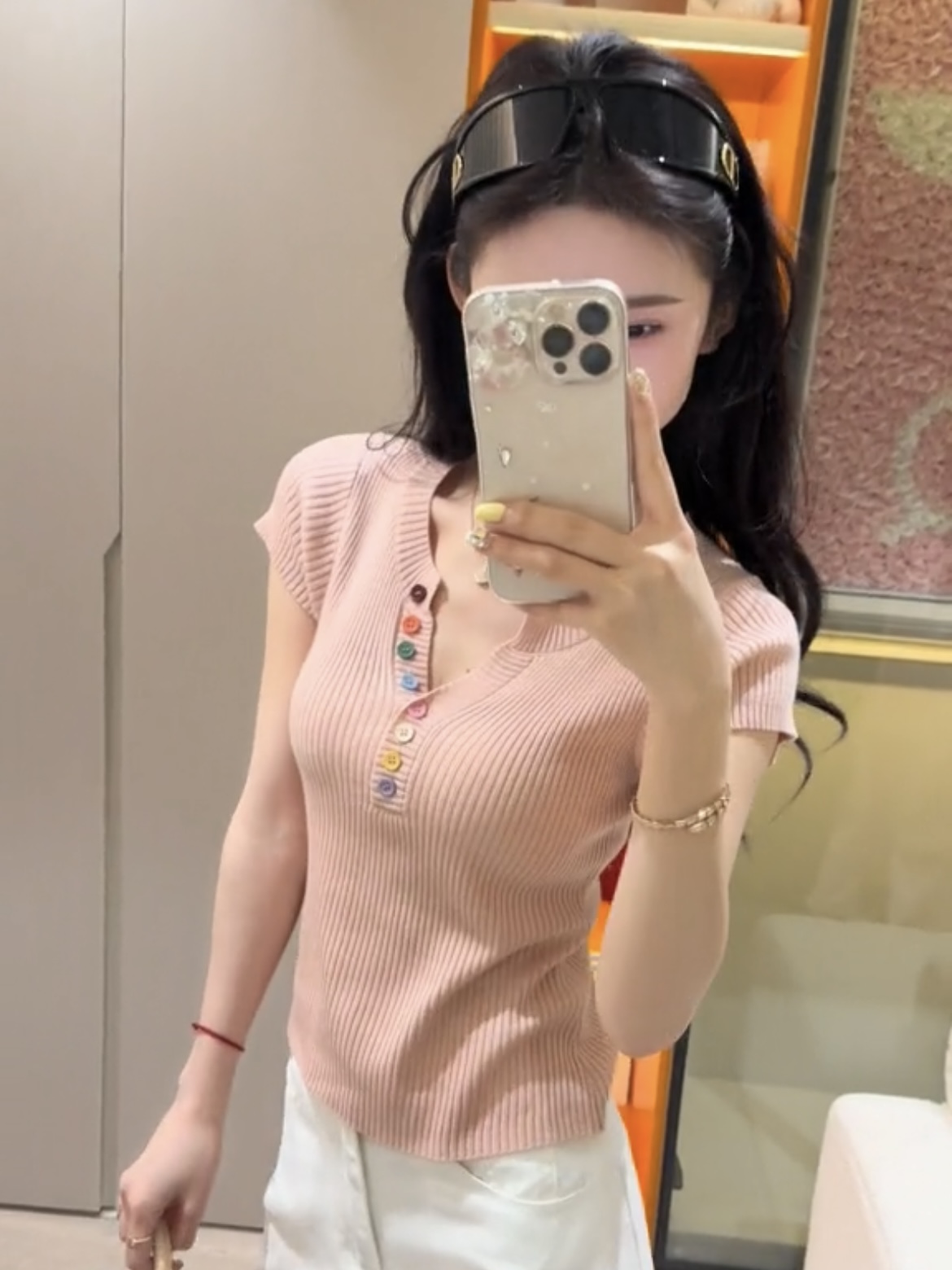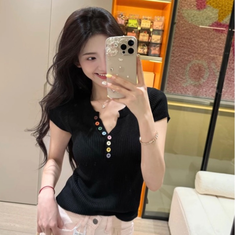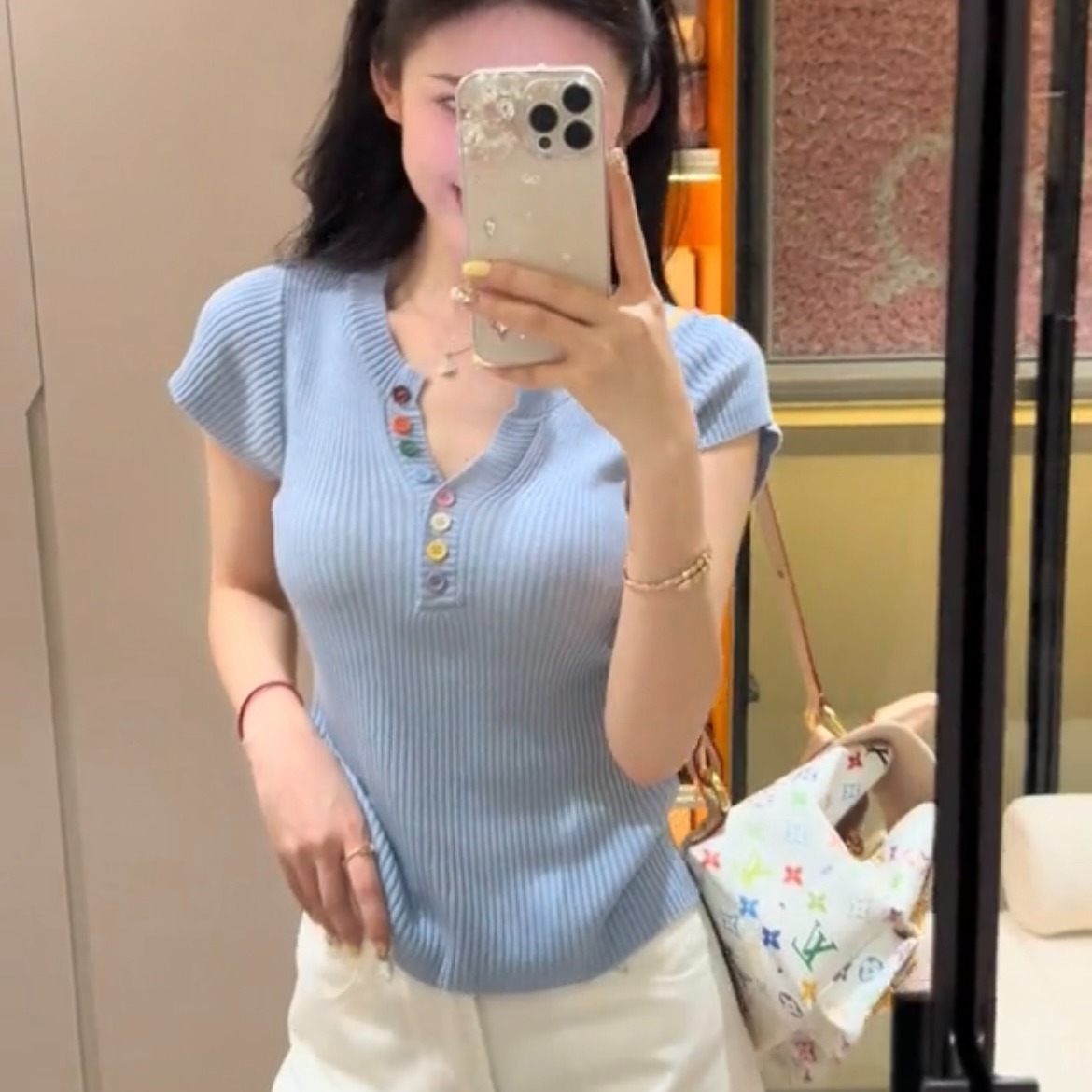 MY13782# 女裝貨源韩版彩色纽扣V领小香风针织衫夏新款减龄时尚别致显瘦上衣女裝貨源服裝批發服裝批發
